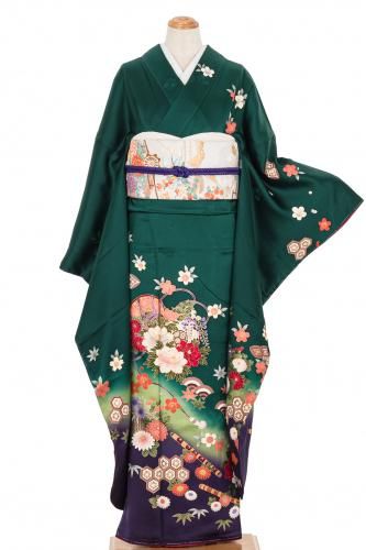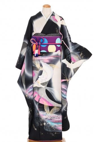 振袖 縮緬 水鳥に吹き寄せ文様 裄長