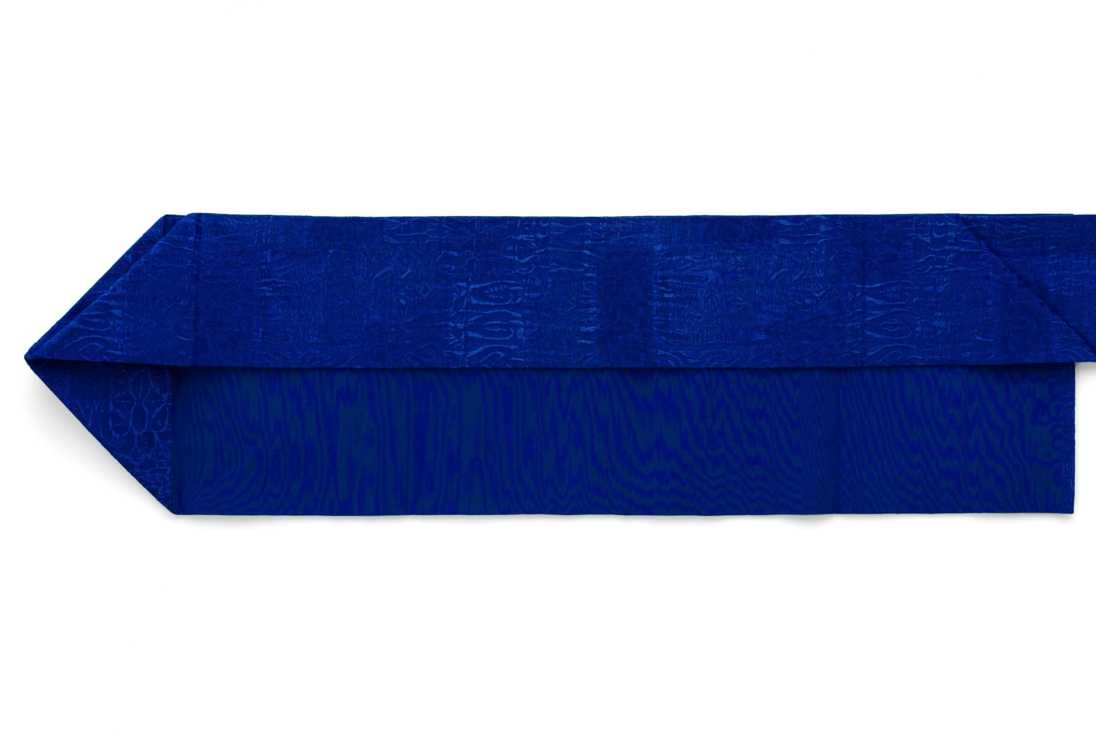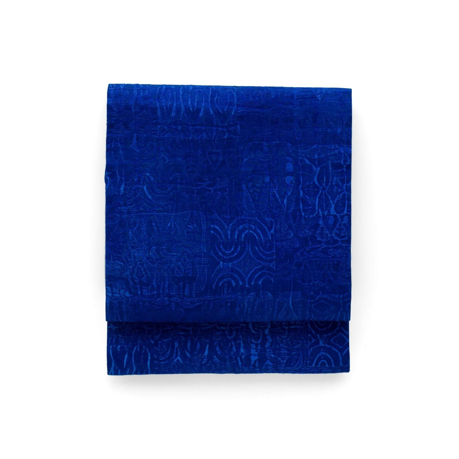 深いブルーの地に膨れ織りの幾何学柄が仄かに浮かび上がる九寸名古屋帯です。