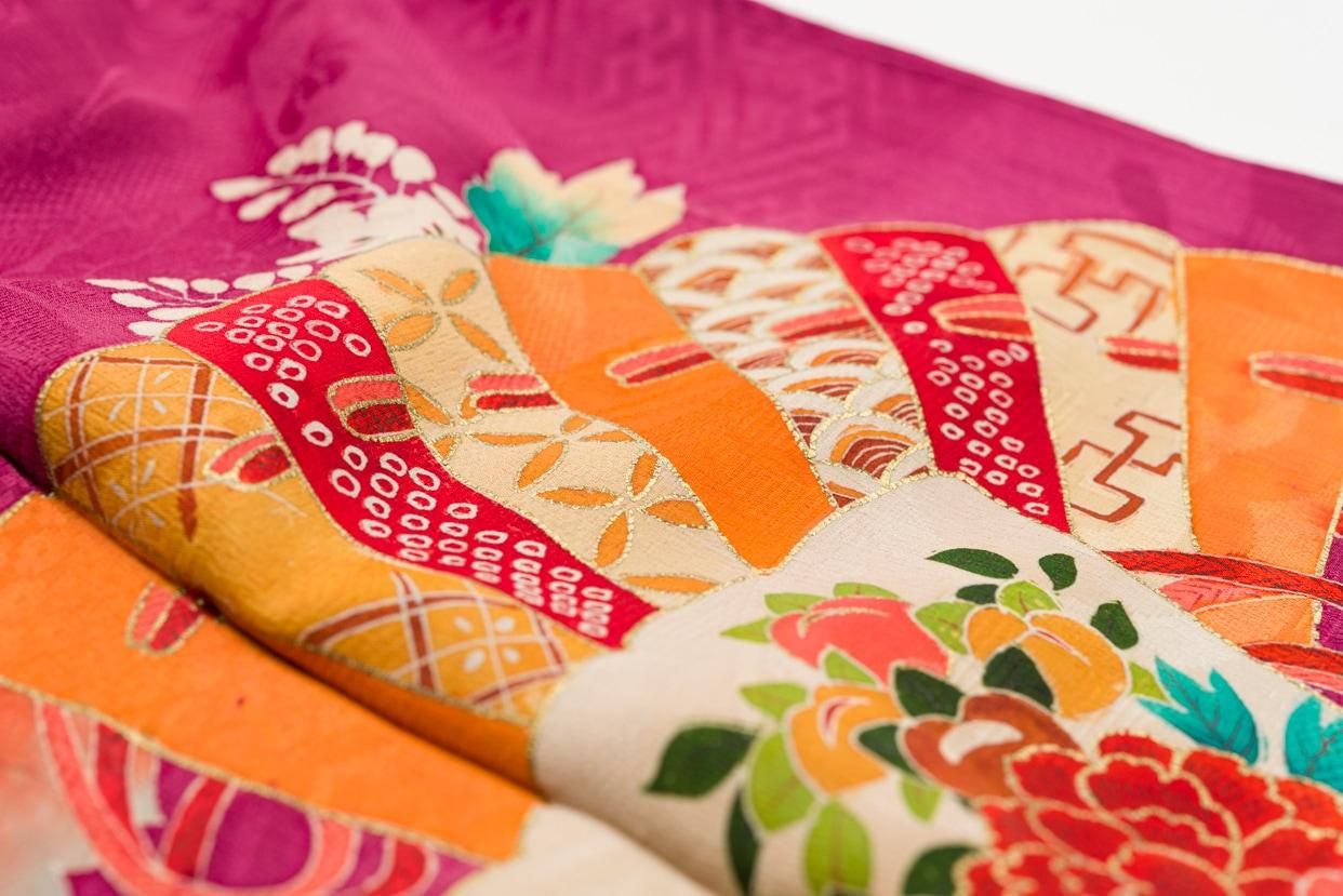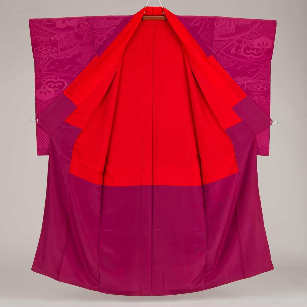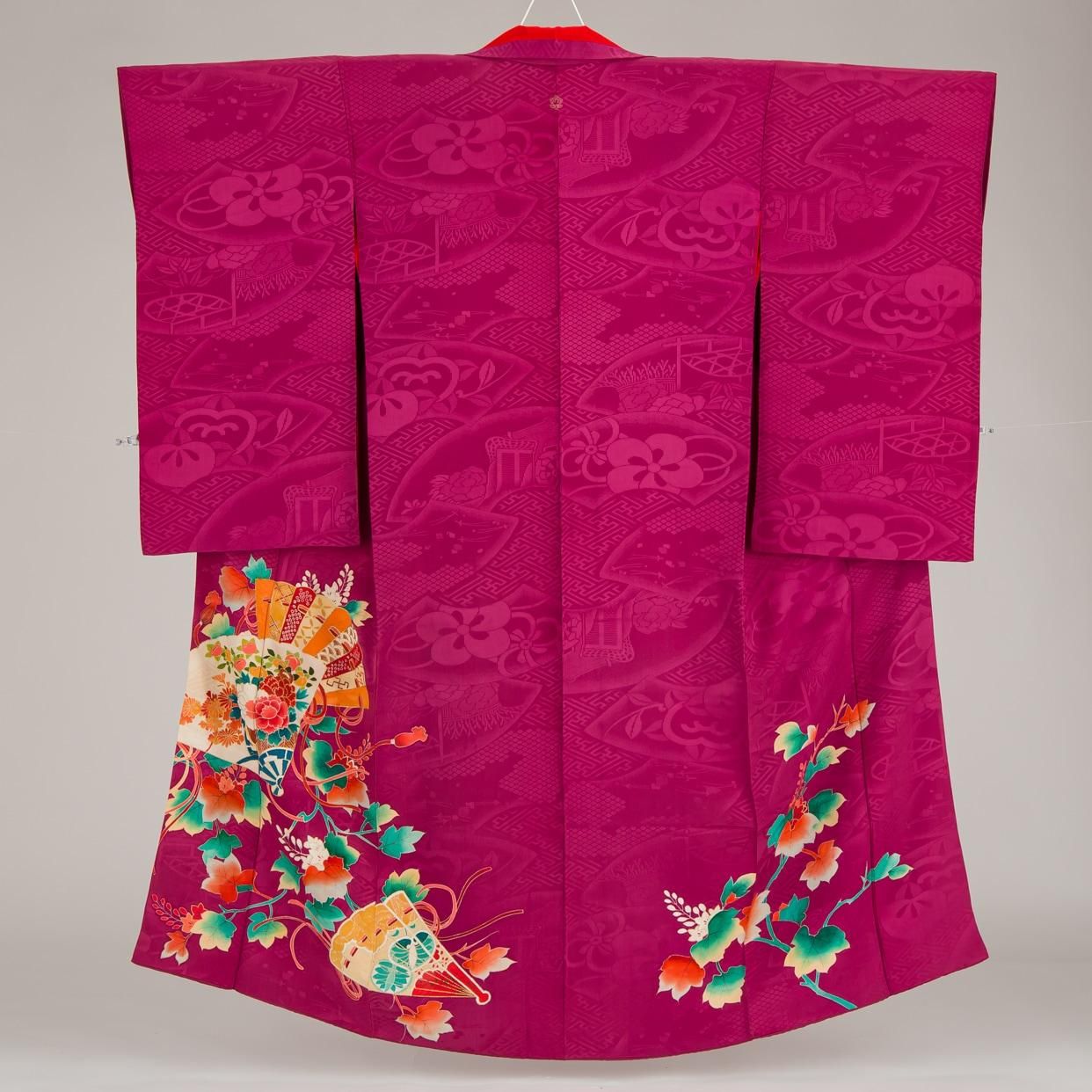 鮮やかなマゼンタピンクの地に檜扇と桐を描いたアンティークの色留袖です。
