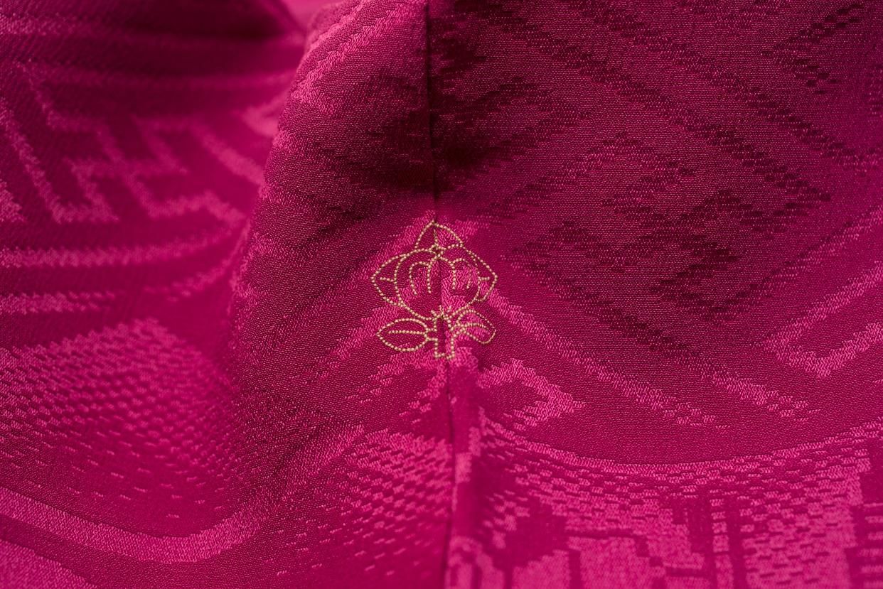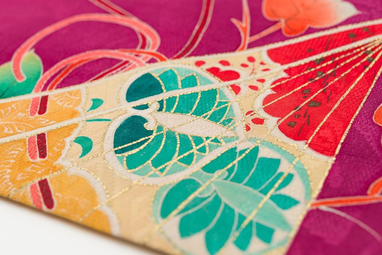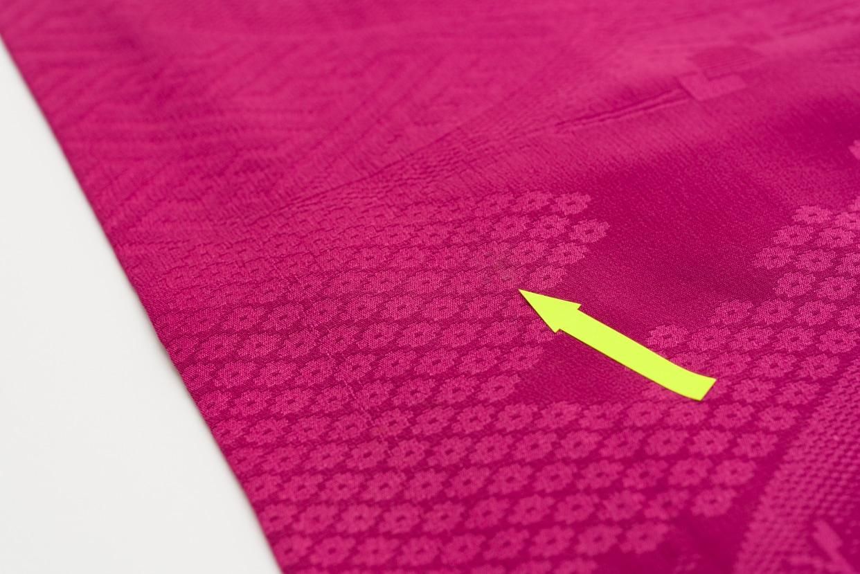 鮮やかなマゼンタピンクの地に檜扇と桐を描いたアンティークの色留袖です。