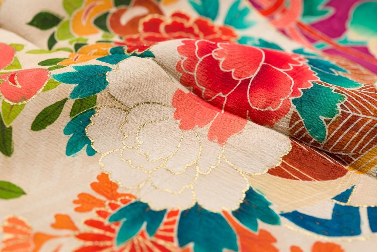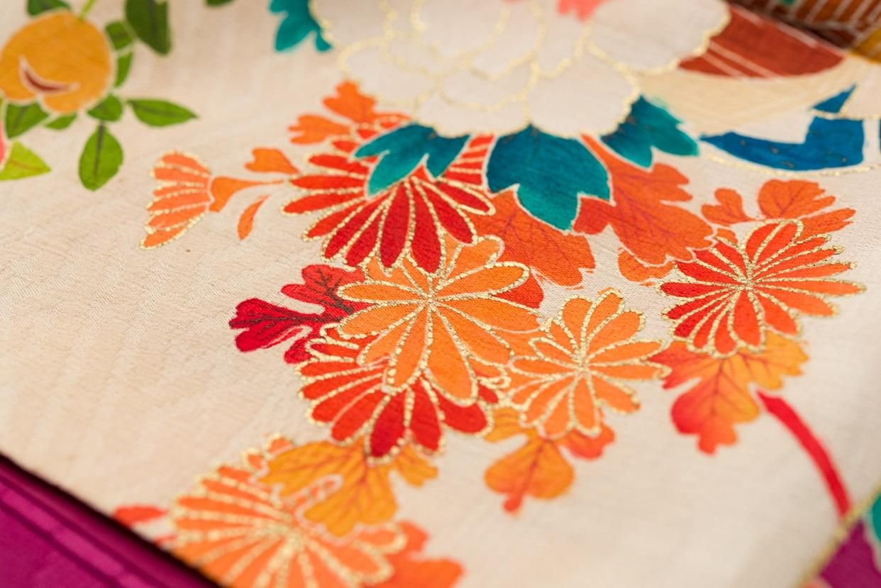 扇には牡丹、橘、菊などを満載にした花車や葵の葉など古典的で華やかな柄が添えられています。