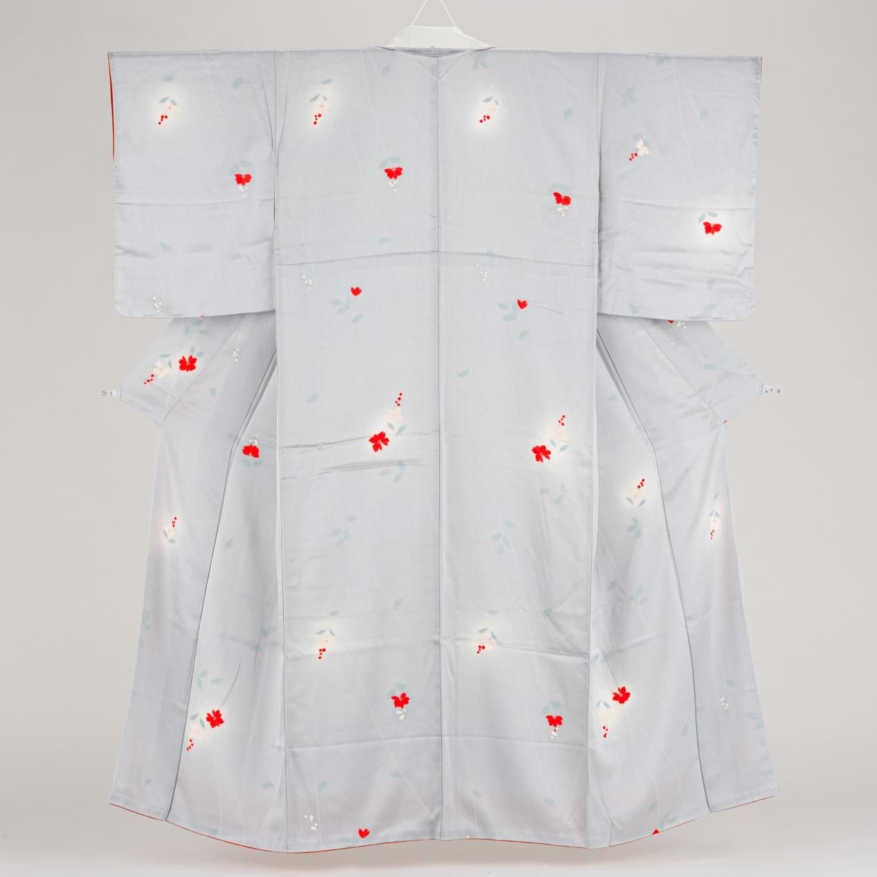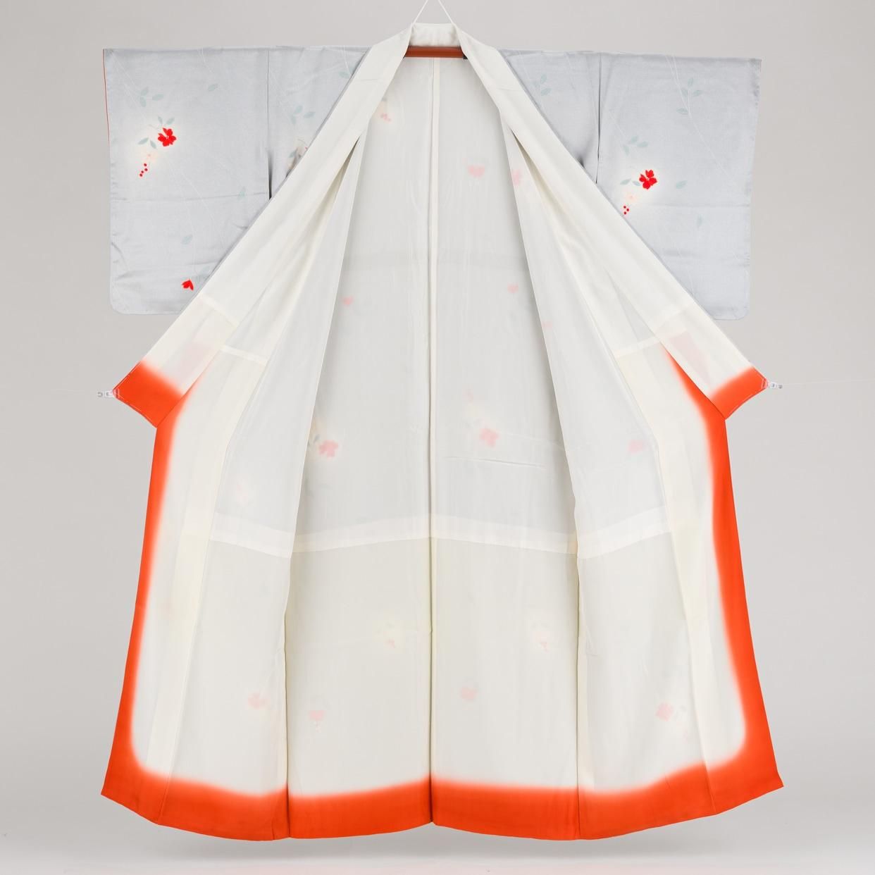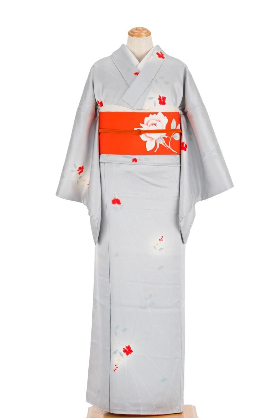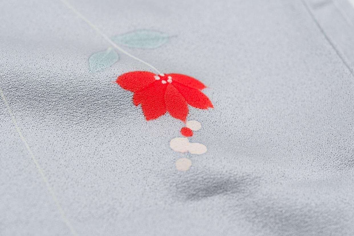 淡いグレーの地に白と朱赤の花を染めた小紋の着物です。