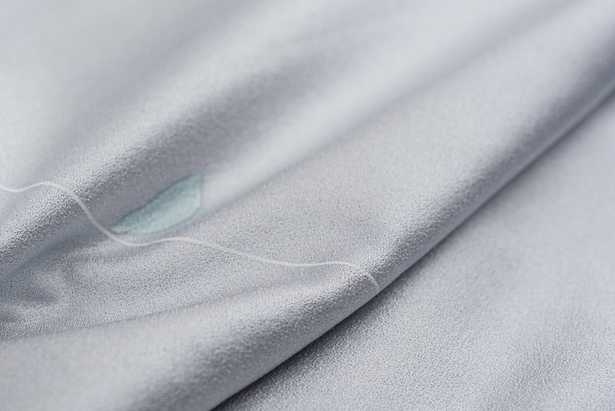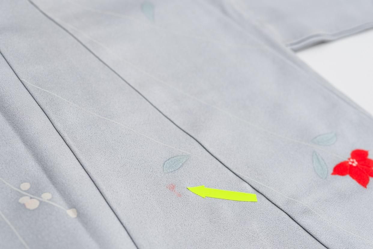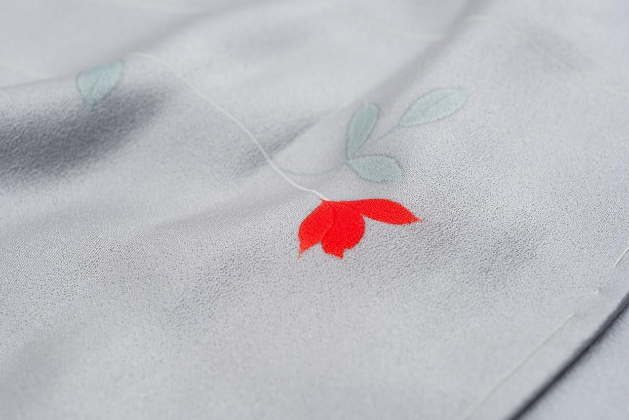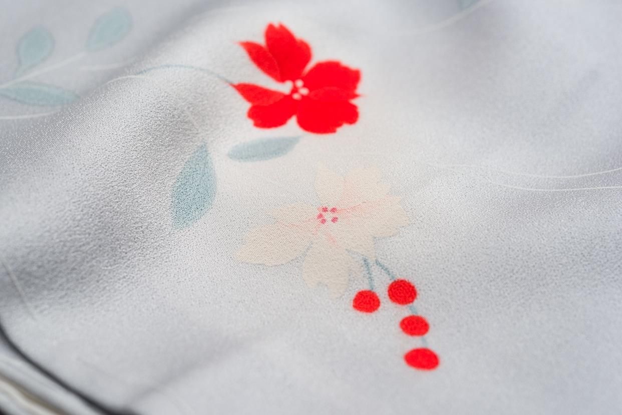 淡いグレーの地に白と朱赤の花を染めた小紋の着物です。