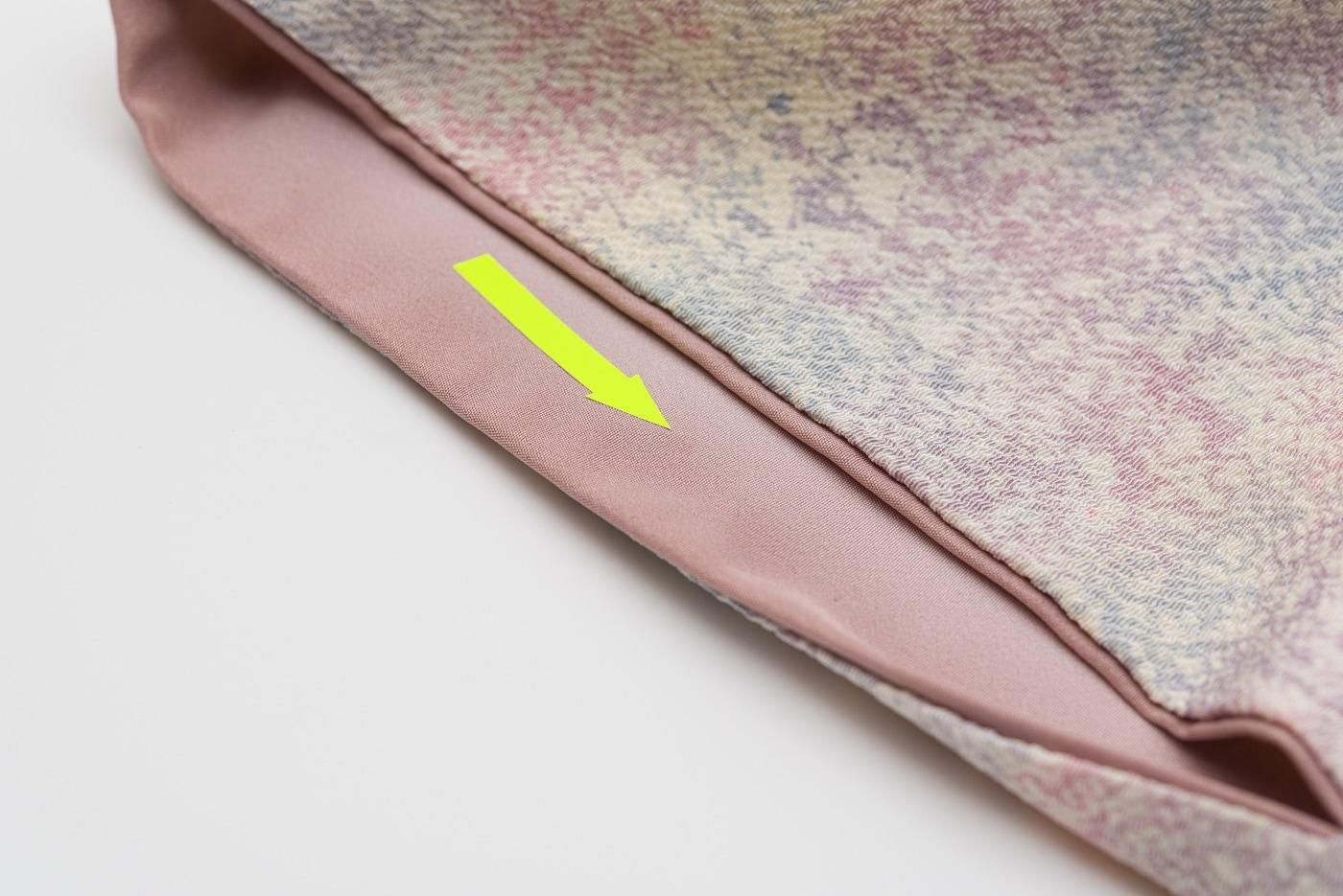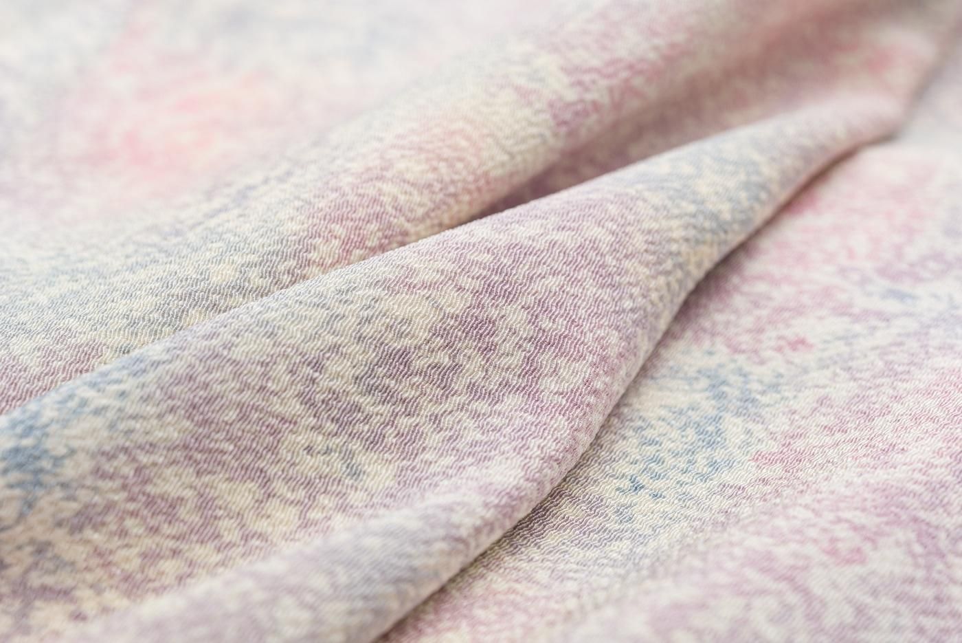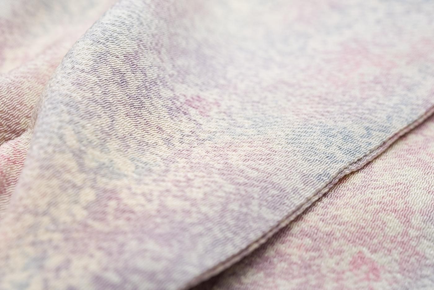 白、赤紫、灰青を斑に染めた縮緬地の小紋です。