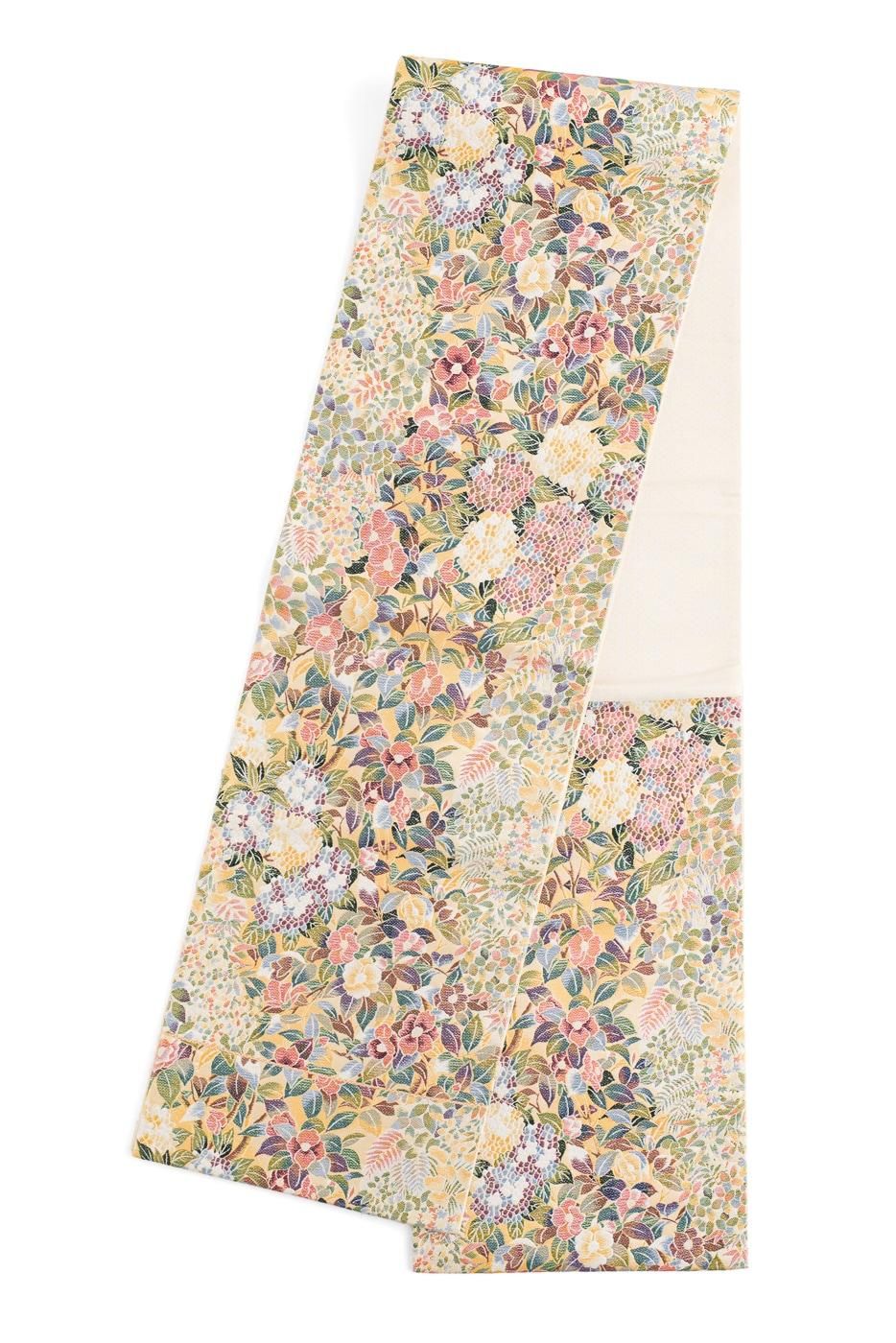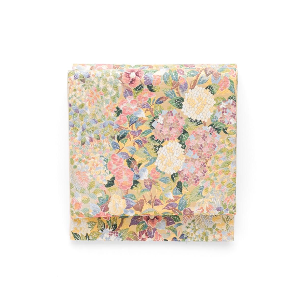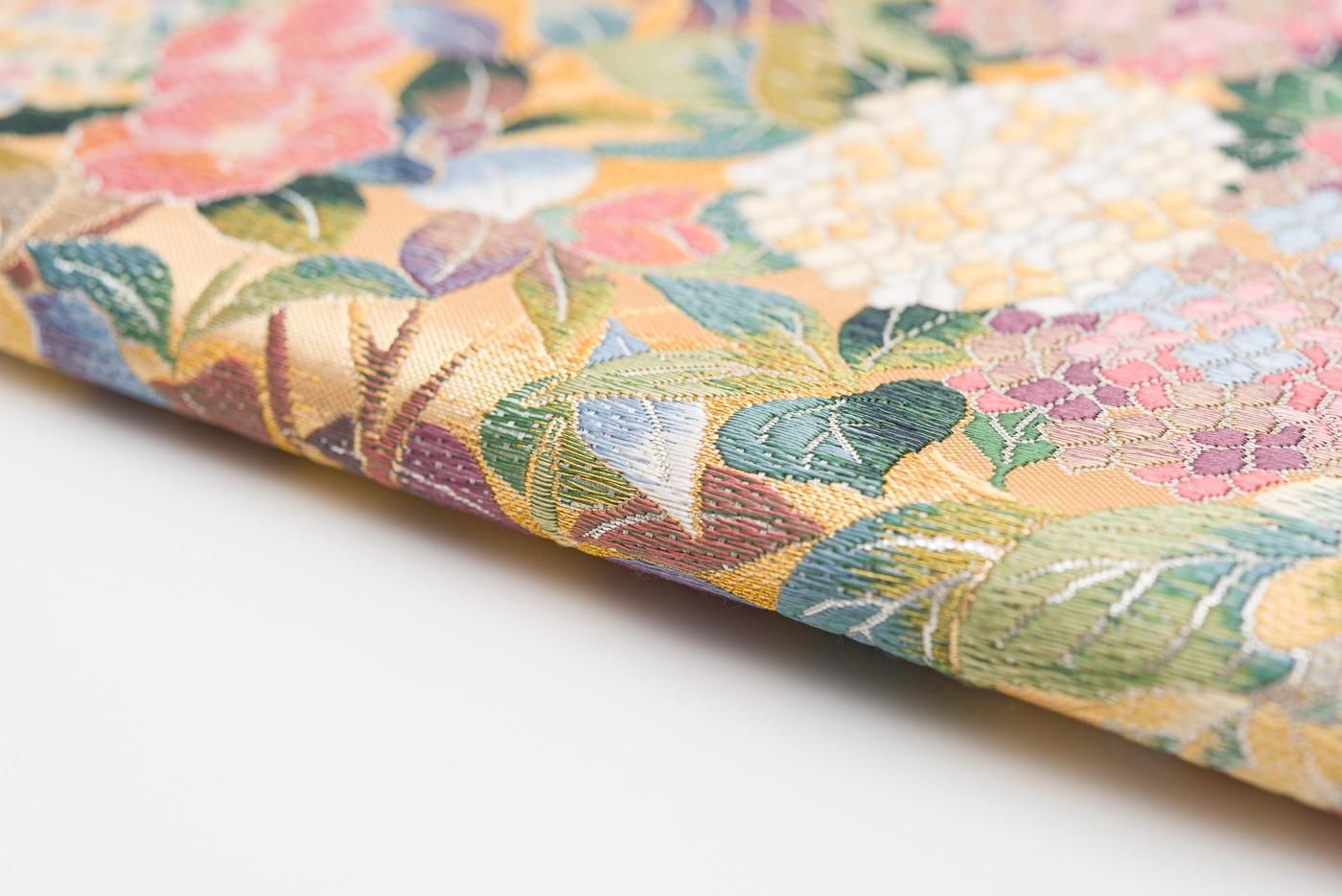紫陽花や椿の花を色鮮やかに織り出した袋帯です。