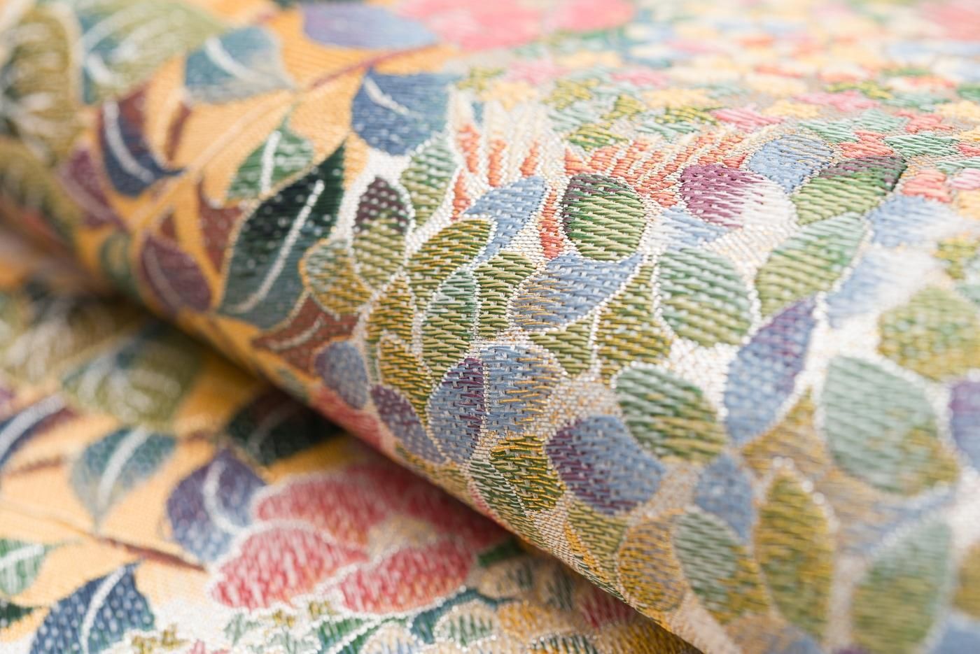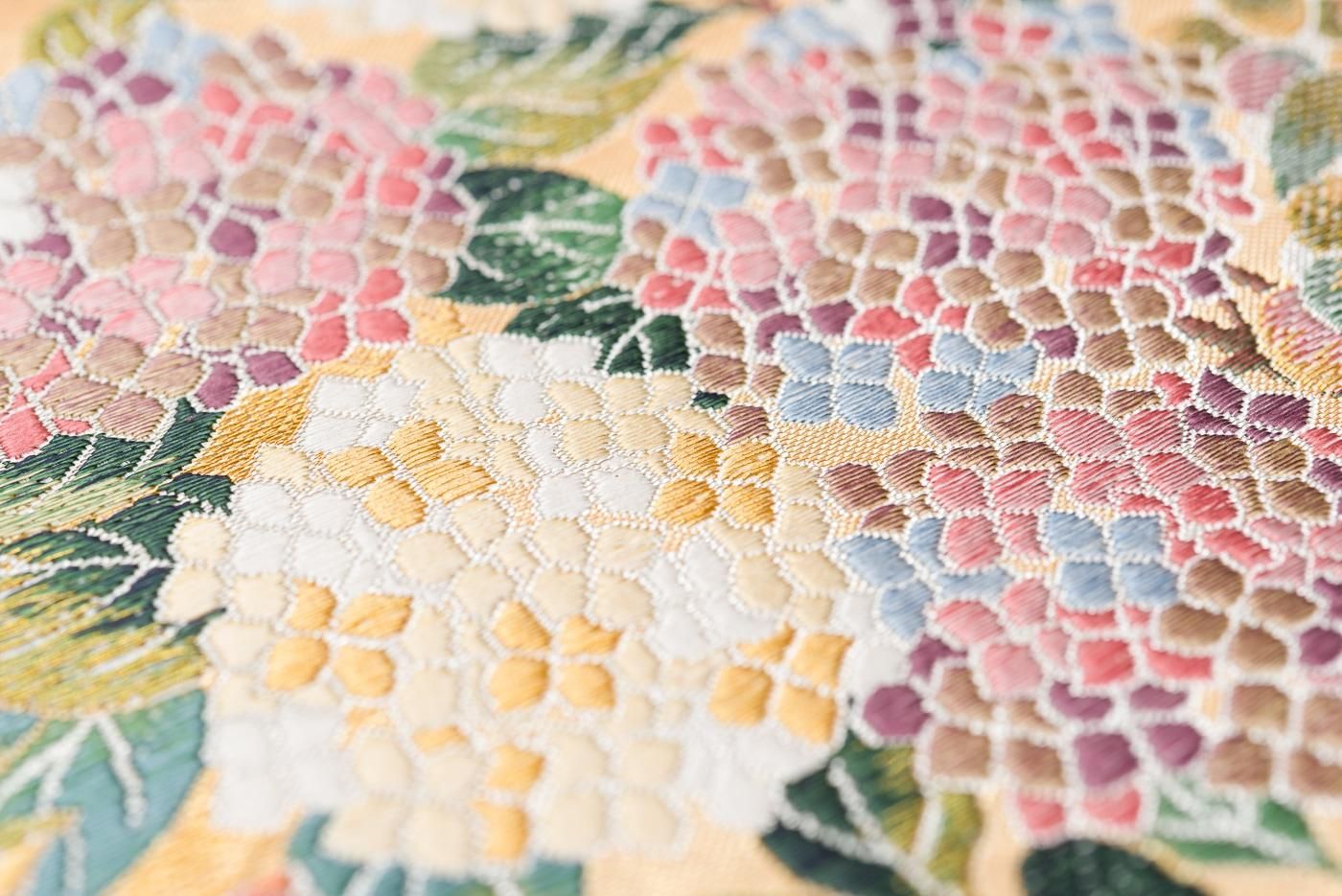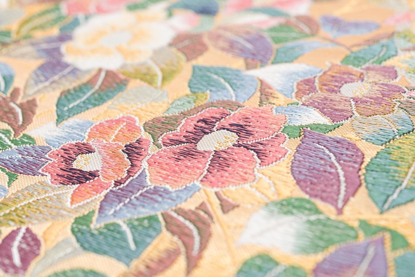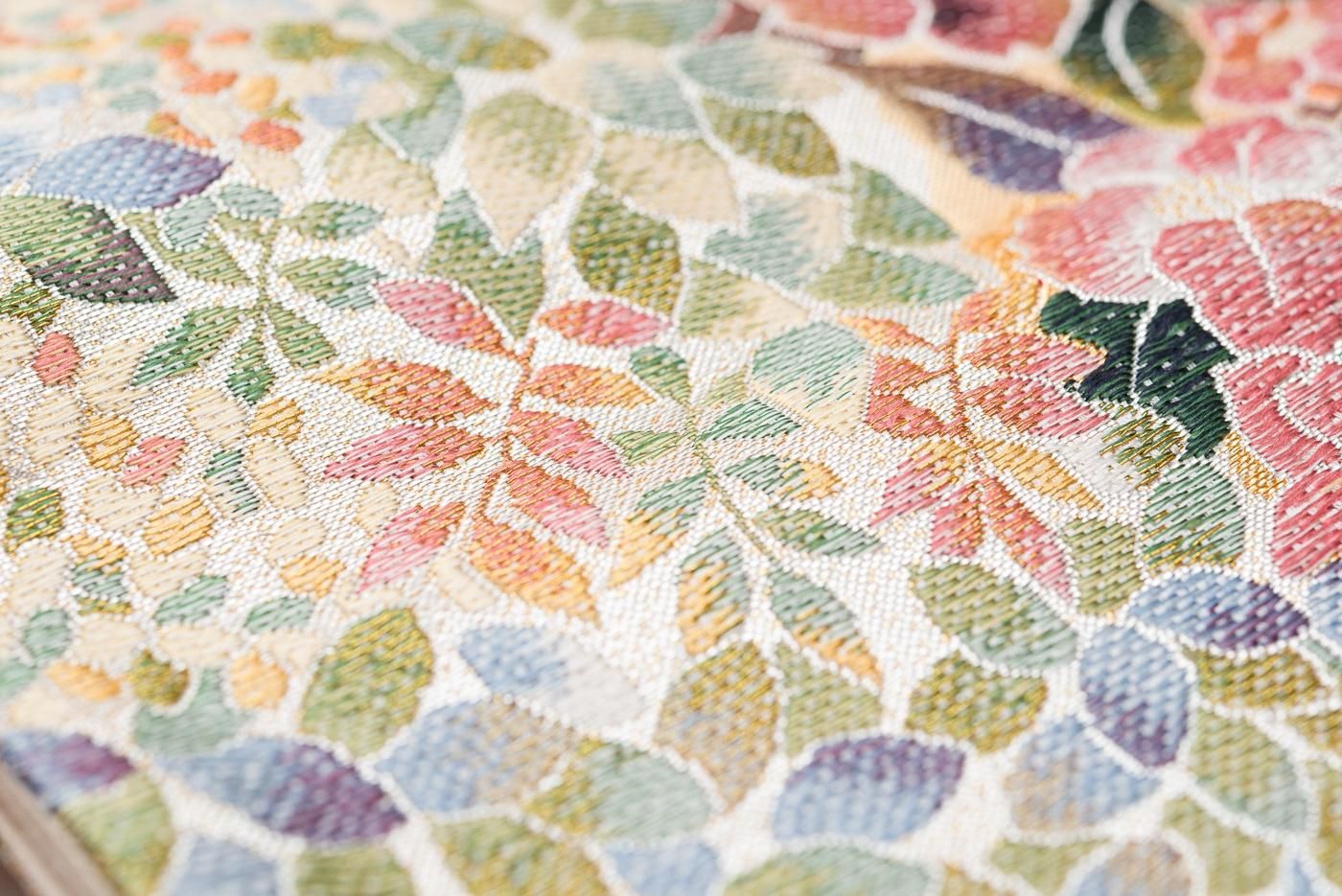 紫陽花や椿の花を色鮮やかに織り出した袋帯です。