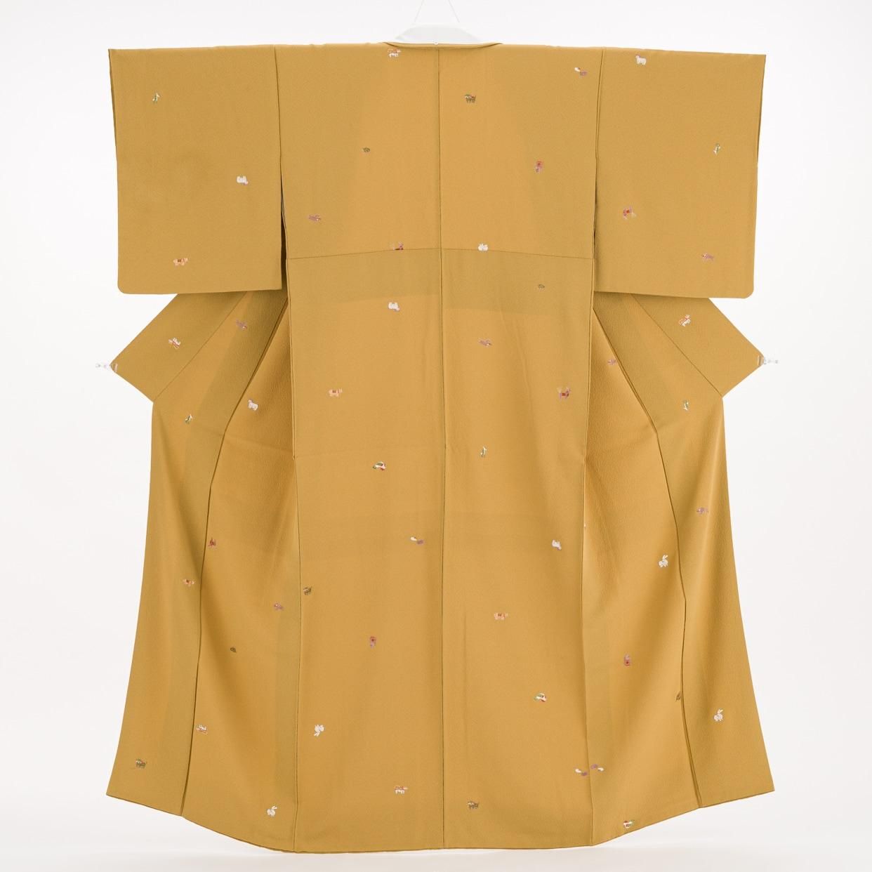 黄土色の地に干支のモチーフを刺繍した小紋の着物です。