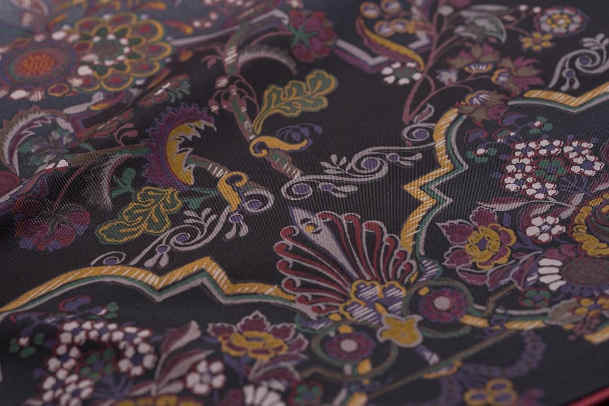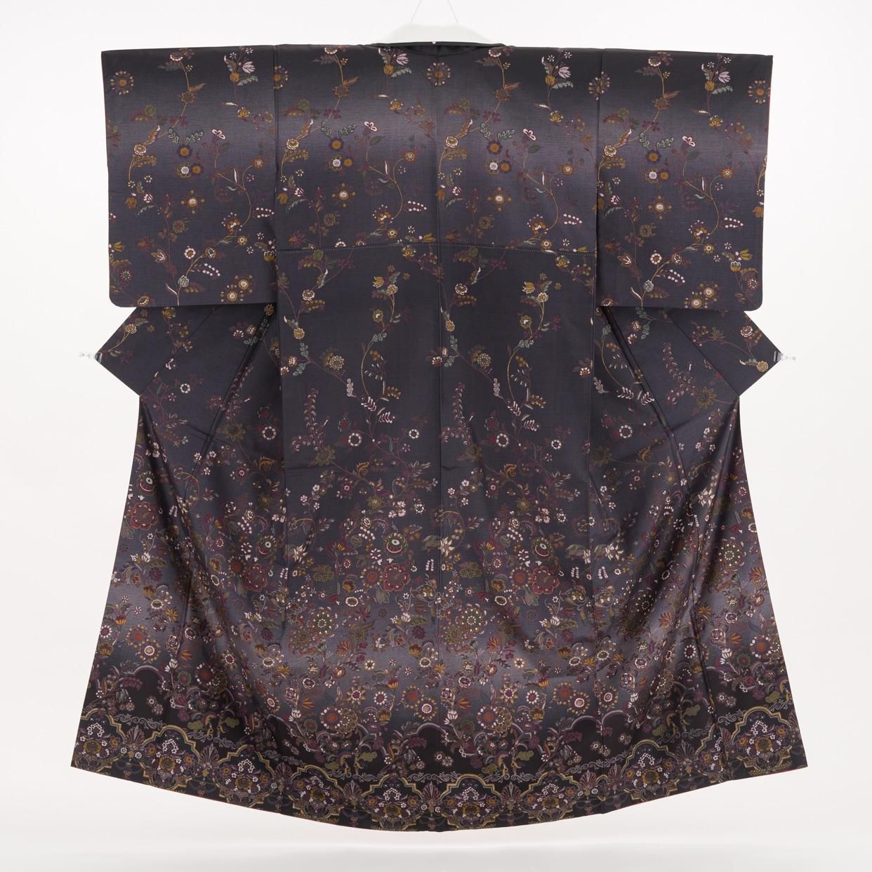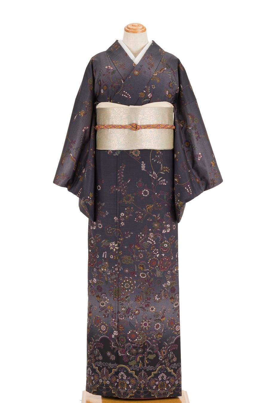 墨黒の暈しに緻密な唐花紋を染めた大島紬の訪問着です。