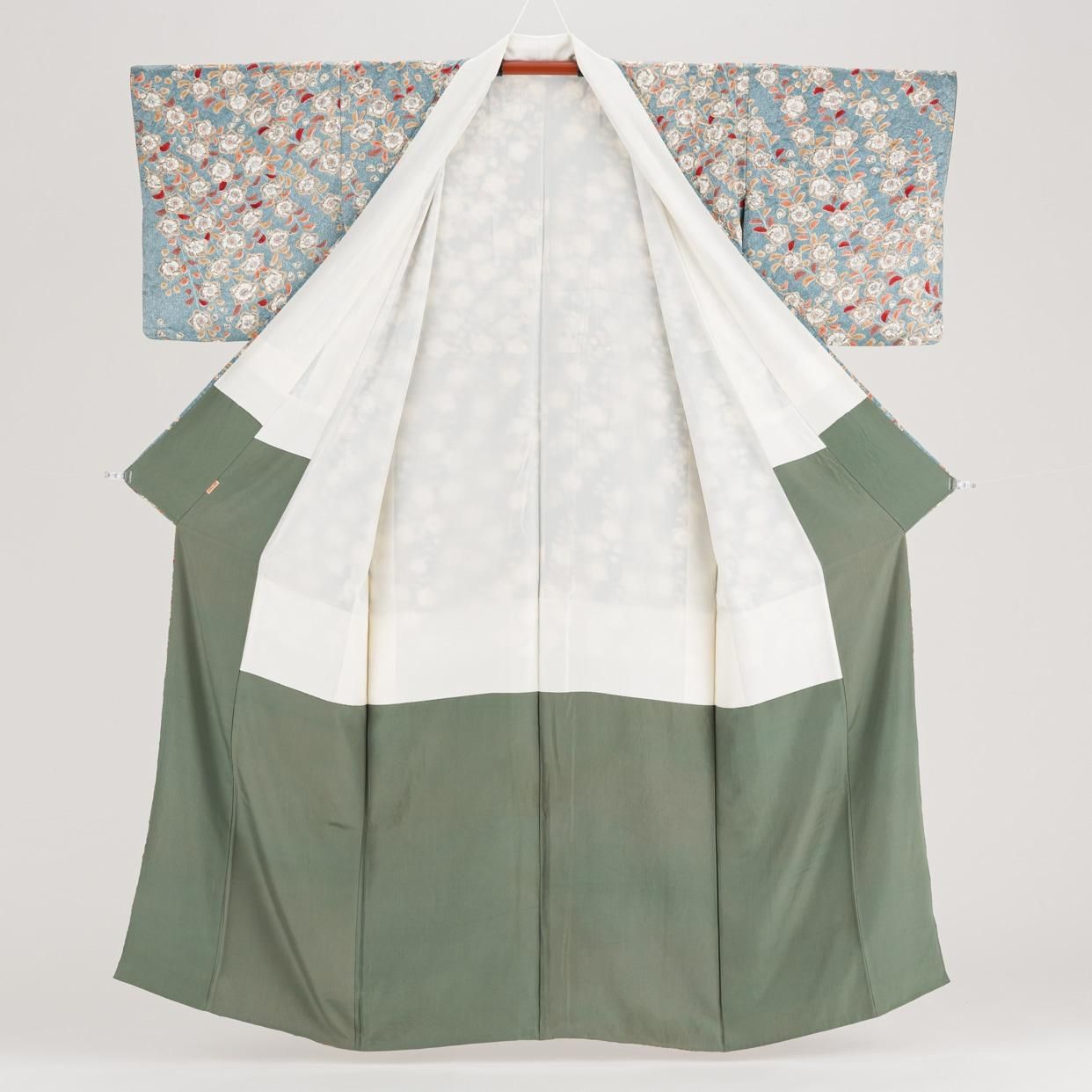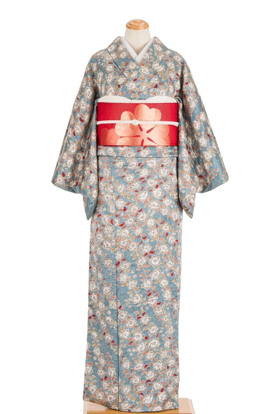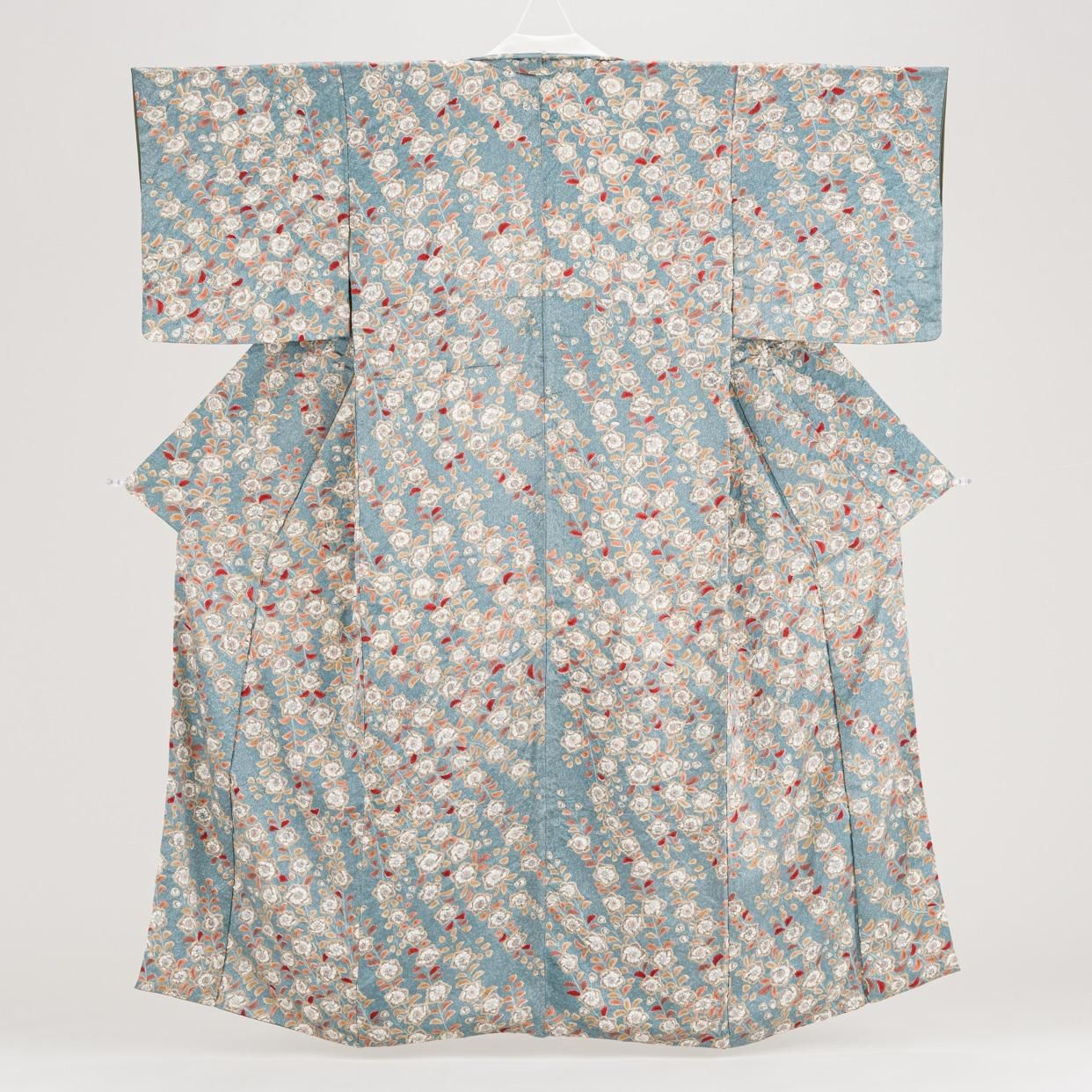 すっきりとした縹色の地に辻が花模様を染めた小紋の着物です。
