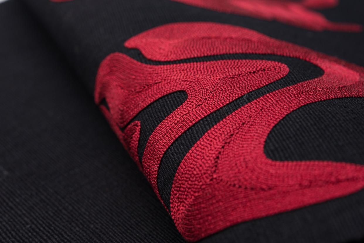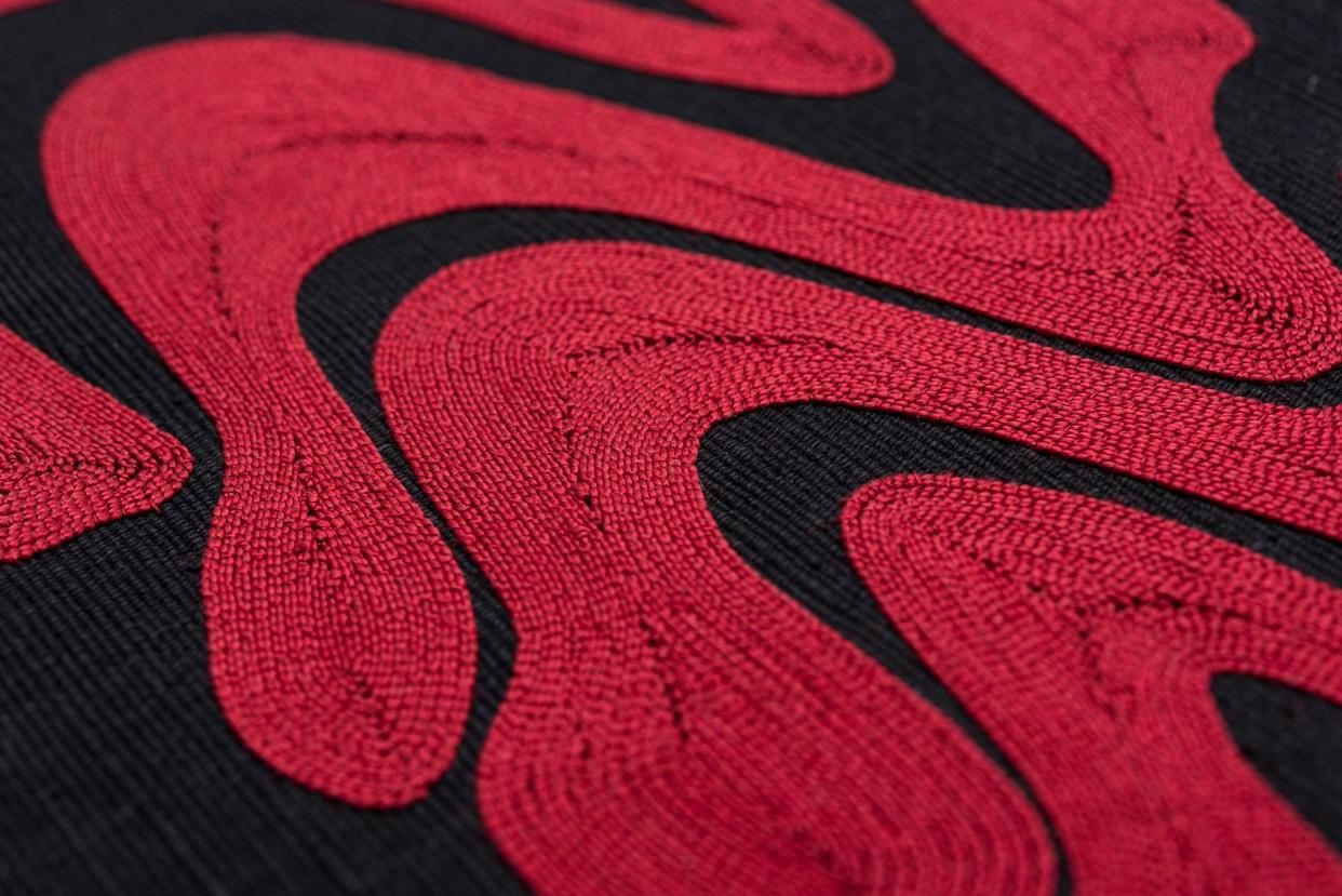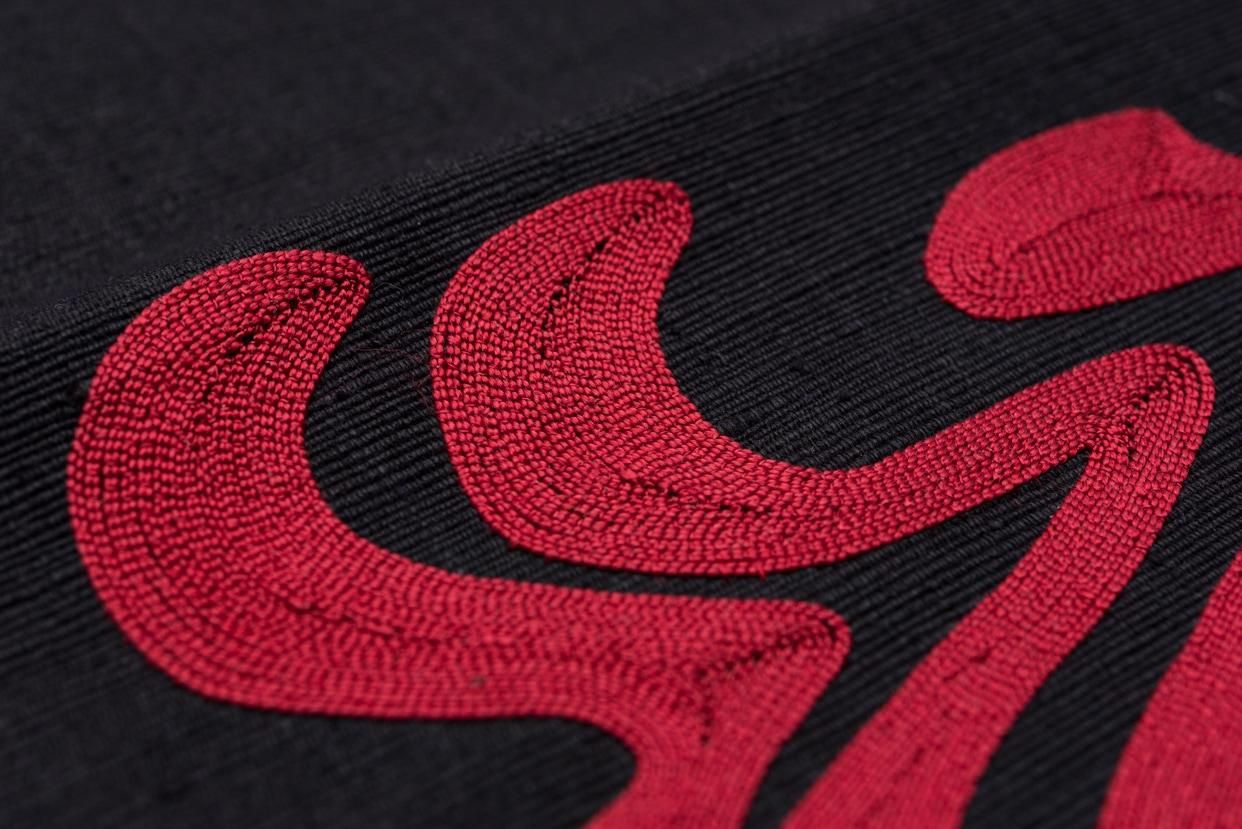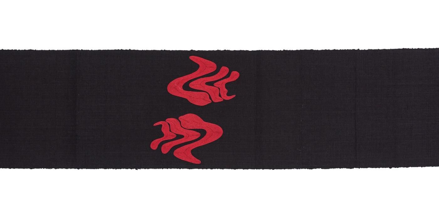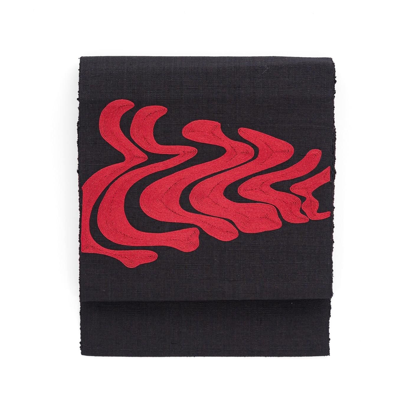 黒地に赤でにょろにょろとした曲線を織り出した紬地の八寸名古屋帯です。