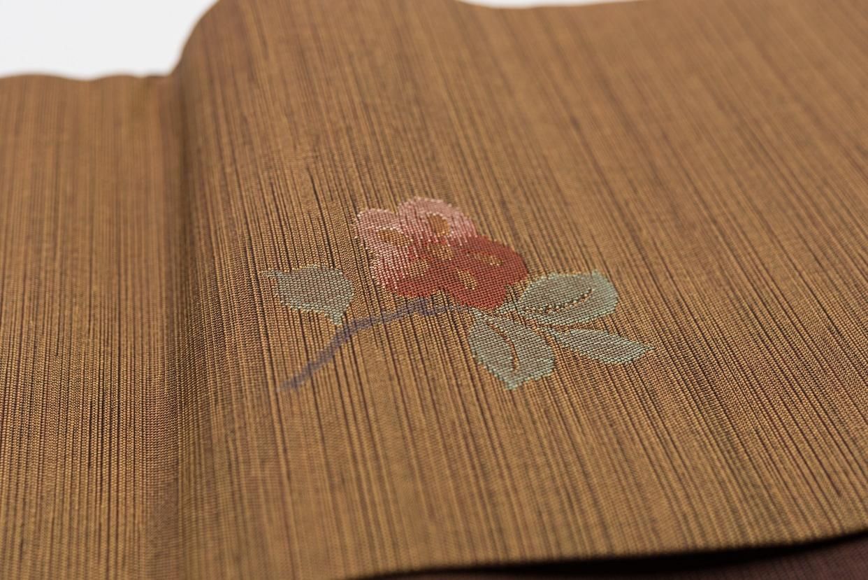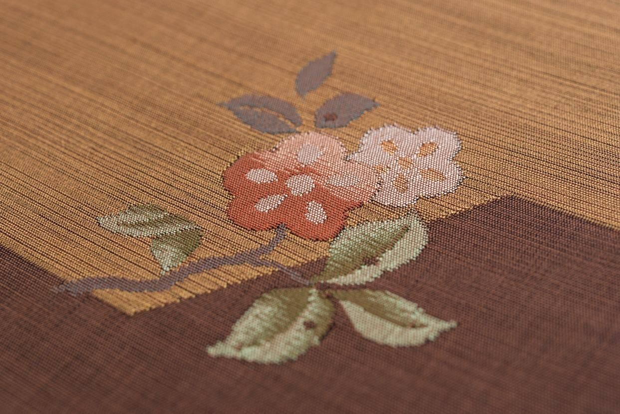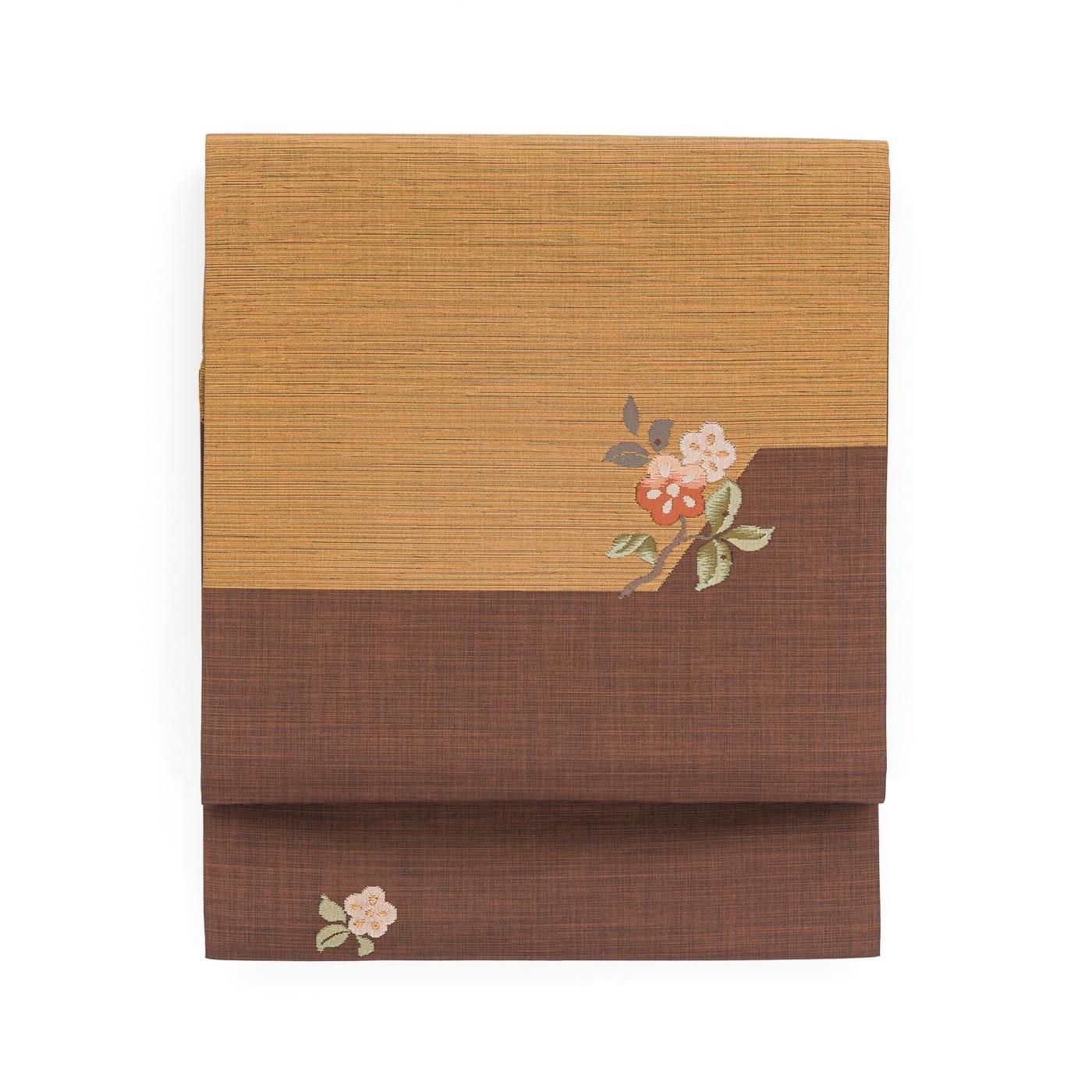 明るい茶と濃茶のツートンカラーに小花を添えた紬地の九寸名古屋帯です。