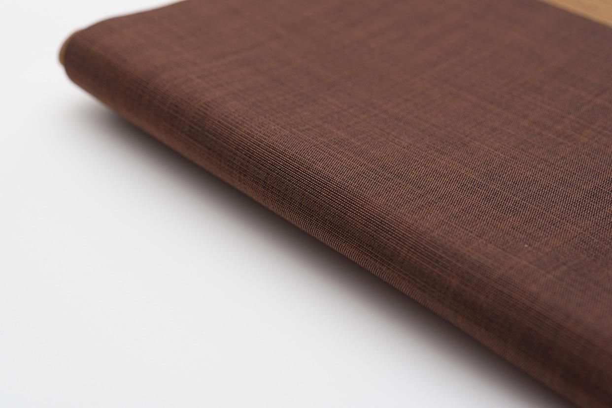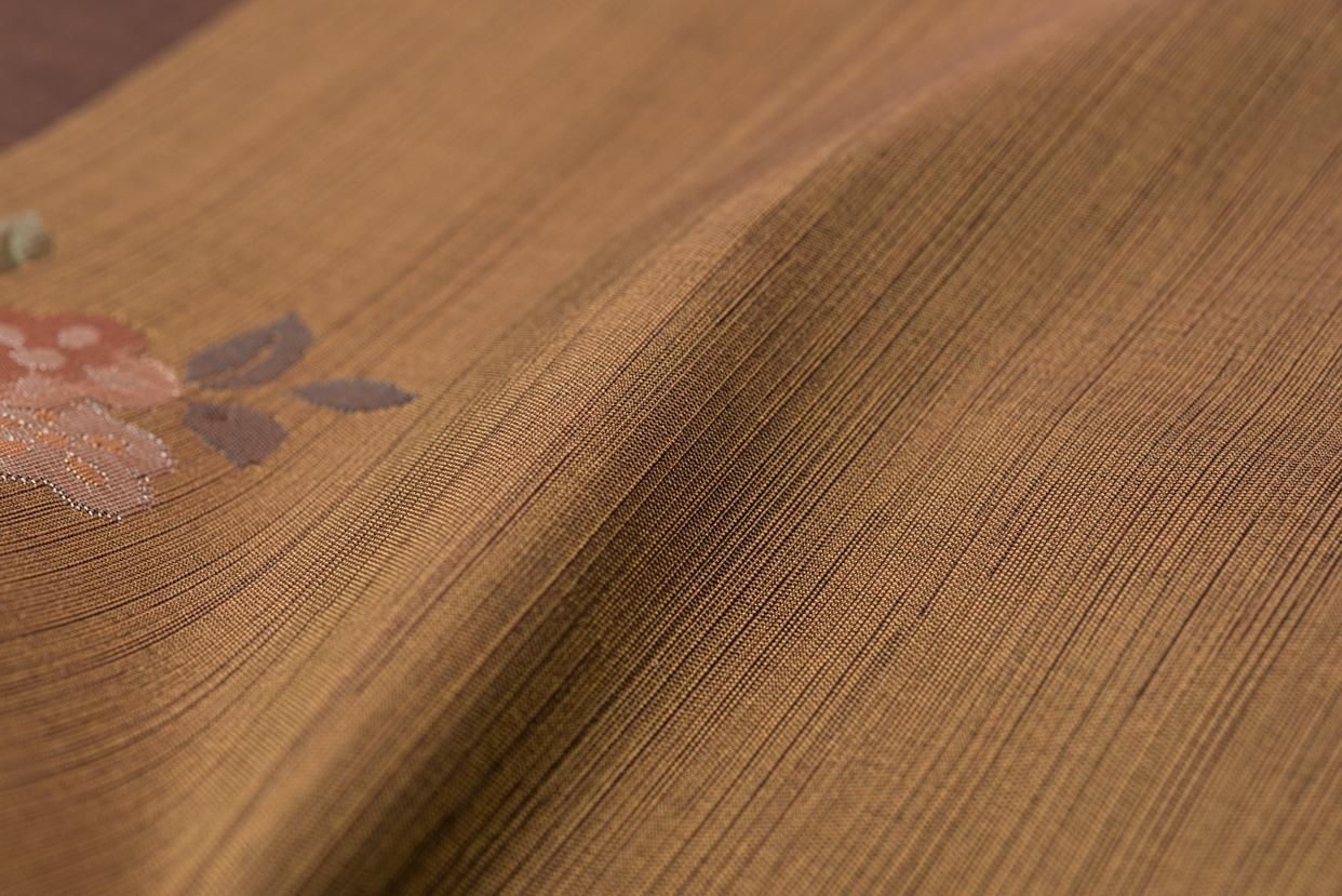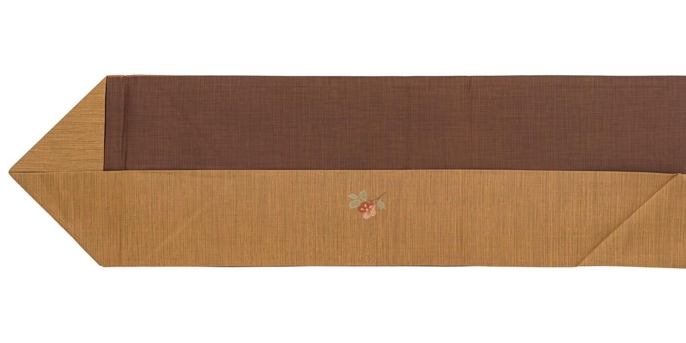 明るい茶と濃茶のツートンカラーに小花を添えた紬地の九寸名古屋帯です。