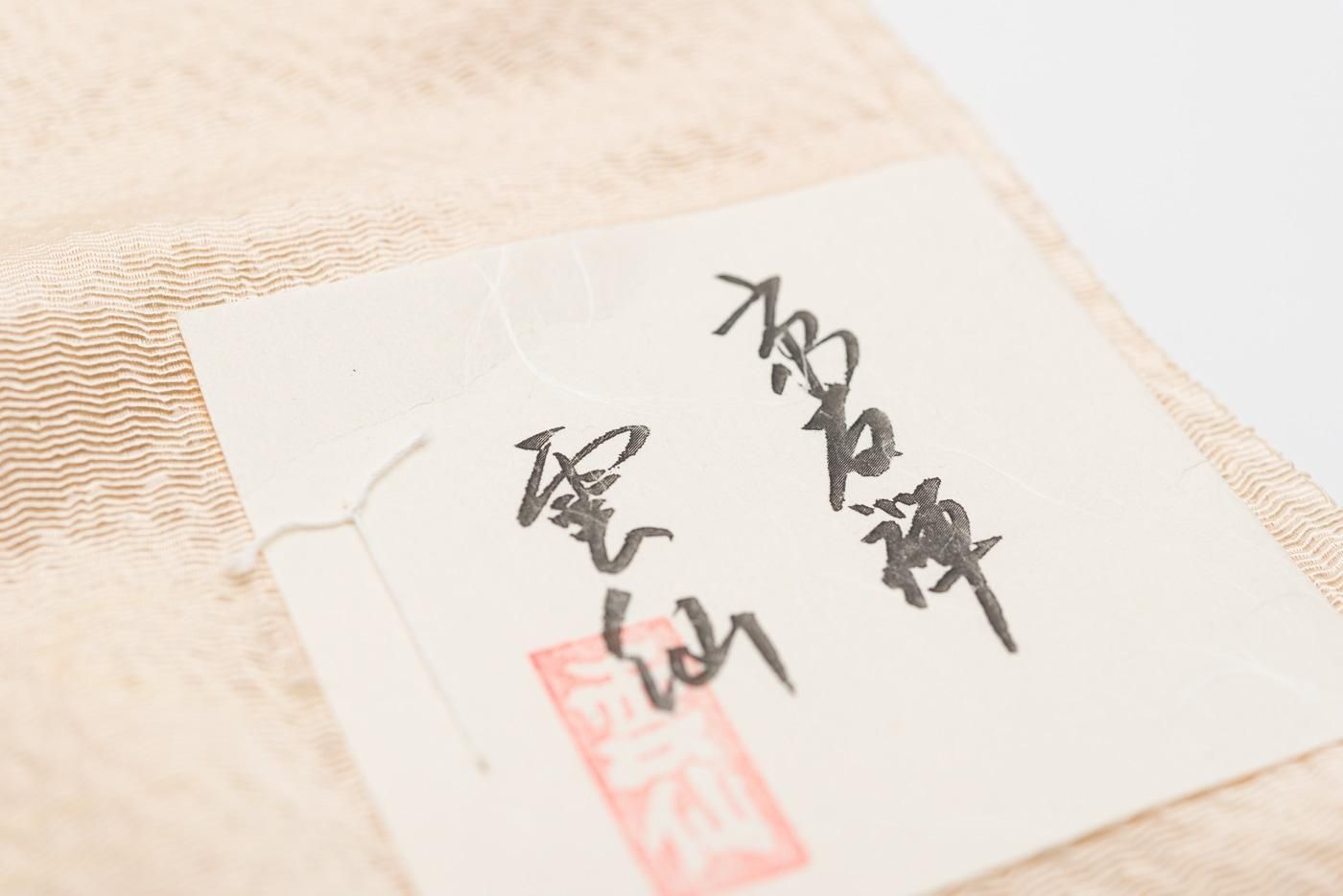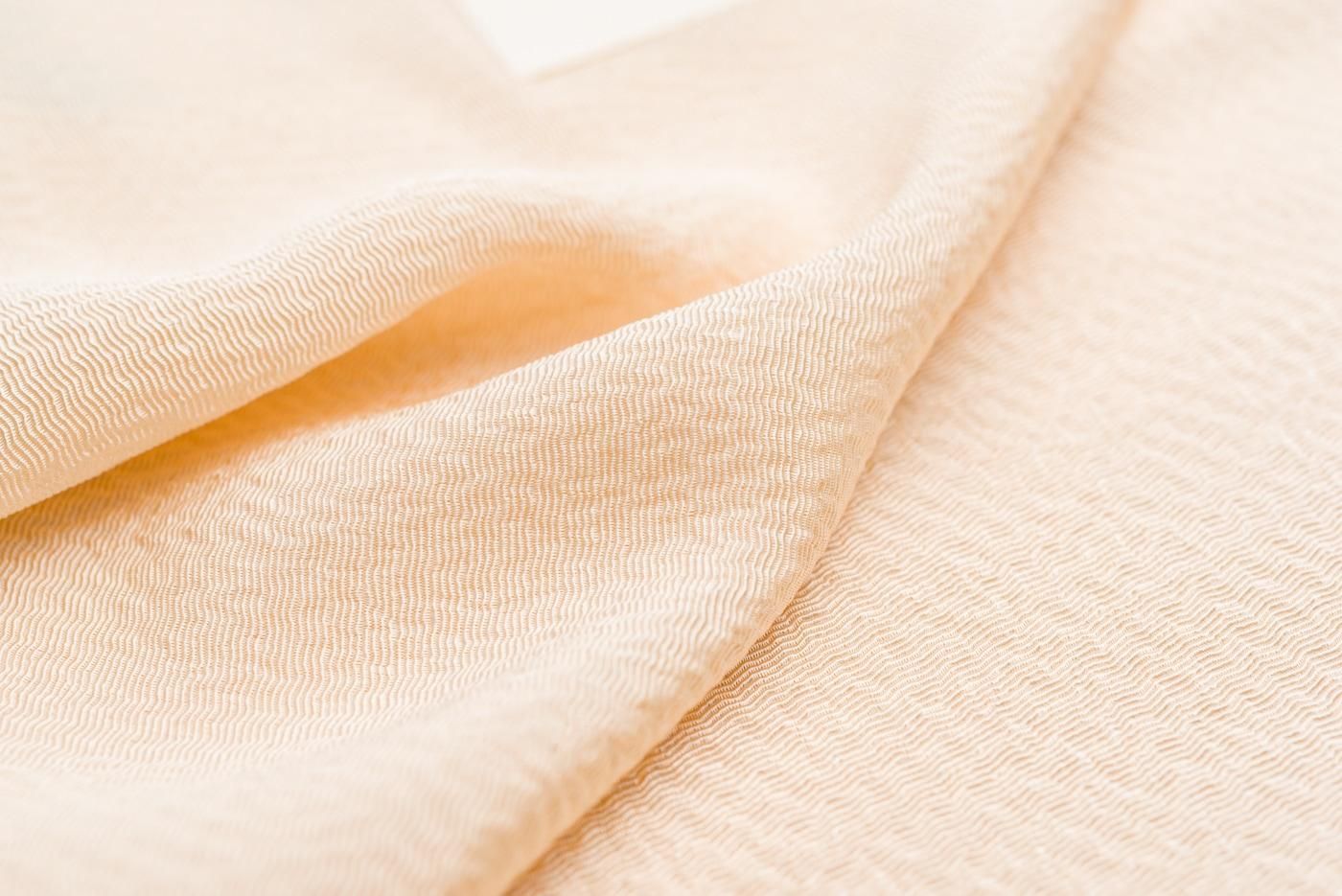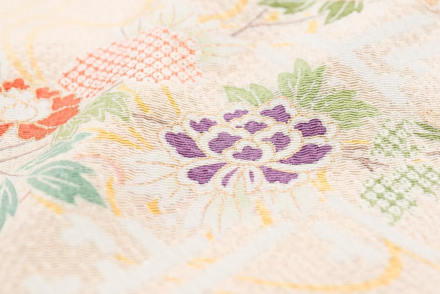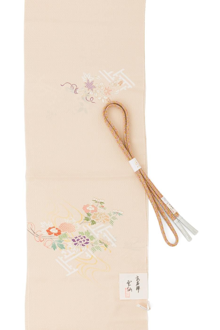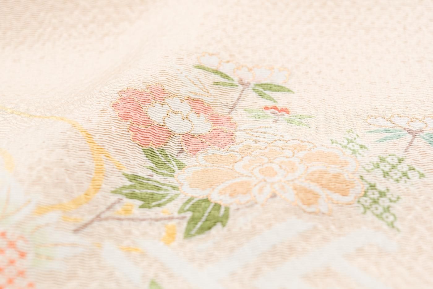 クリーム色の縮緬地に牡丹や紅葉を手描きした華やかな帯揚げです。