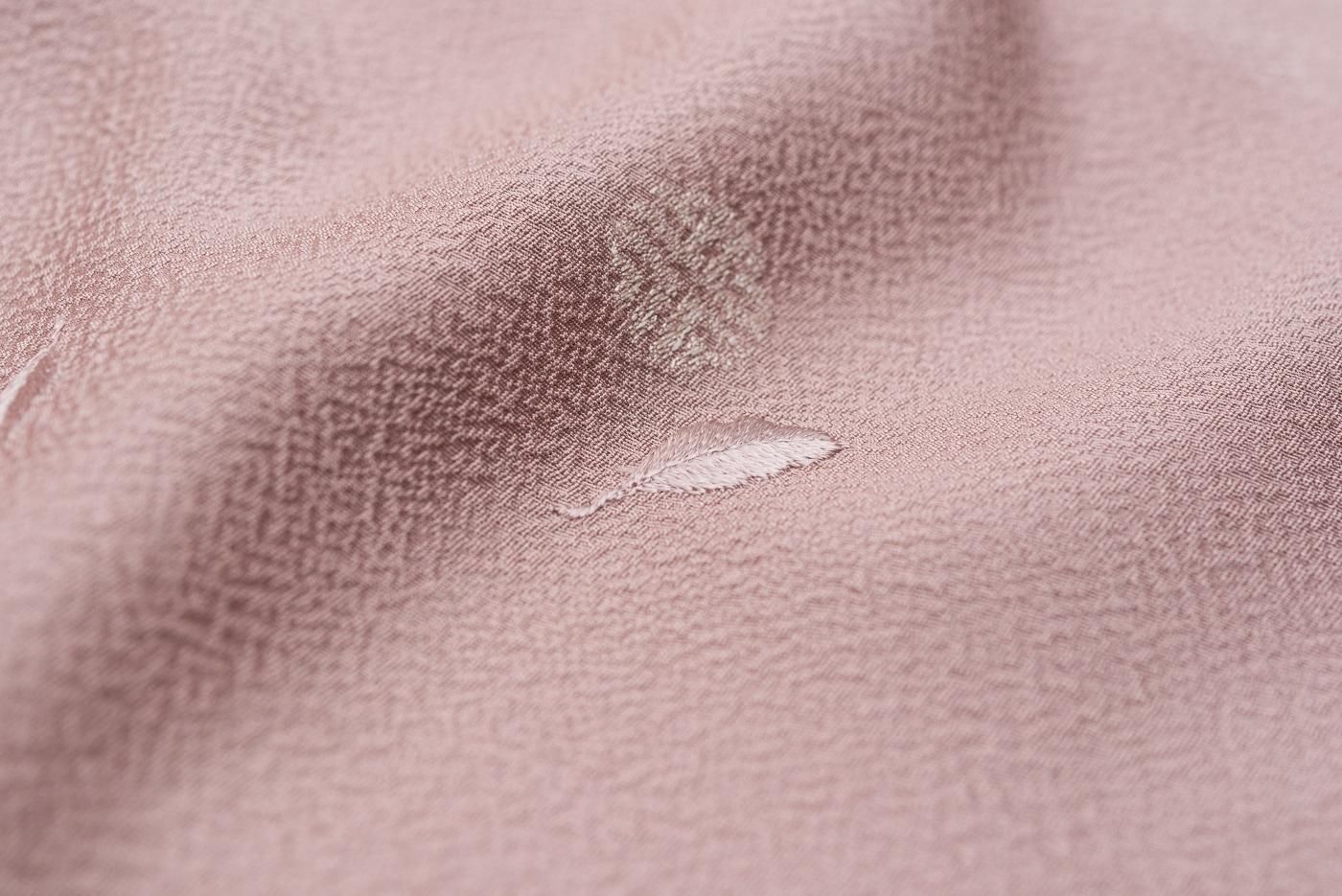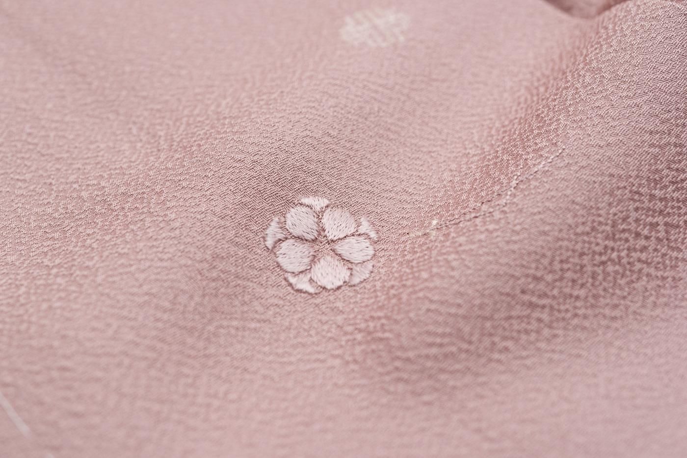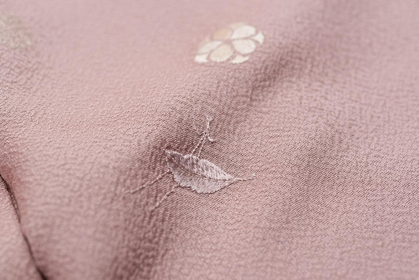 灰桜色の地に同色の糸で吹き寄せ柄を刺繍した付下げです。