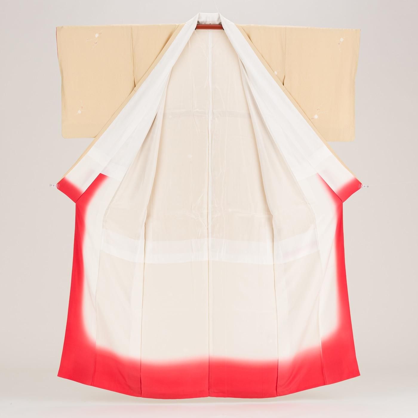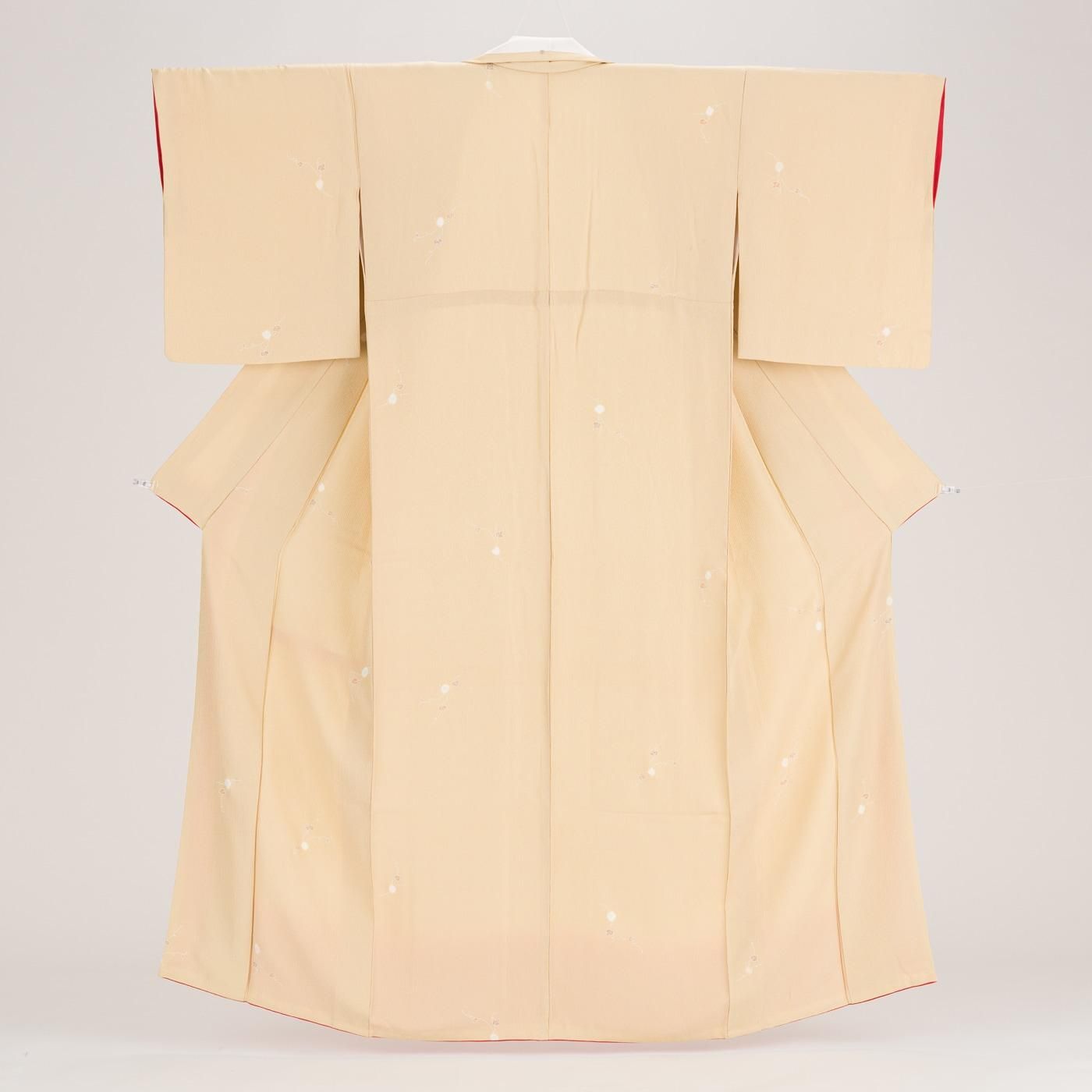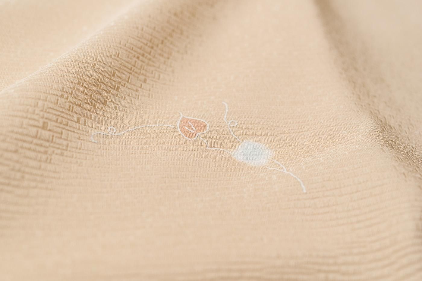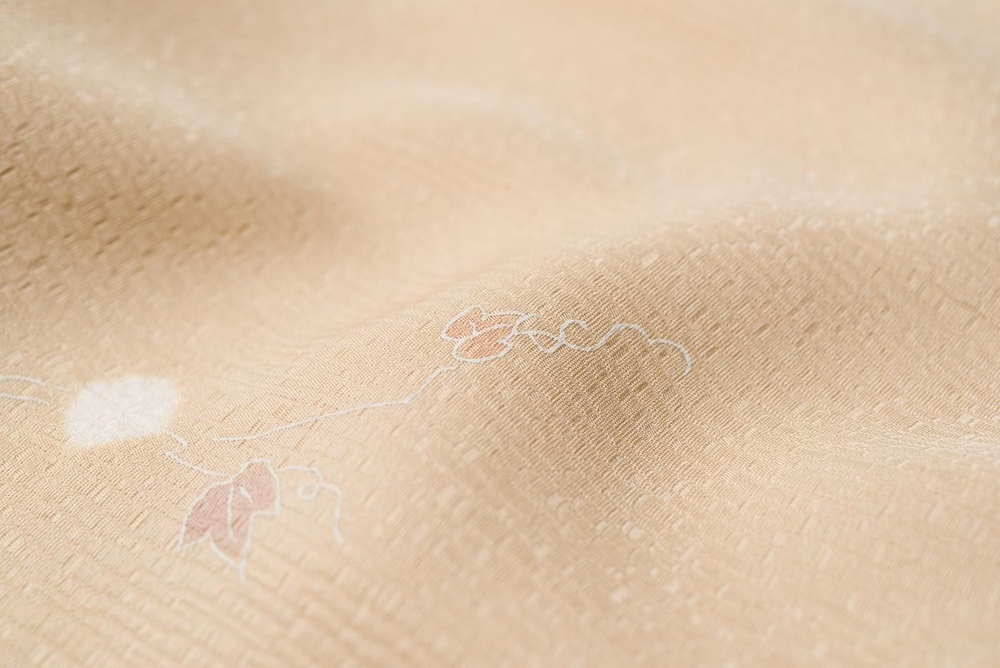 卵色の地に小さな花と蔓を染めた飛び柄の小紋です。
