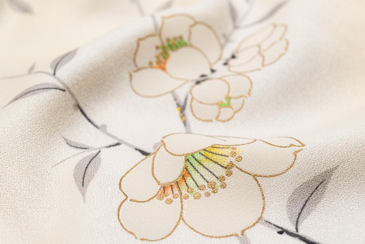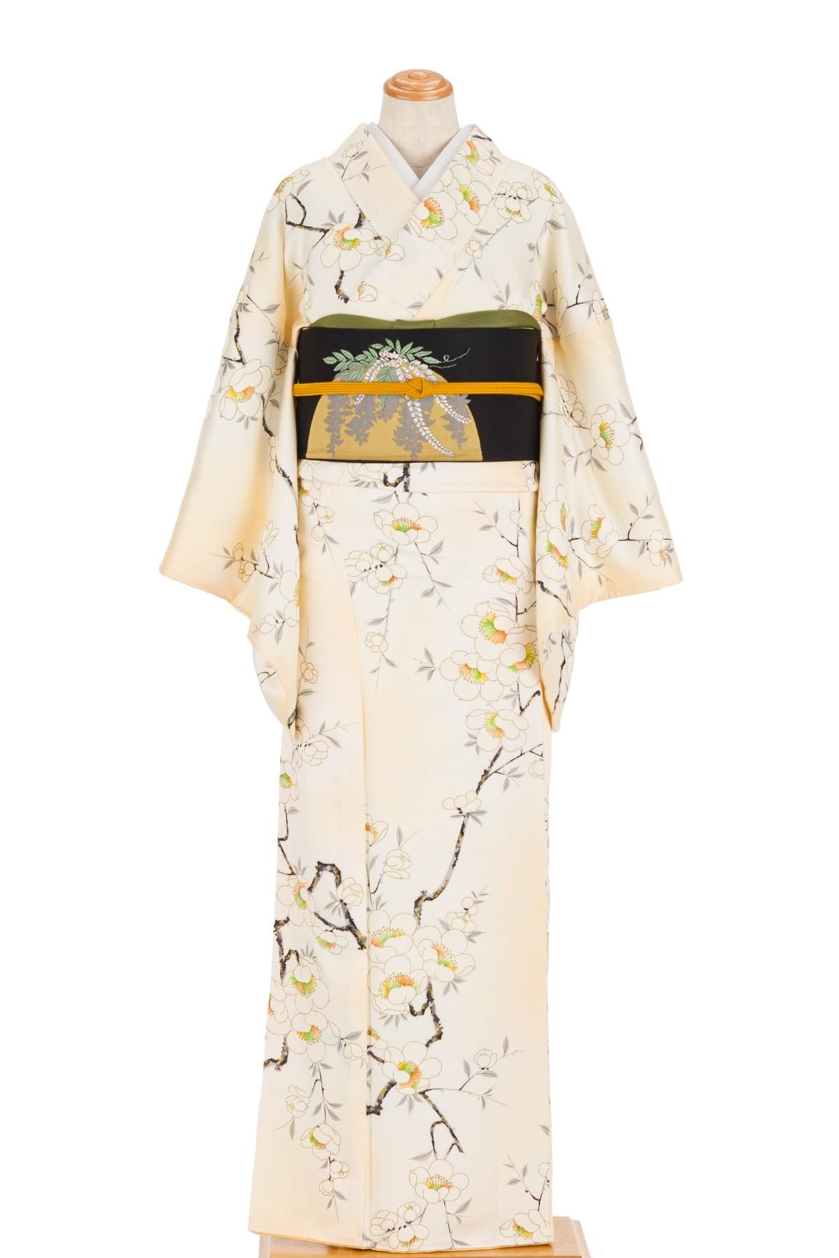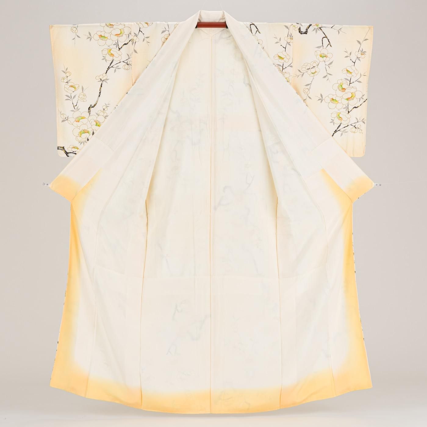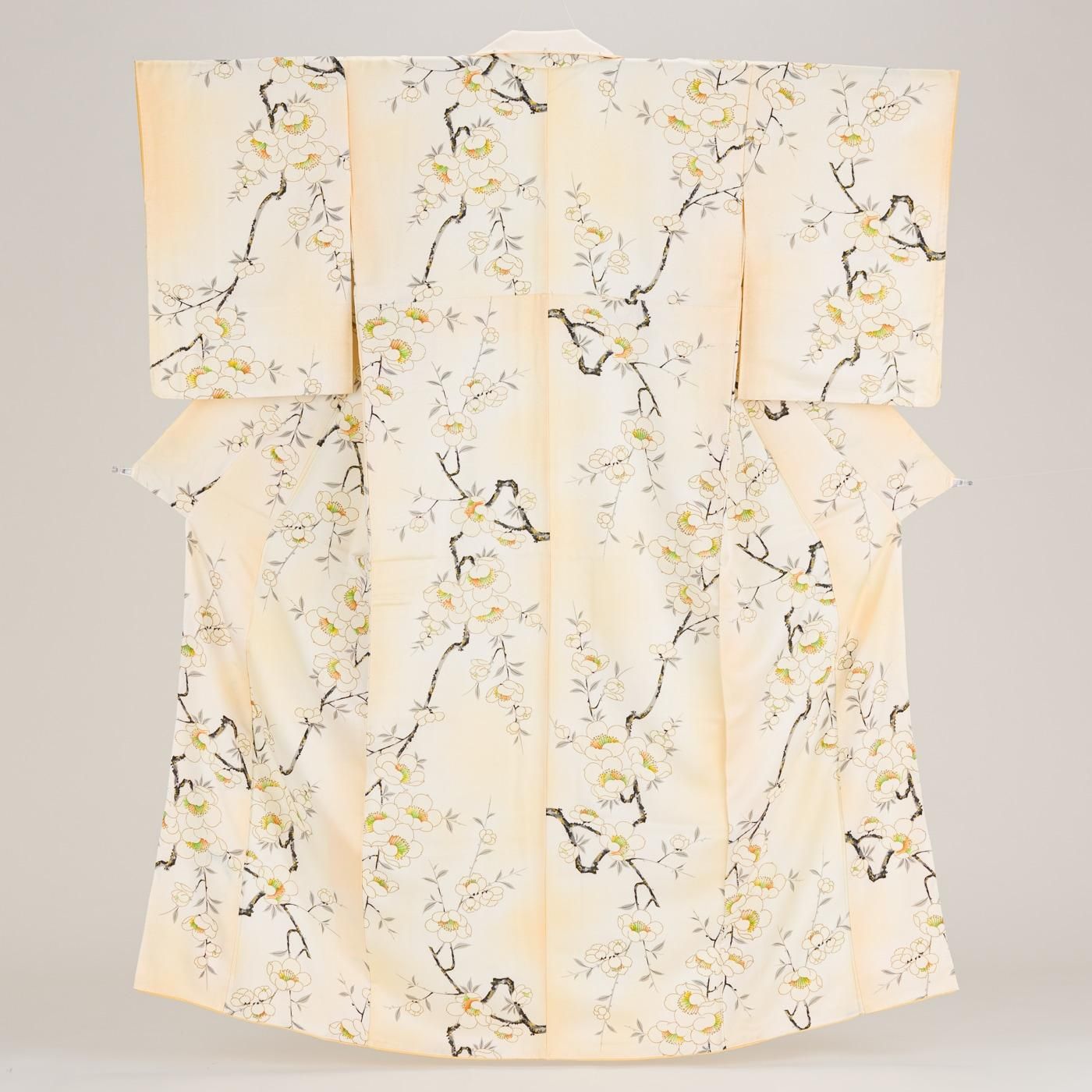 白と薄黄色の暈し地に梅の木を染めた小紋の着物です。