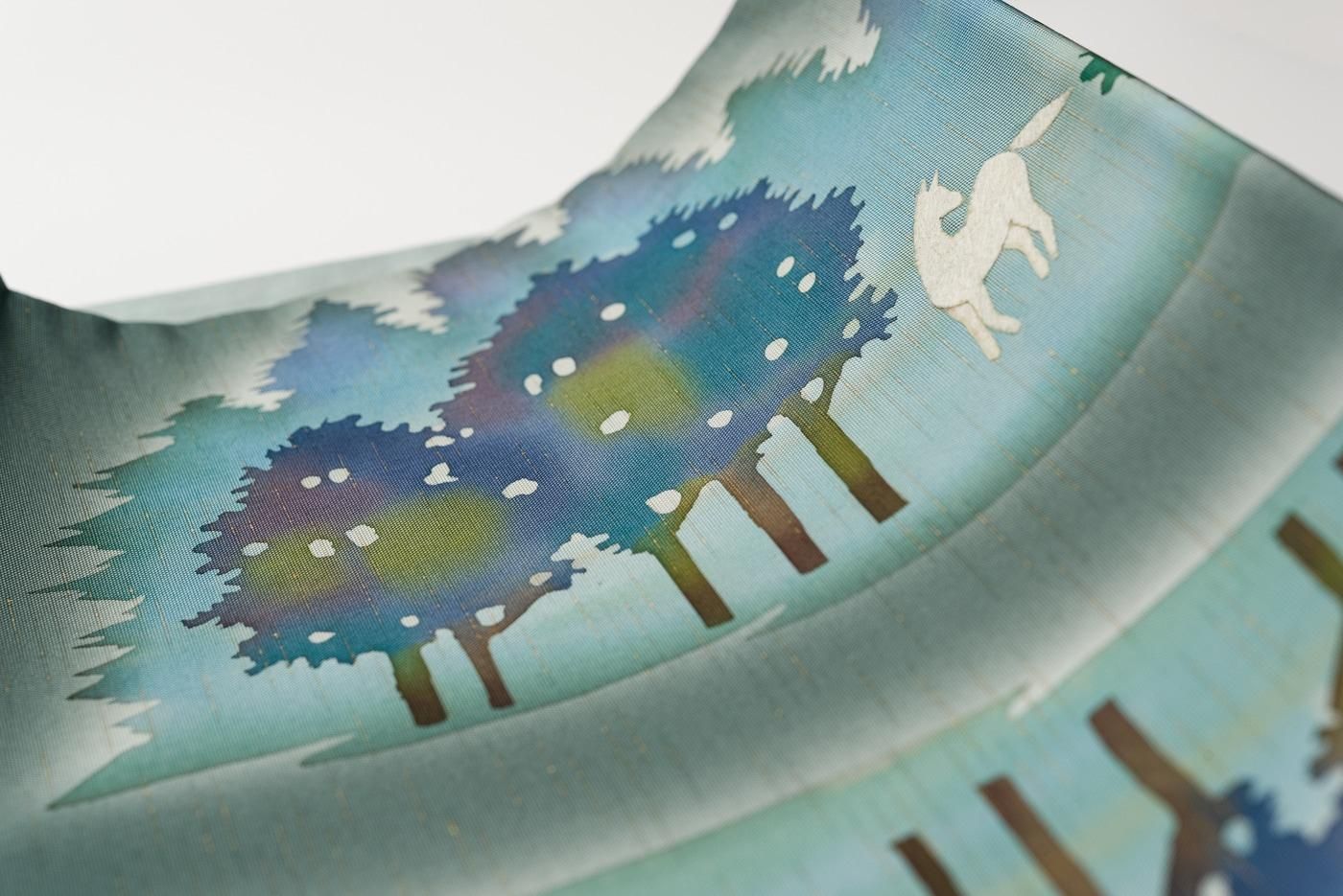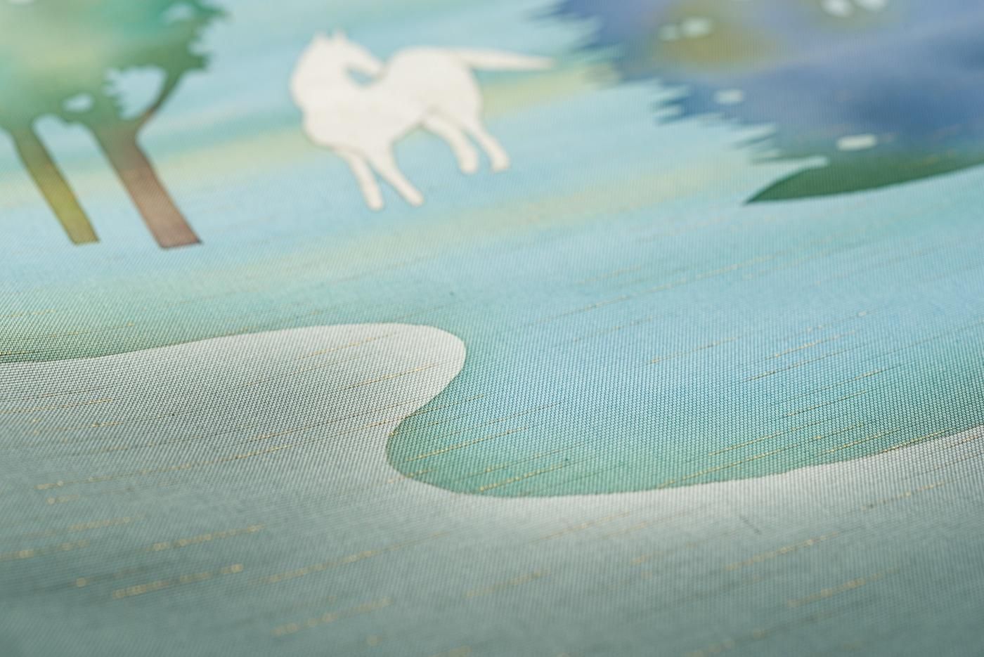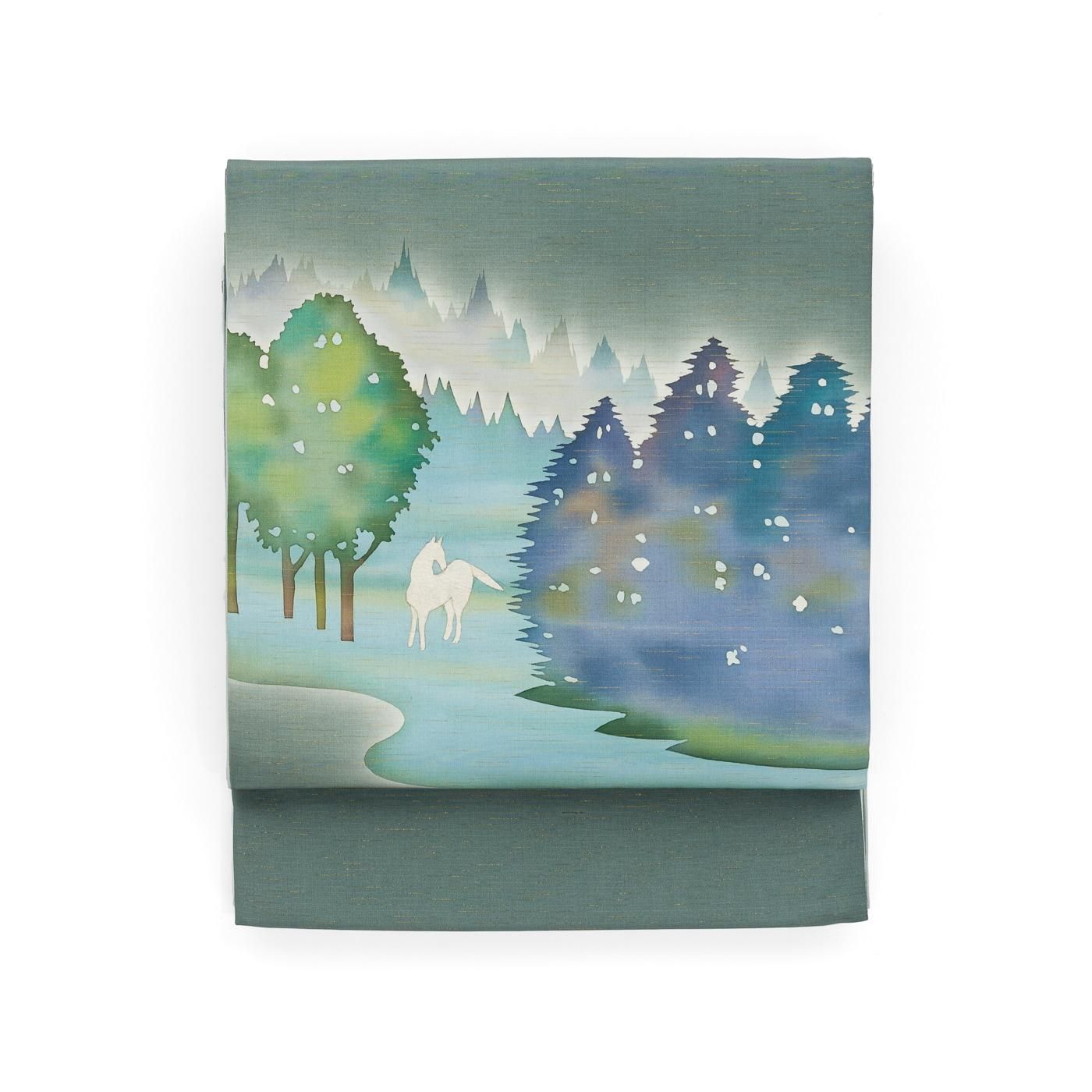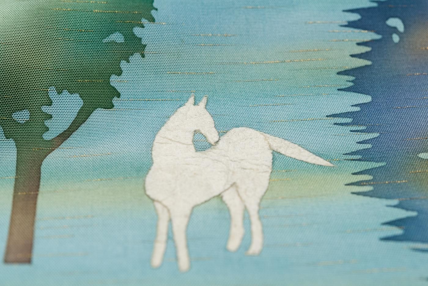 森の中に佇む白馬が美しい大島紬の袋帯です。