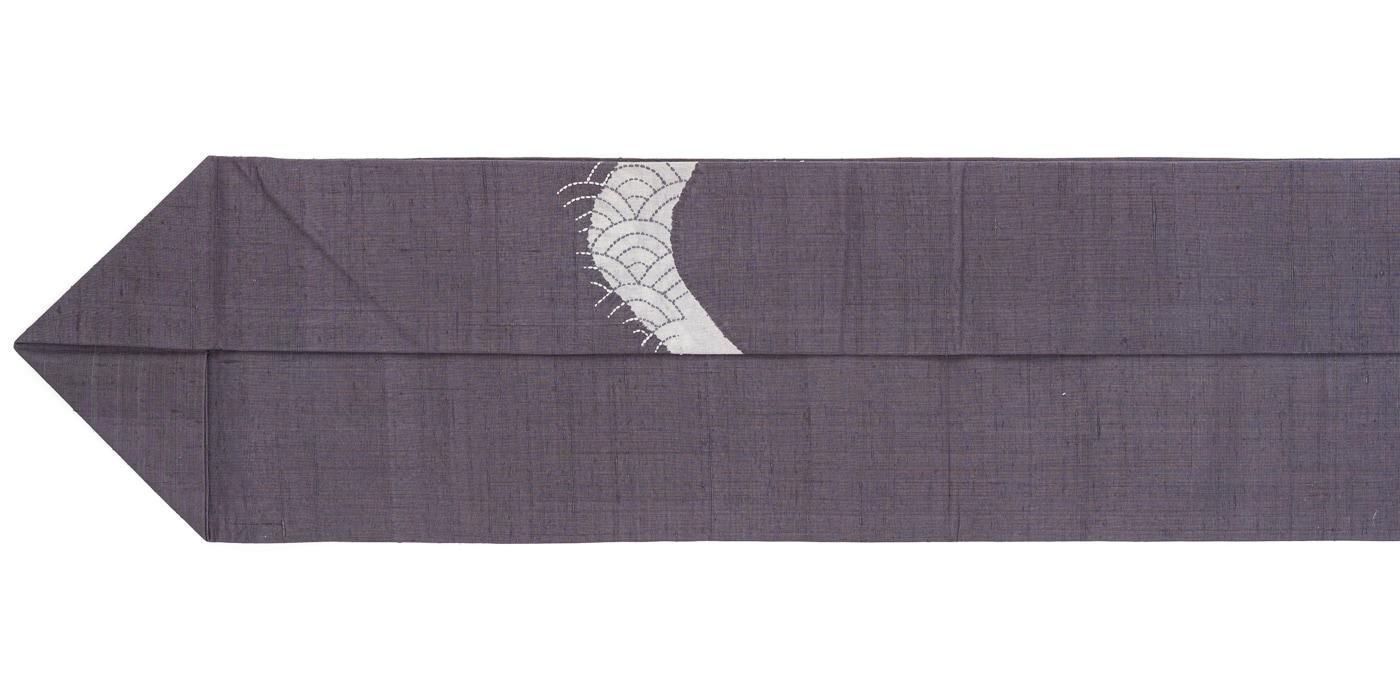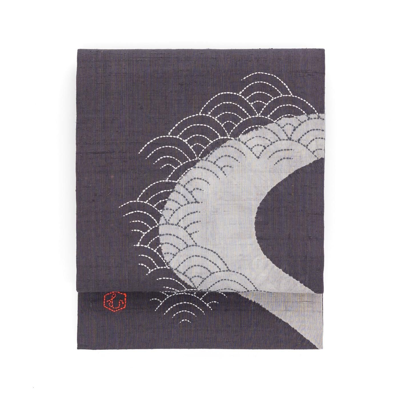 やや紫がかったグレーの地に刺し子の青海波が広がる紬地の九寸名古屋帯です。