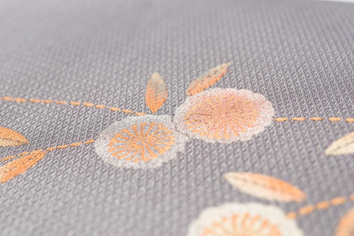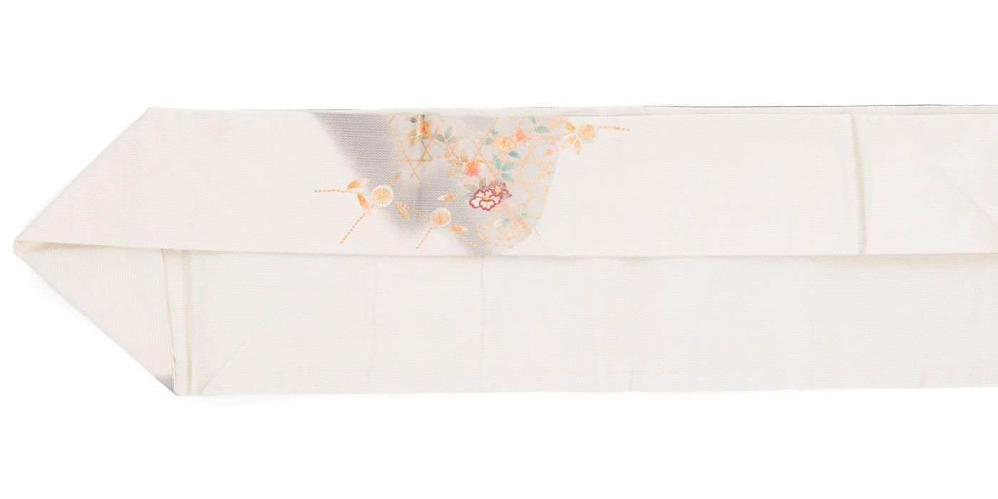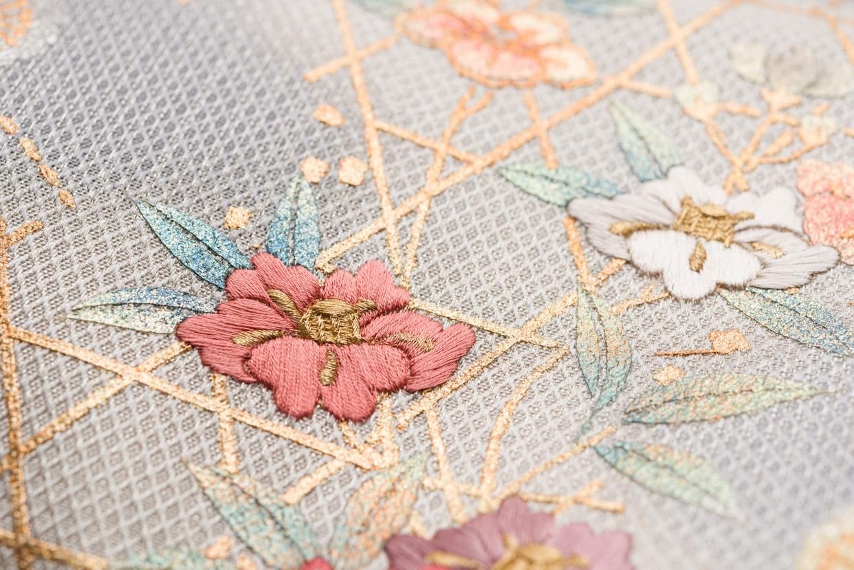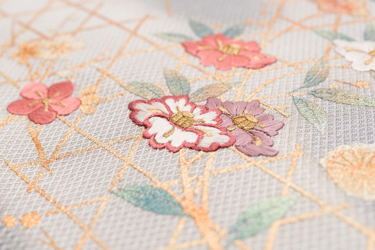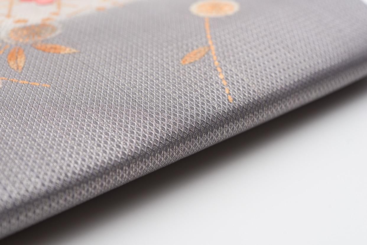 淡い紫グレーの地に椿と梅を刺繍した九寸名古屋帯です。