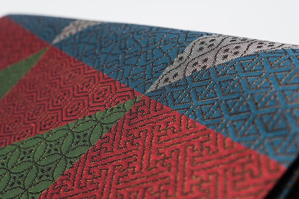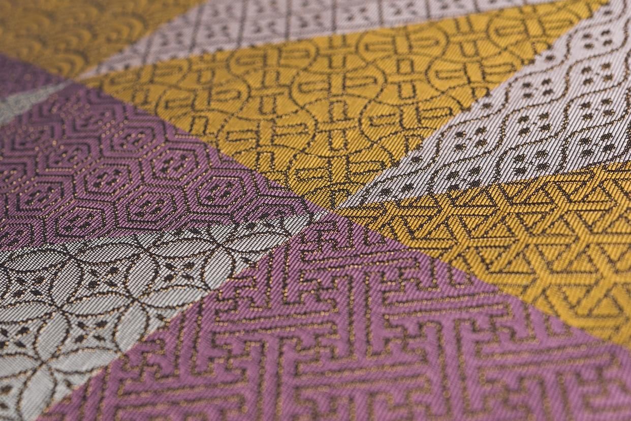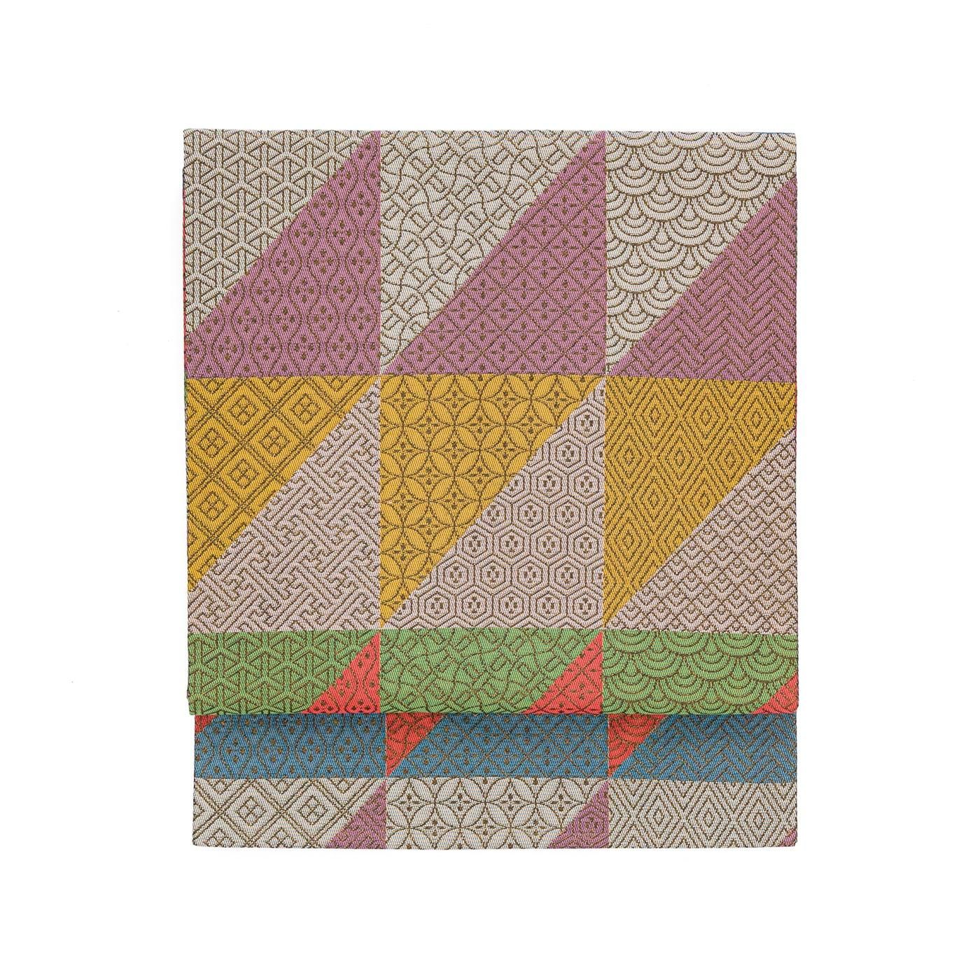 青海波、菱、七宝、紗綾型などの古典柄を織り出した開き名古屋帯です。