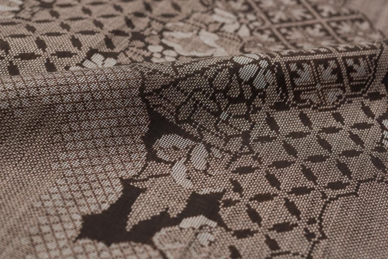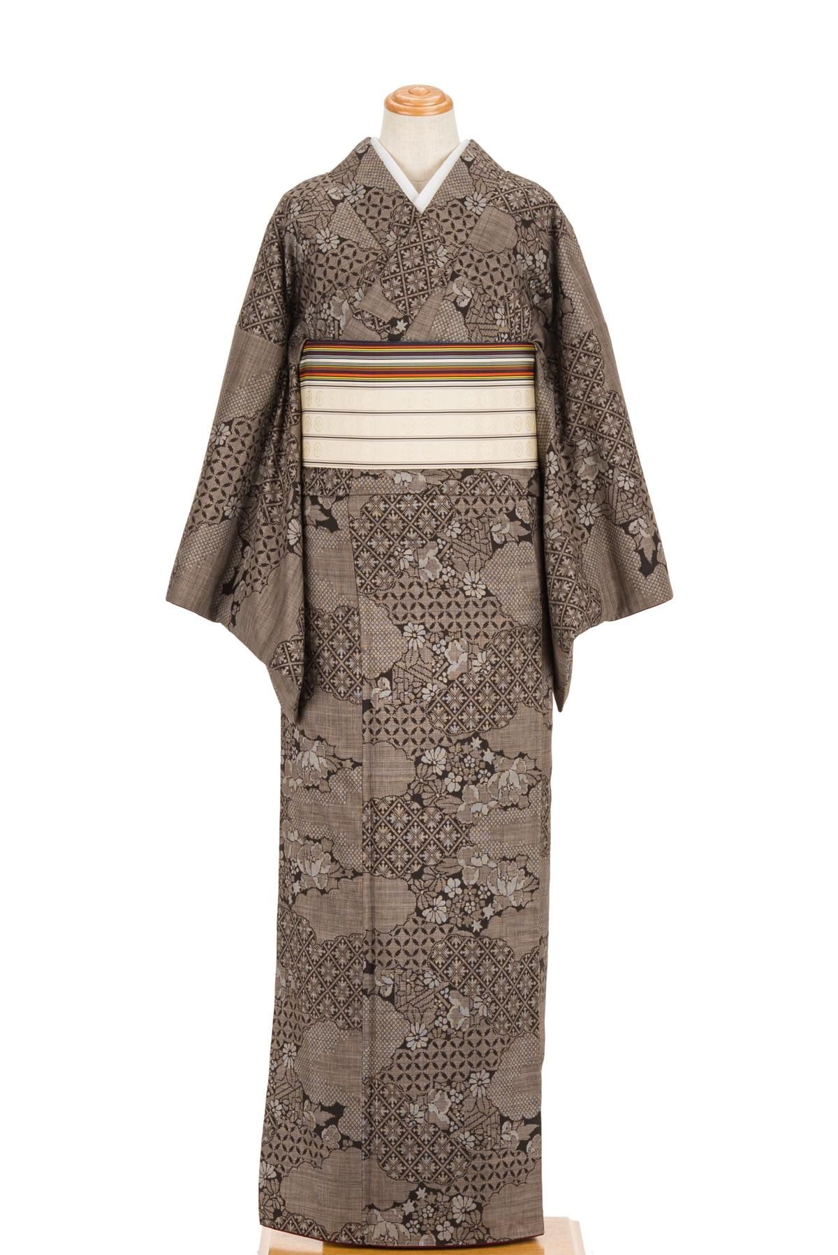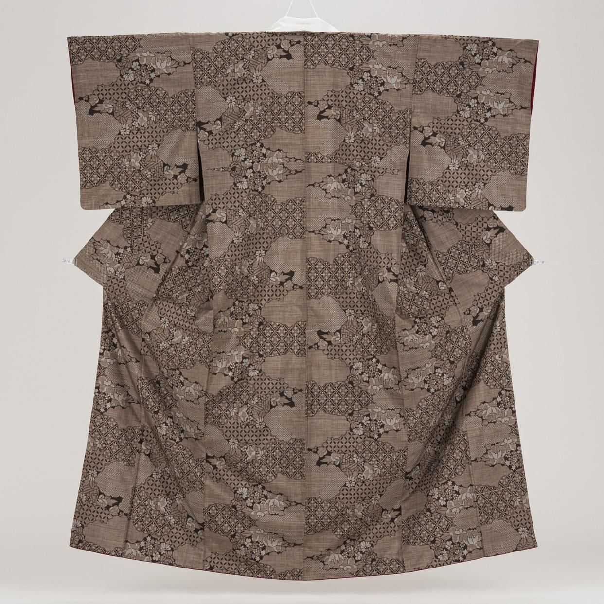 雲取りに牡丹や菊の花、七宝や菱などの古典柄を織り出した大島紬の着物です。