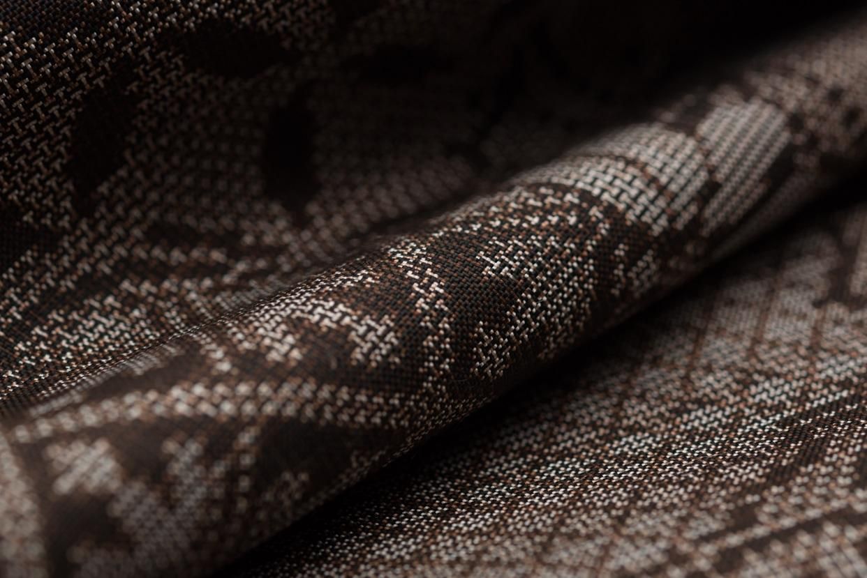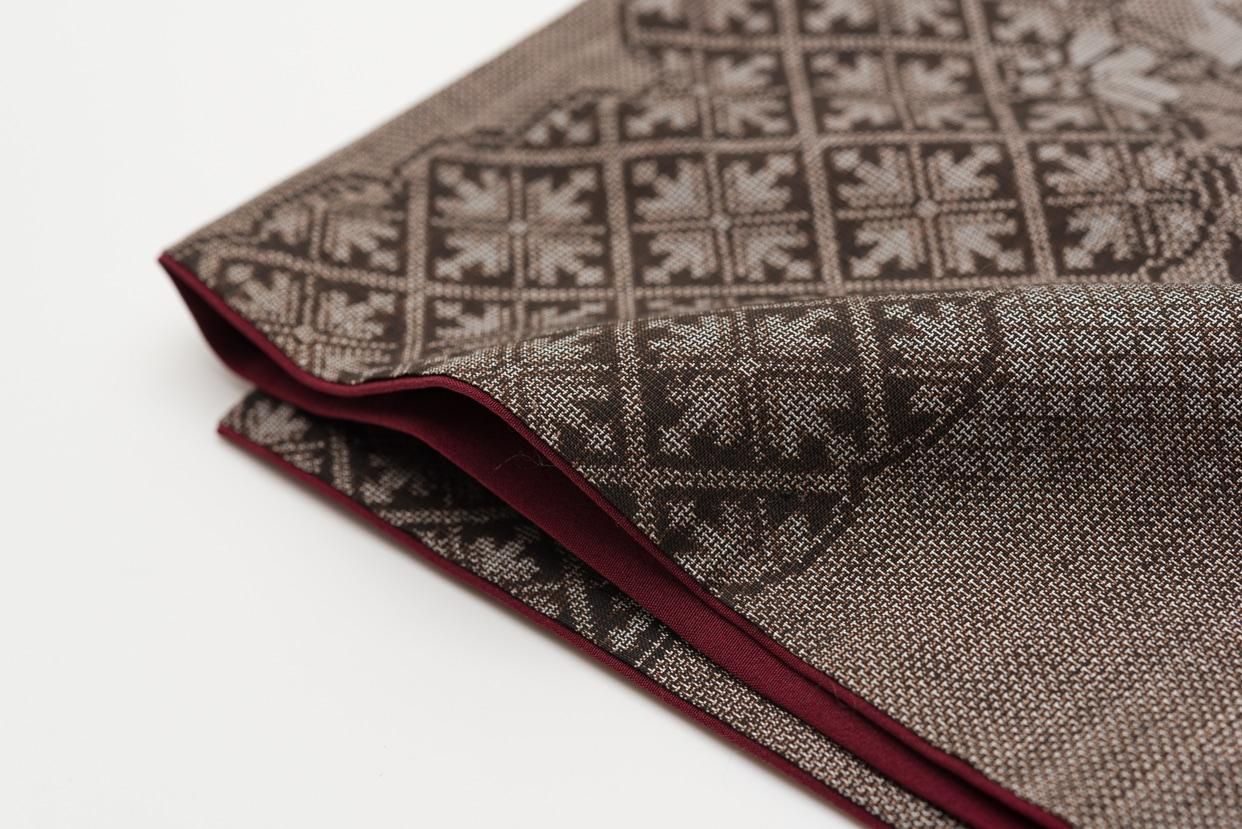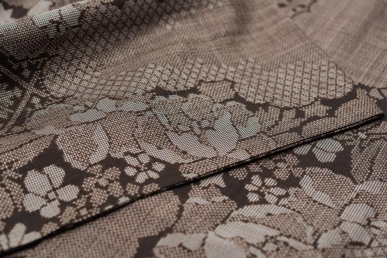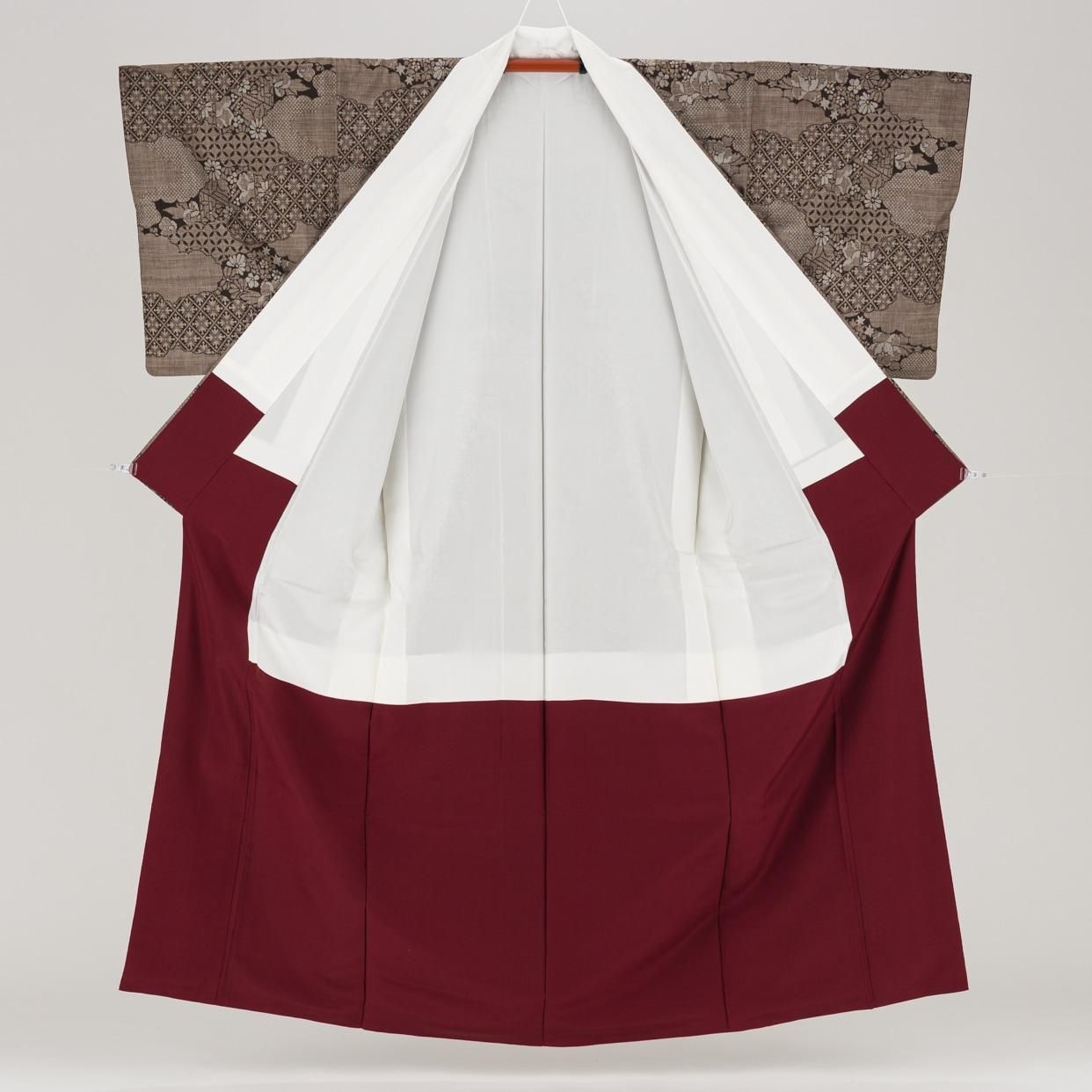 雲取りに牡丹や菊の花、七宝や菱などの古典柄を織り出した大島紬の着物です。