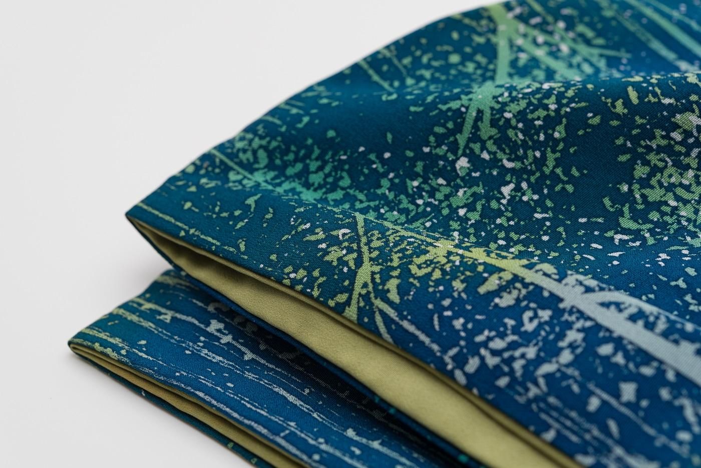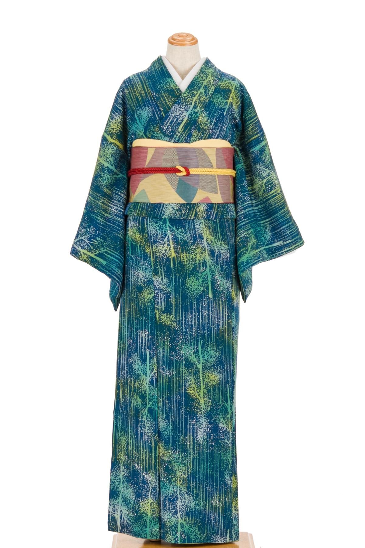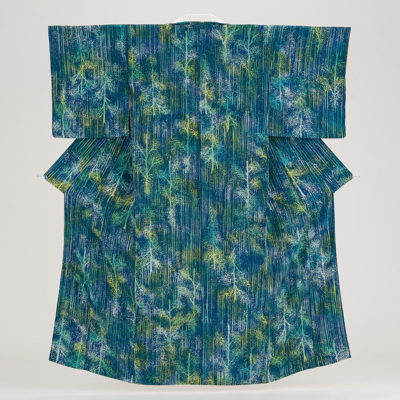 青緑の地に木のシルエットを染めた小紋の着物です。