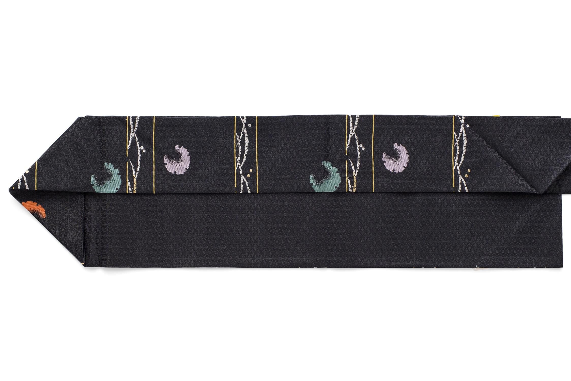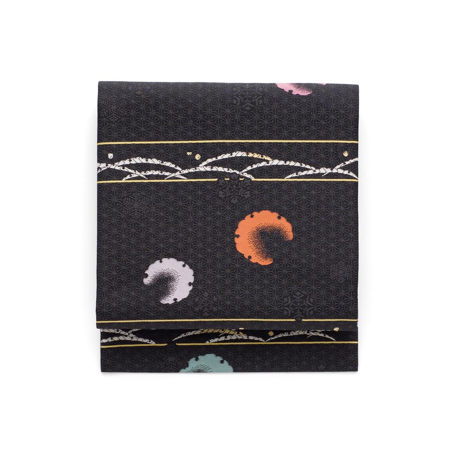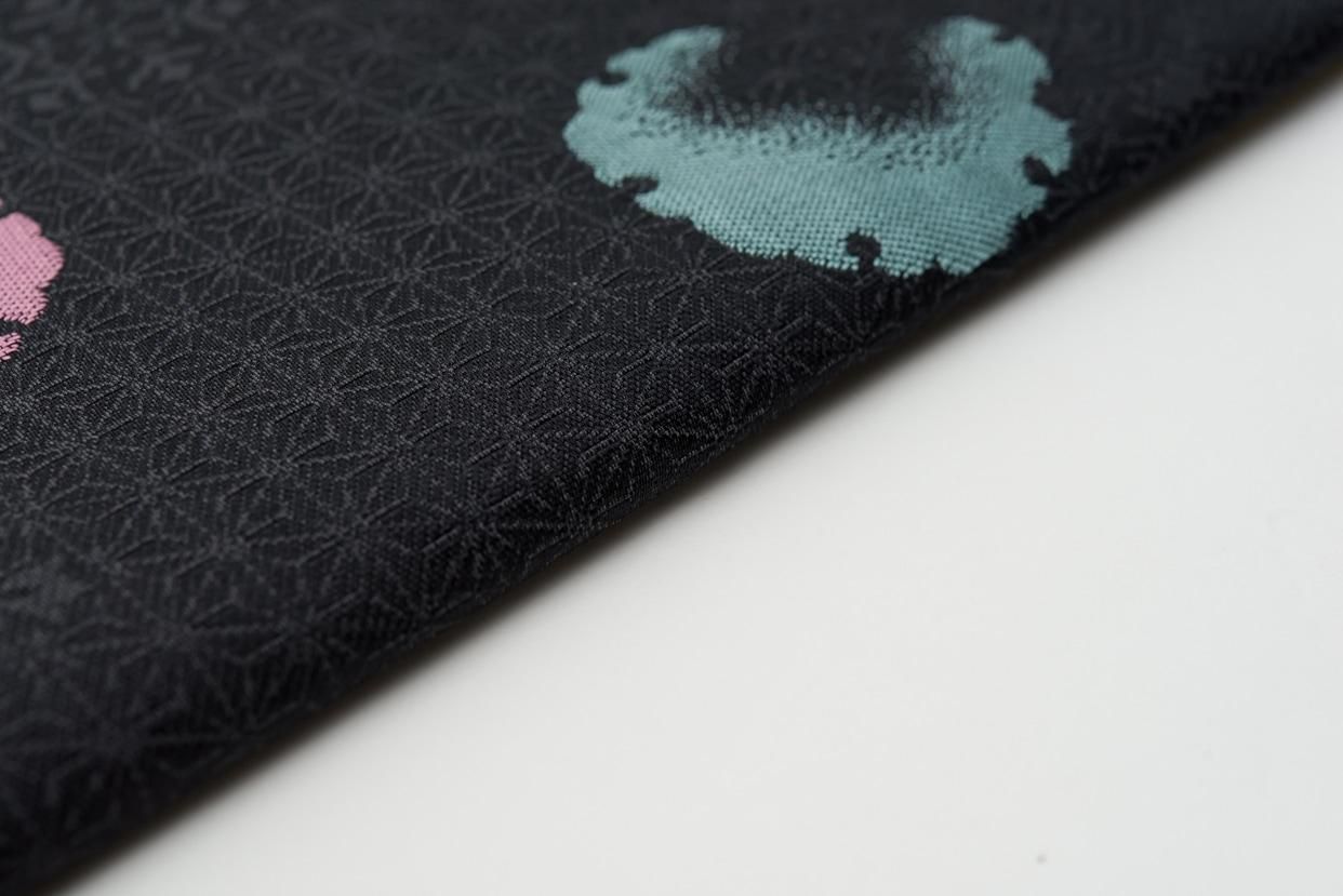 麻の葉地紋の黒に雪輪と芝草を織り出した九寸名古屋帯です。