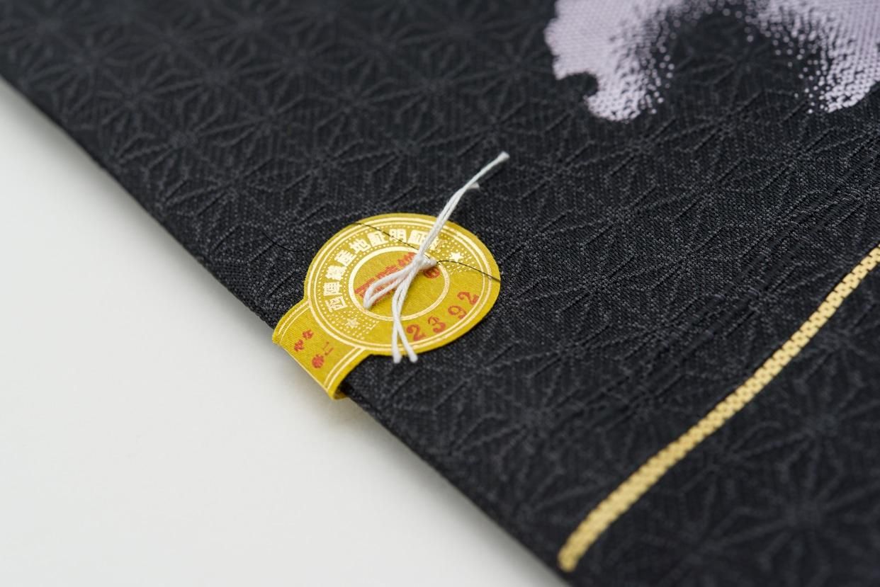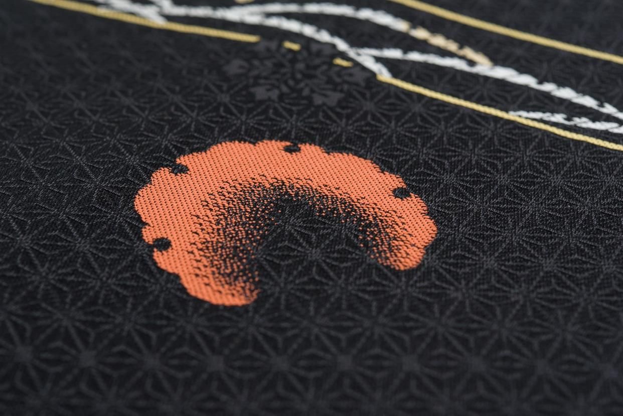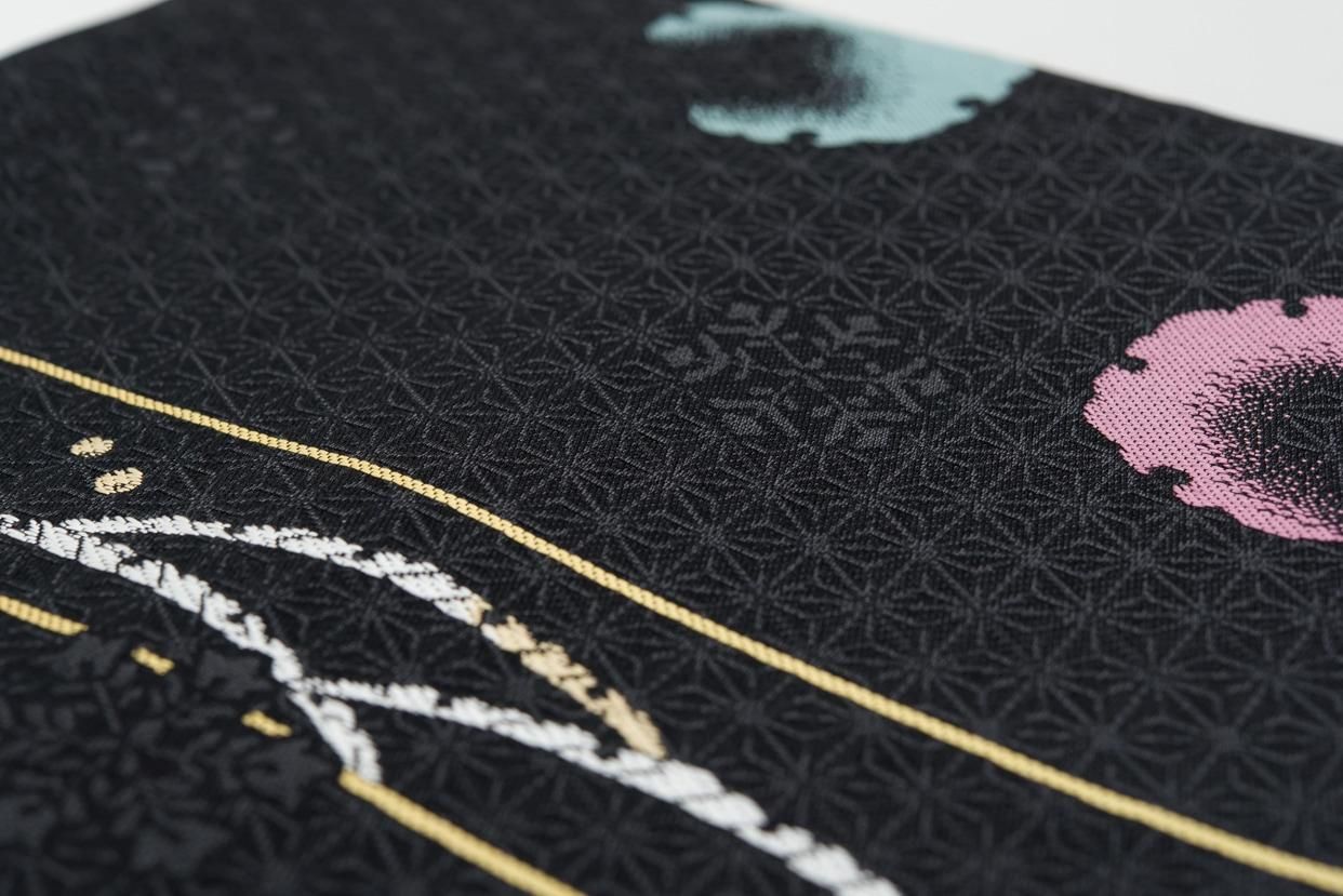 麻の葉地紋の黒に雪輪と芝草を織り出した九寸名古屋帯です。