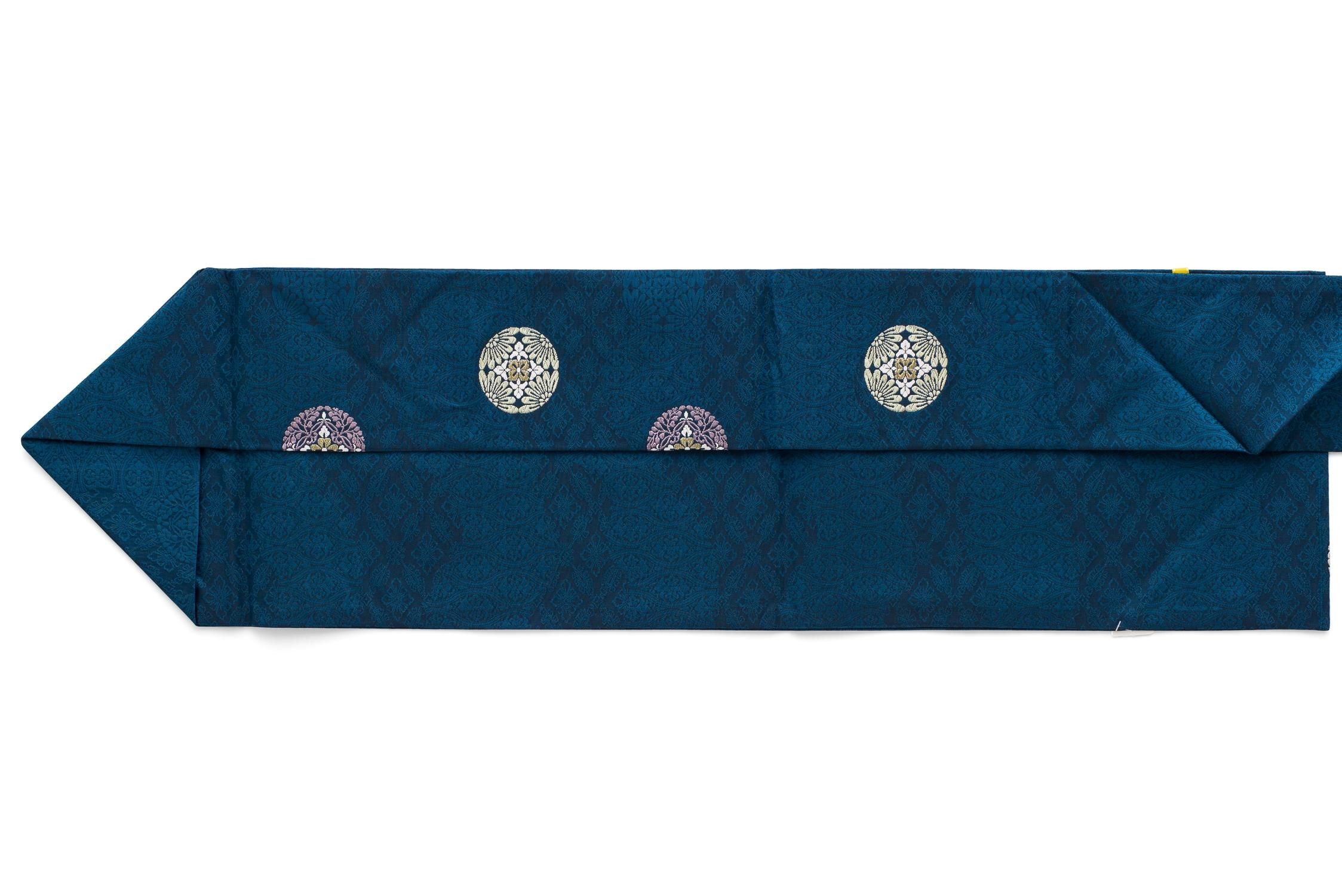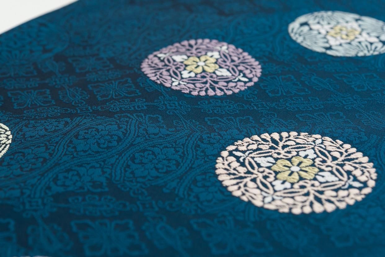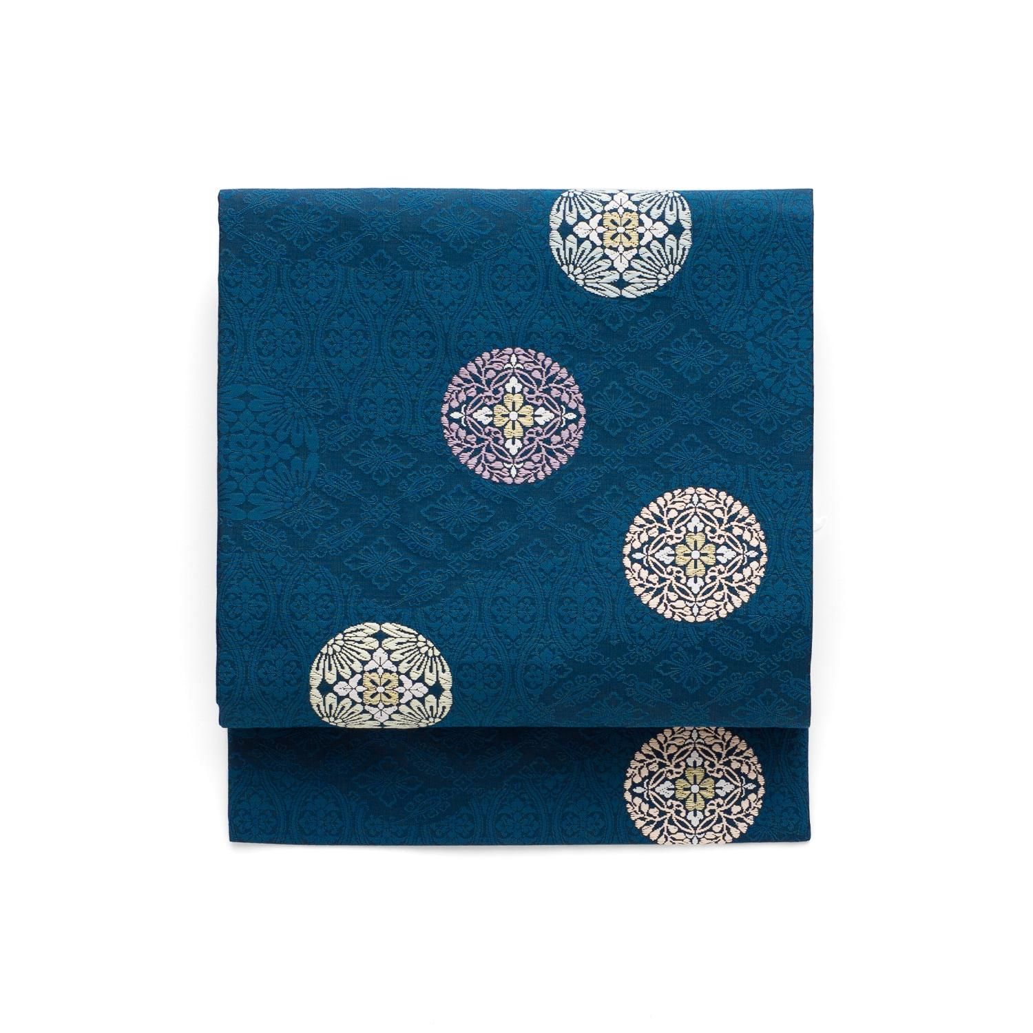 ピーコックブルーの地に唐花の丸を織り出した九寸名古屋帯です。