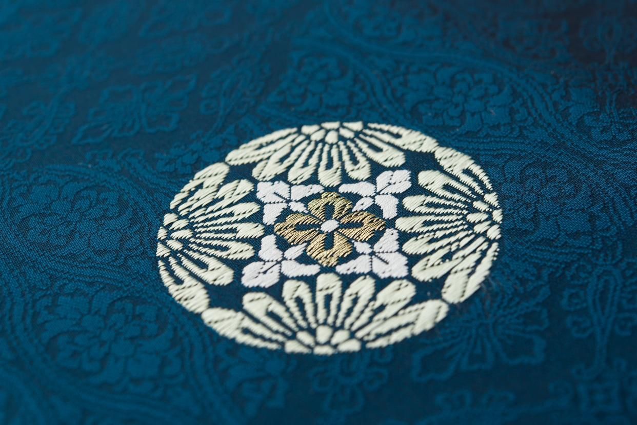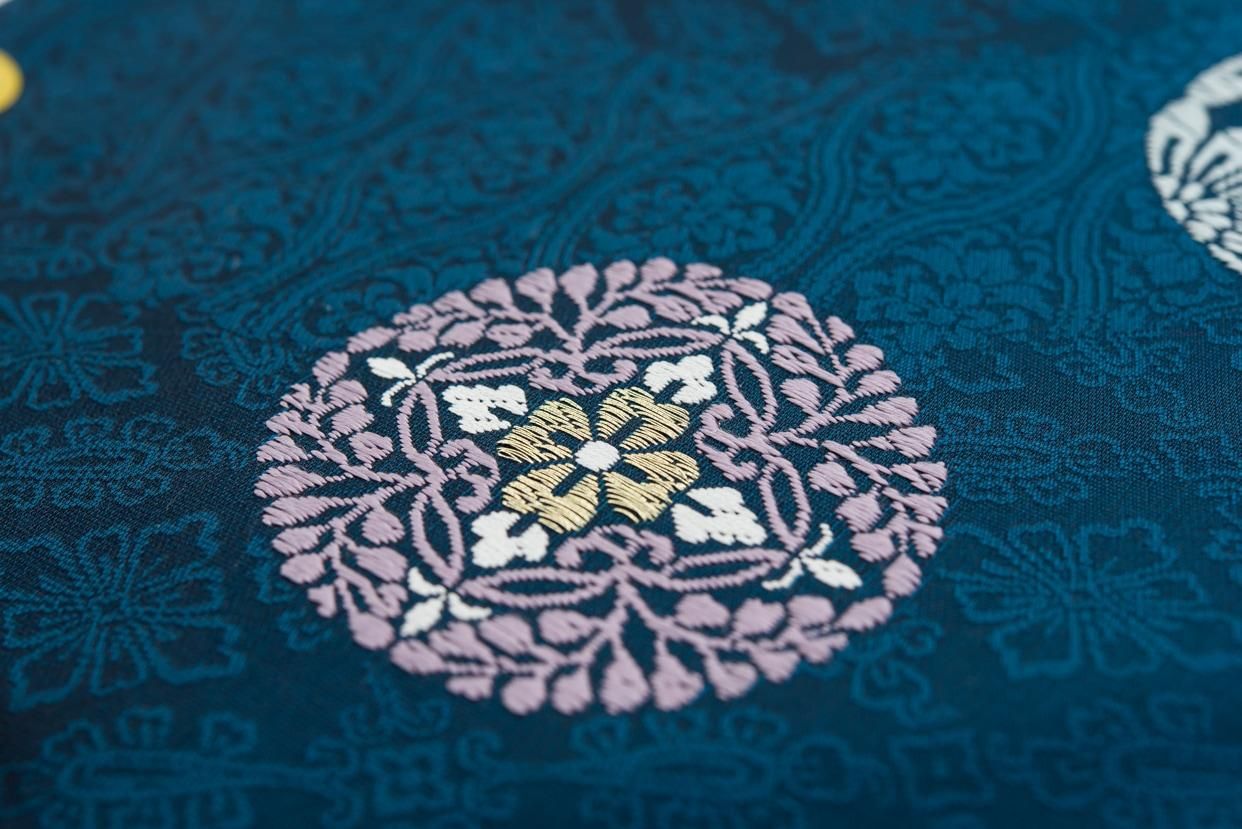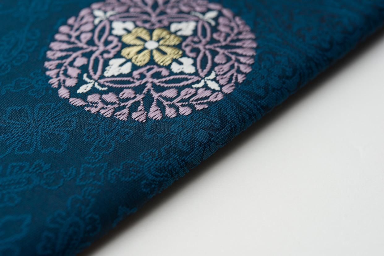 ピーコックブルーの地に唐花の丸を織り出した九寸名古屋帯です。