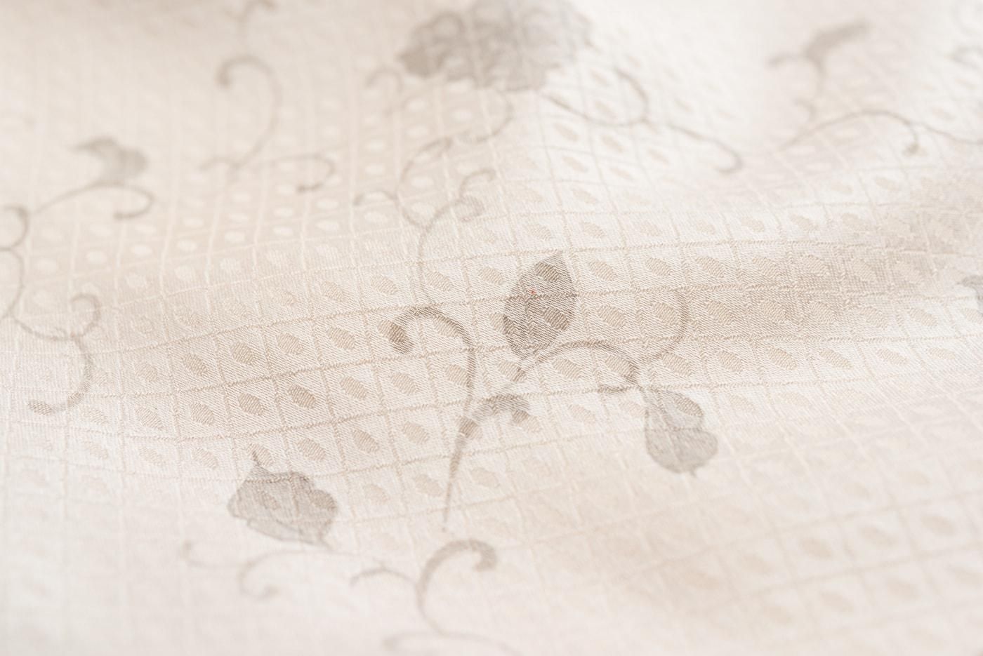 ほのかな光沢が美しいパールホワイトの地に白い花を染めた小紋の着物です。