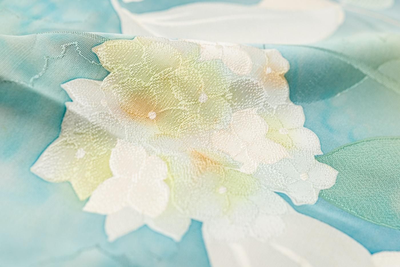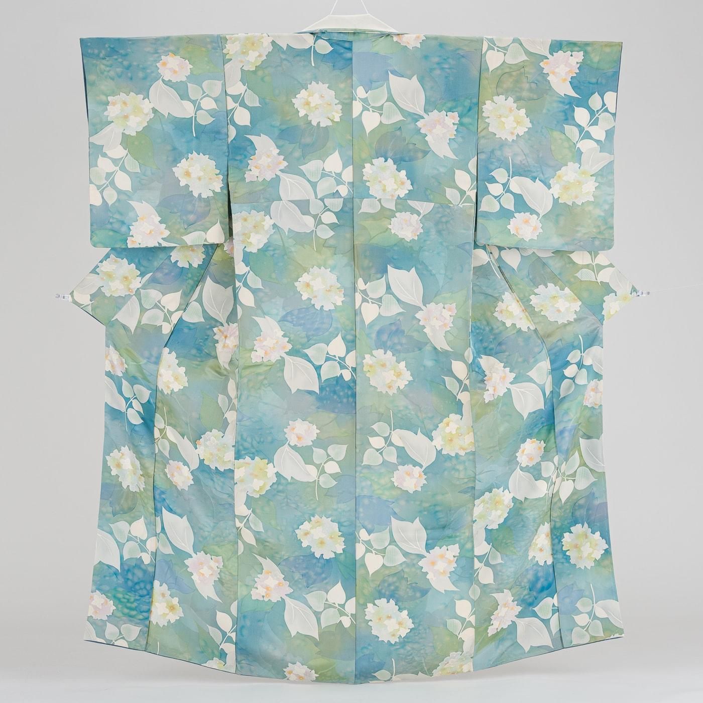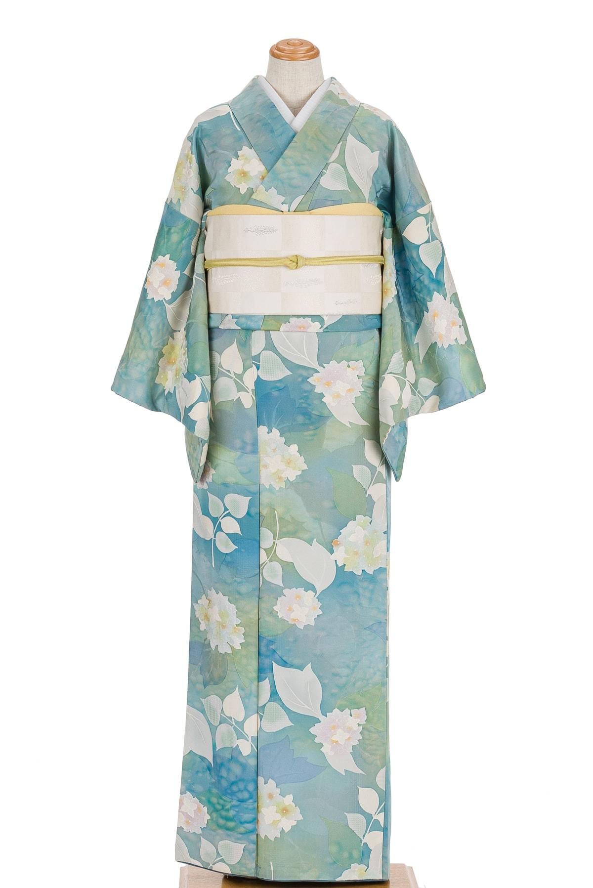 青や緑の暈し地に地紋起こしで紫陽花を染めた小紋の着物です。