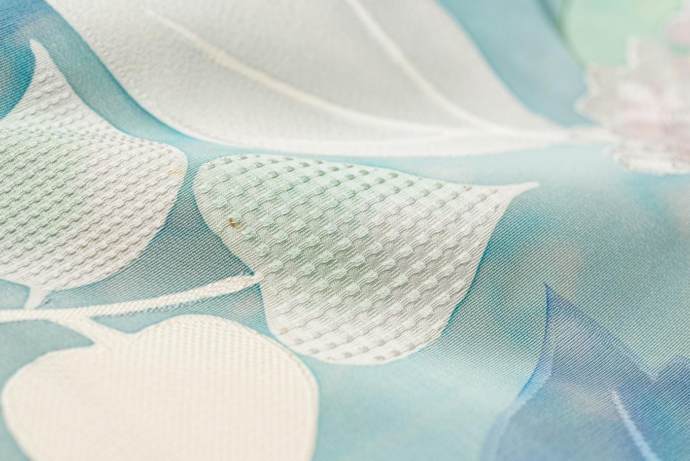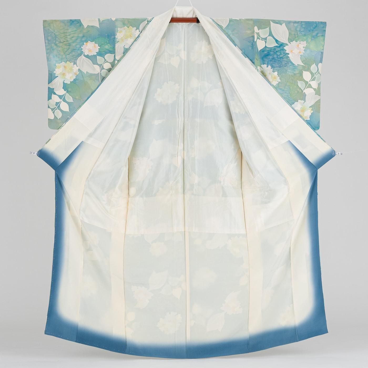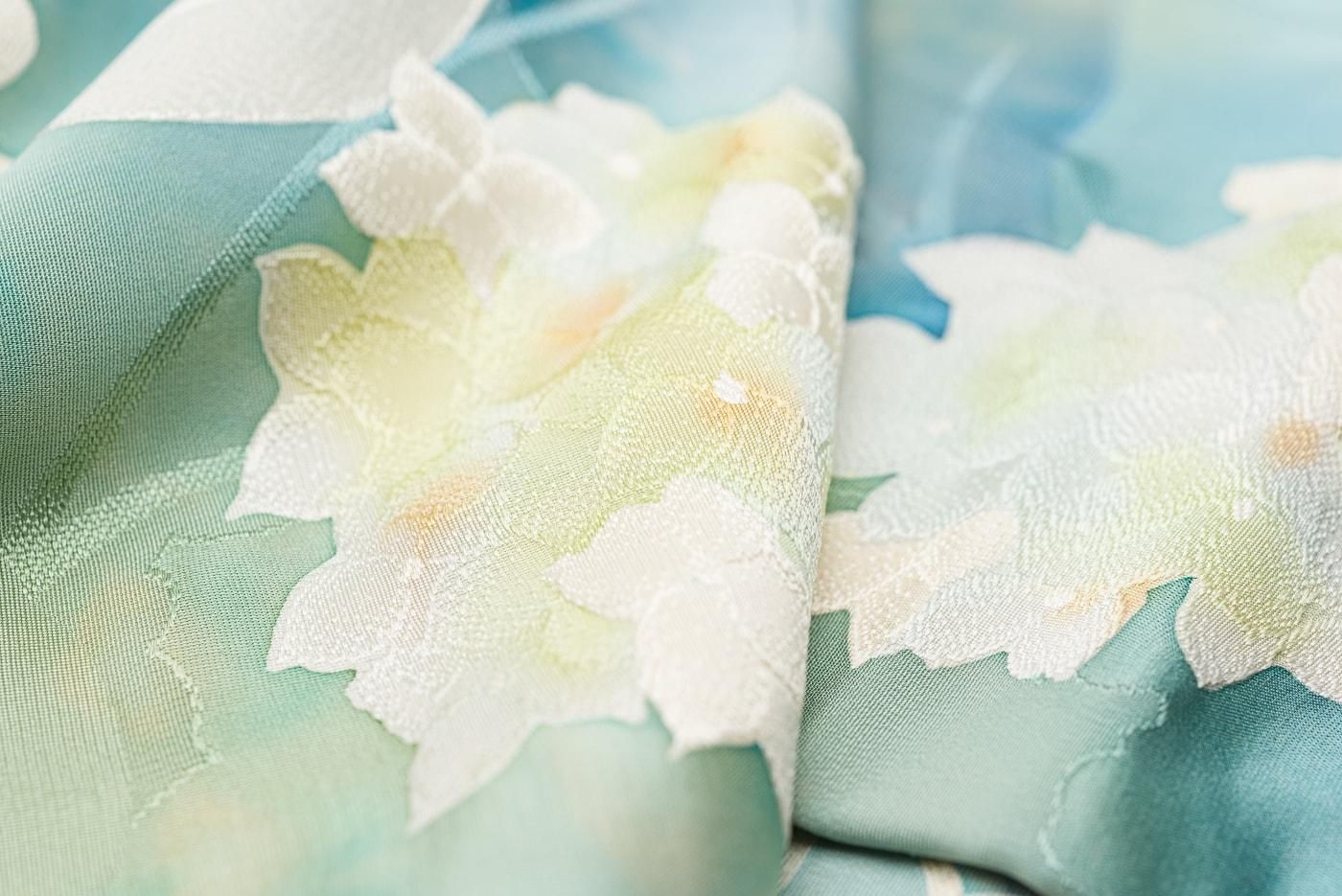 青や緑の暈し地に地紋起こしで紫陽花を染めた小紋の着物です。