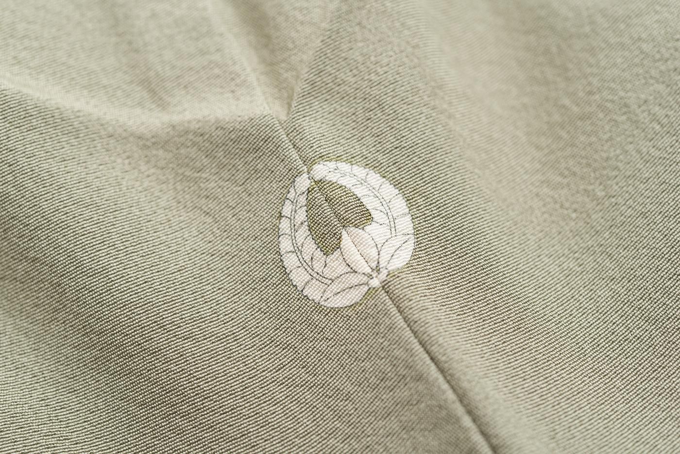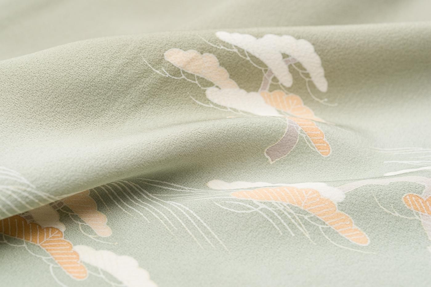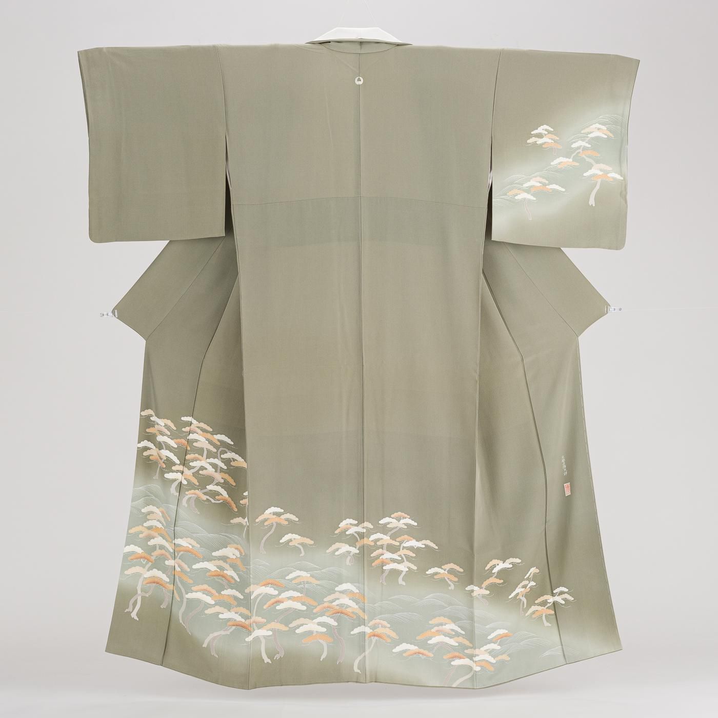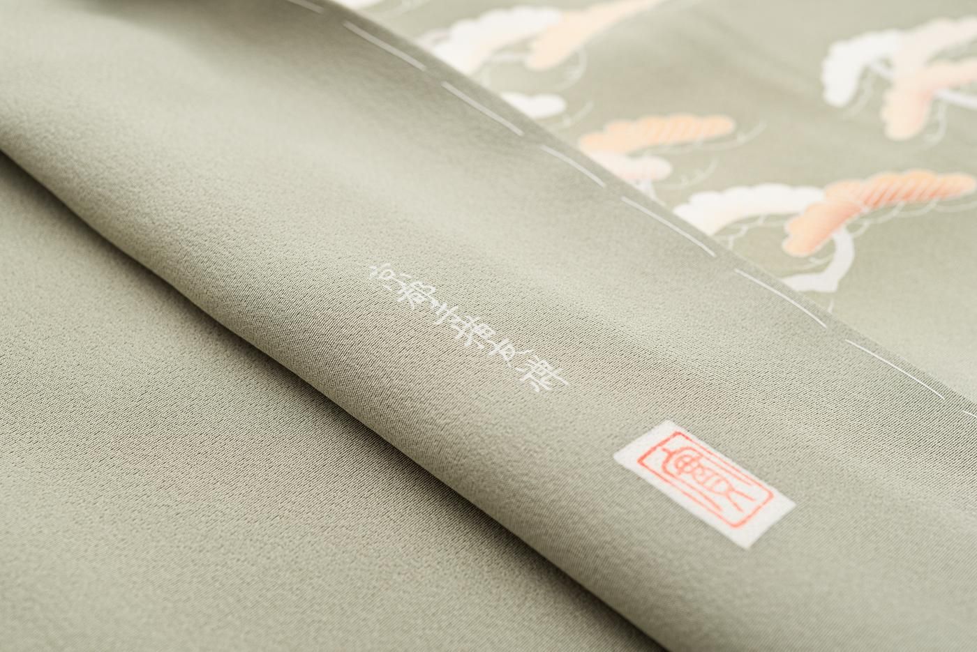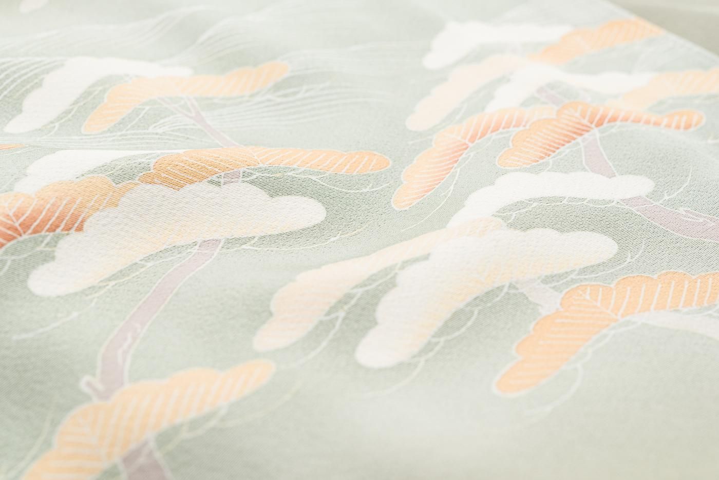 淡い山葵色の地に波と松を描いた手描き友禅の訪問着です。