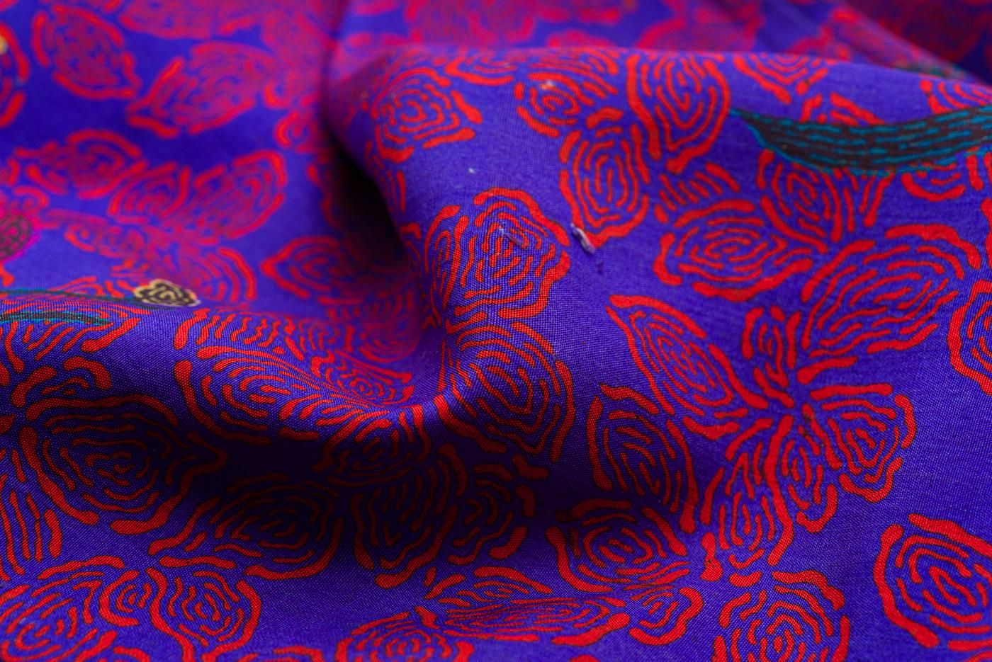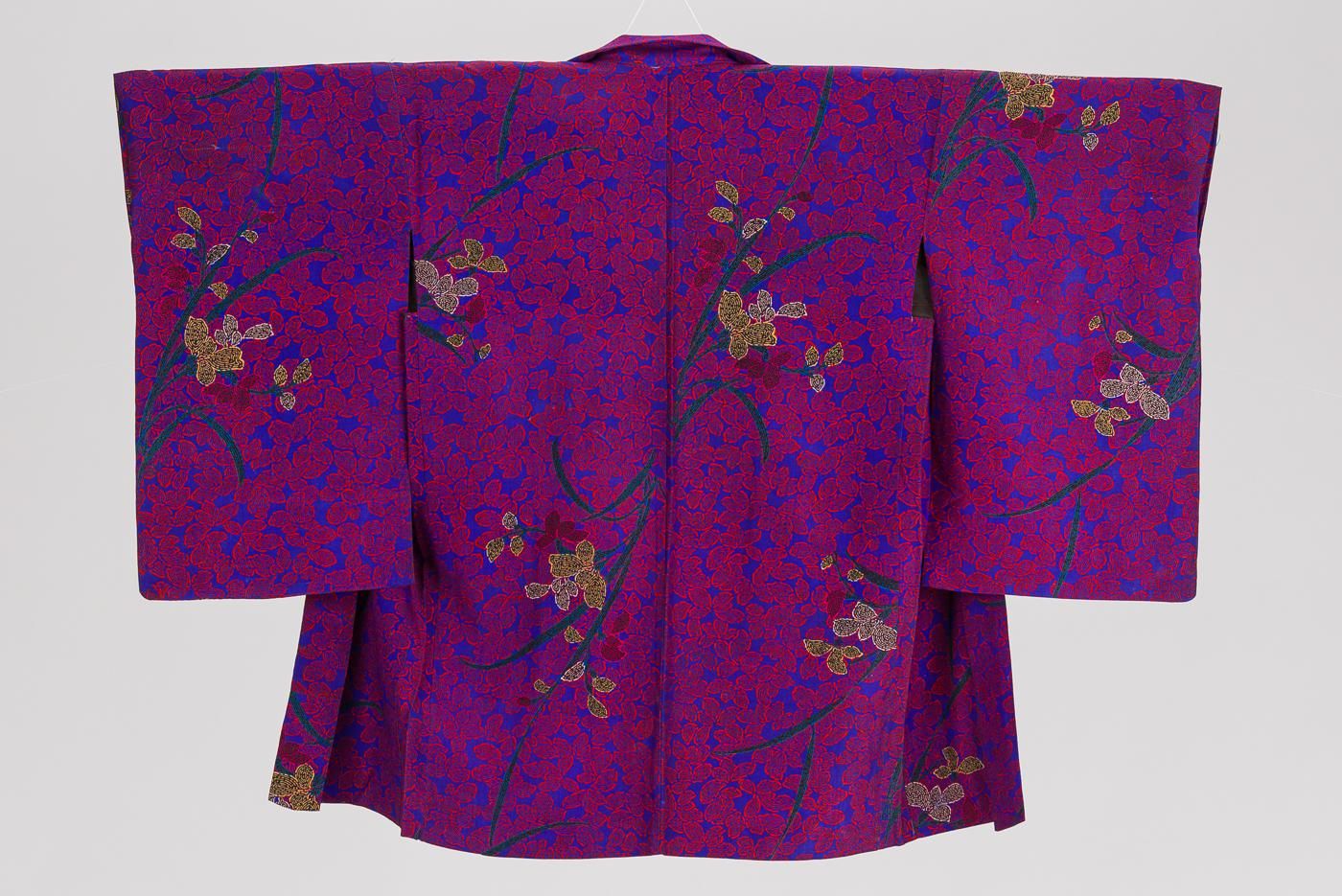 紫と赤のコントラストがヴィヴィッドなアンティークの長羽織です。