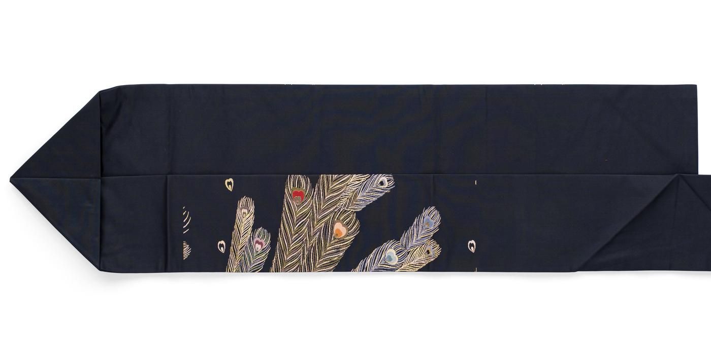 金と銀の孔雀の羽を織り出した九寸名古屋帯です。