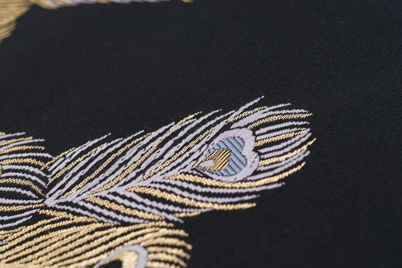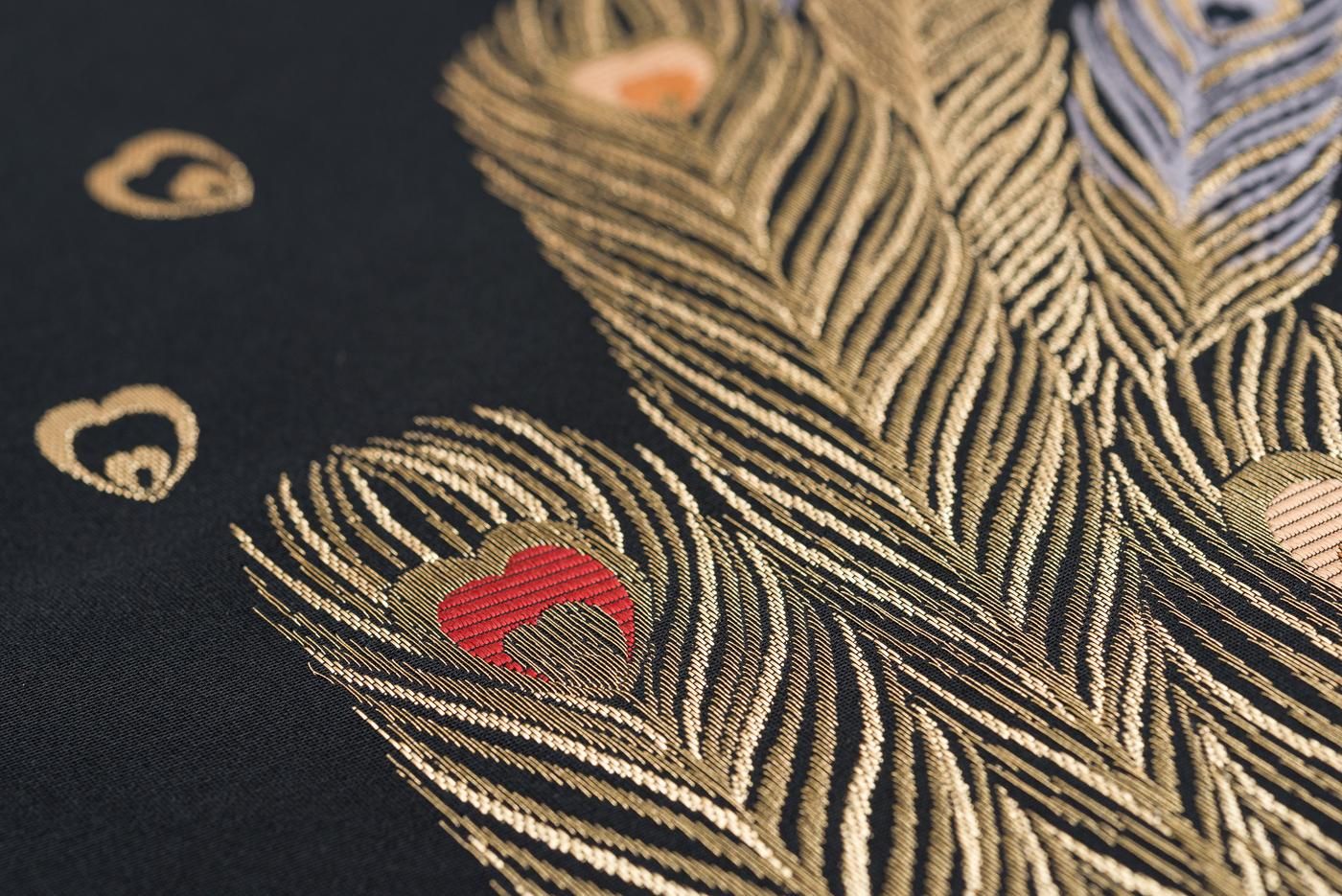 黒の地にきらりと輝く羽が浮かび上がるエレガントなデザインです。