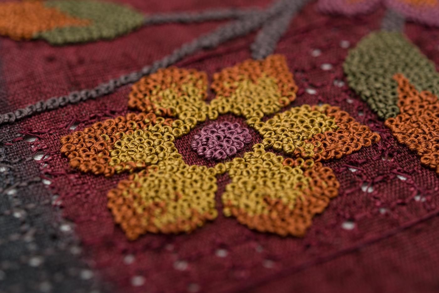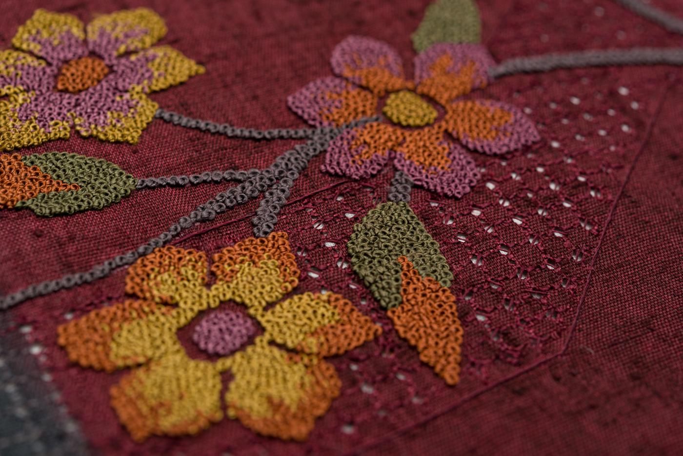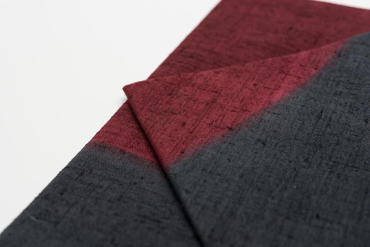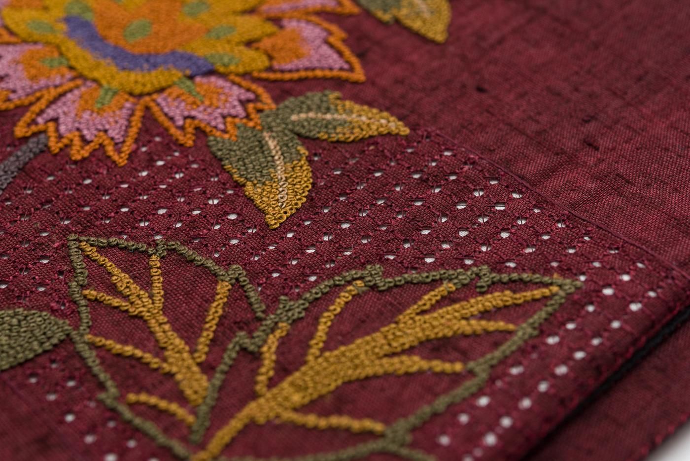 深い赤紫とグレーのツートン地に汕頭刺繍の花模様が広がる九寸名古屋帯です。