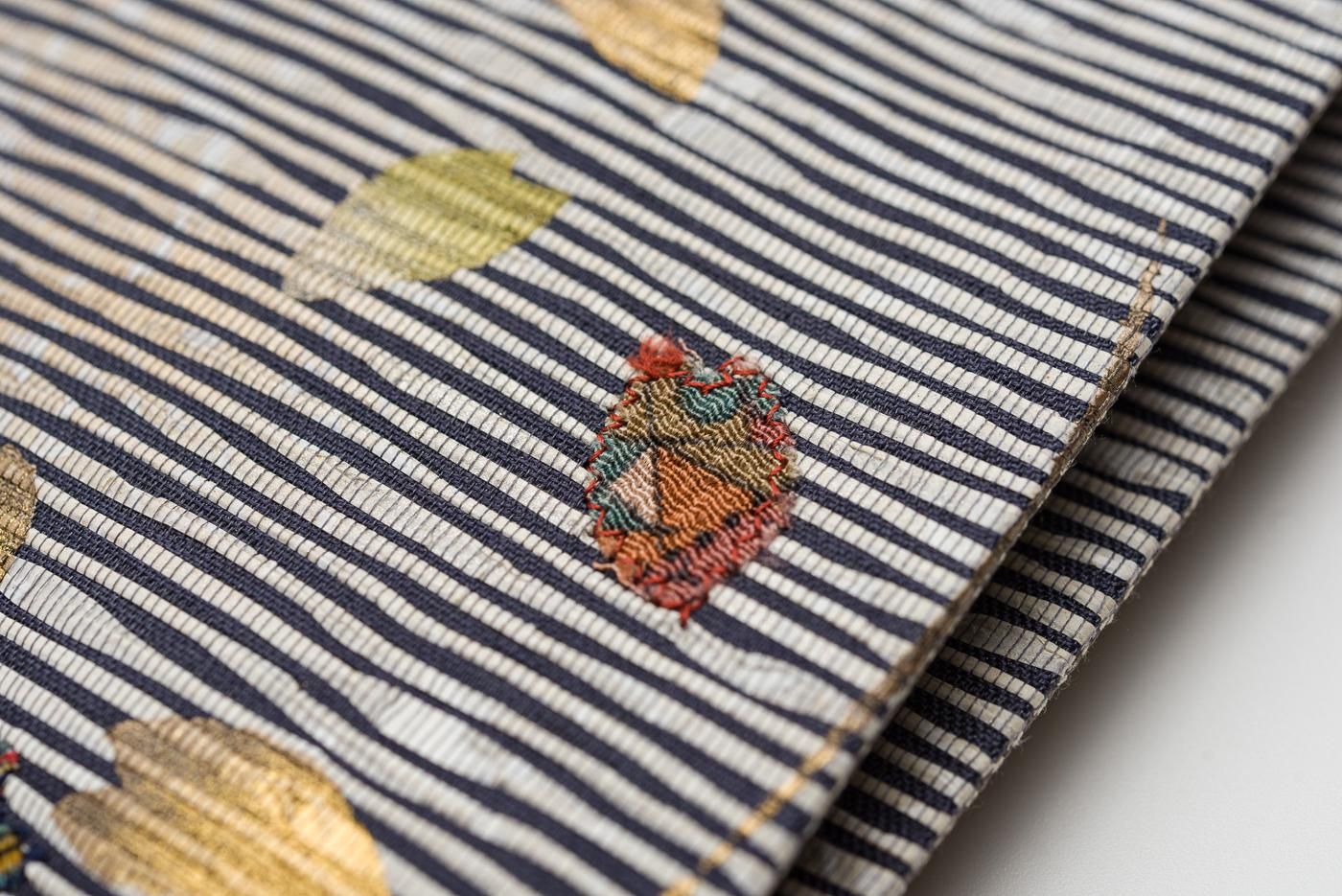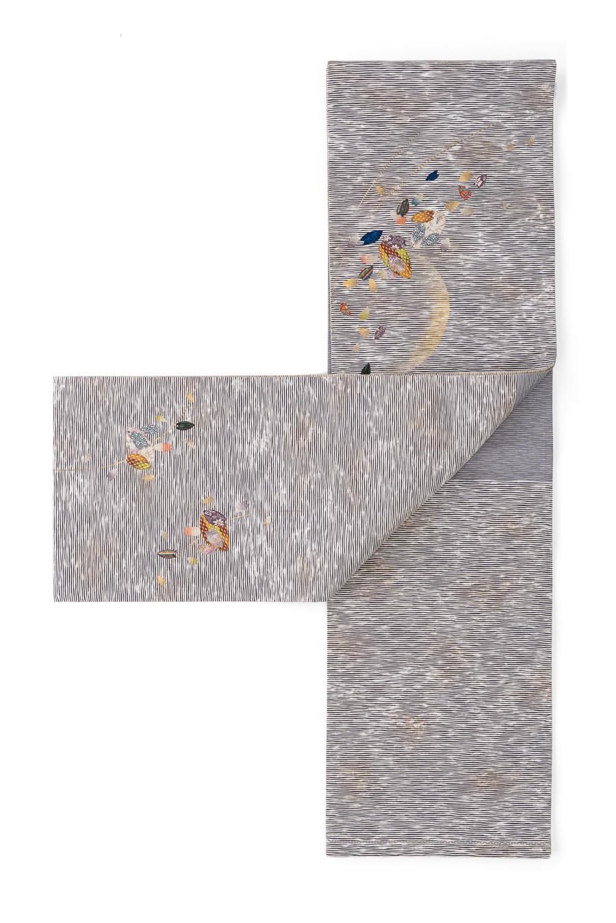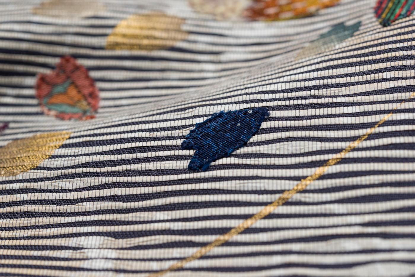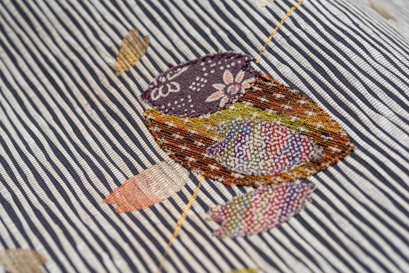 月を背景に桜の花びらをパッチワーク刺繍した洒落袋帯です。