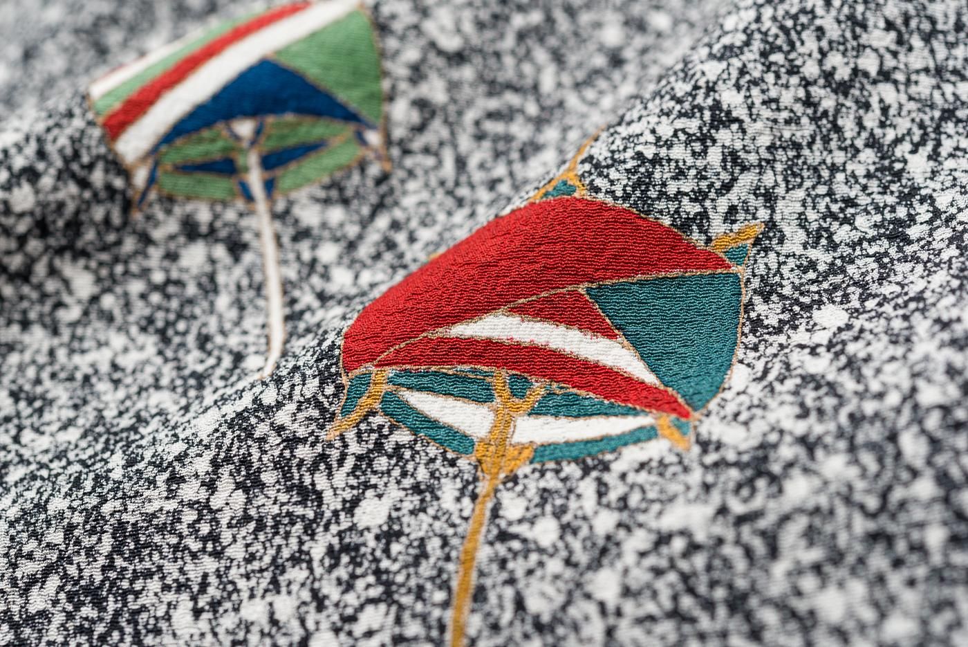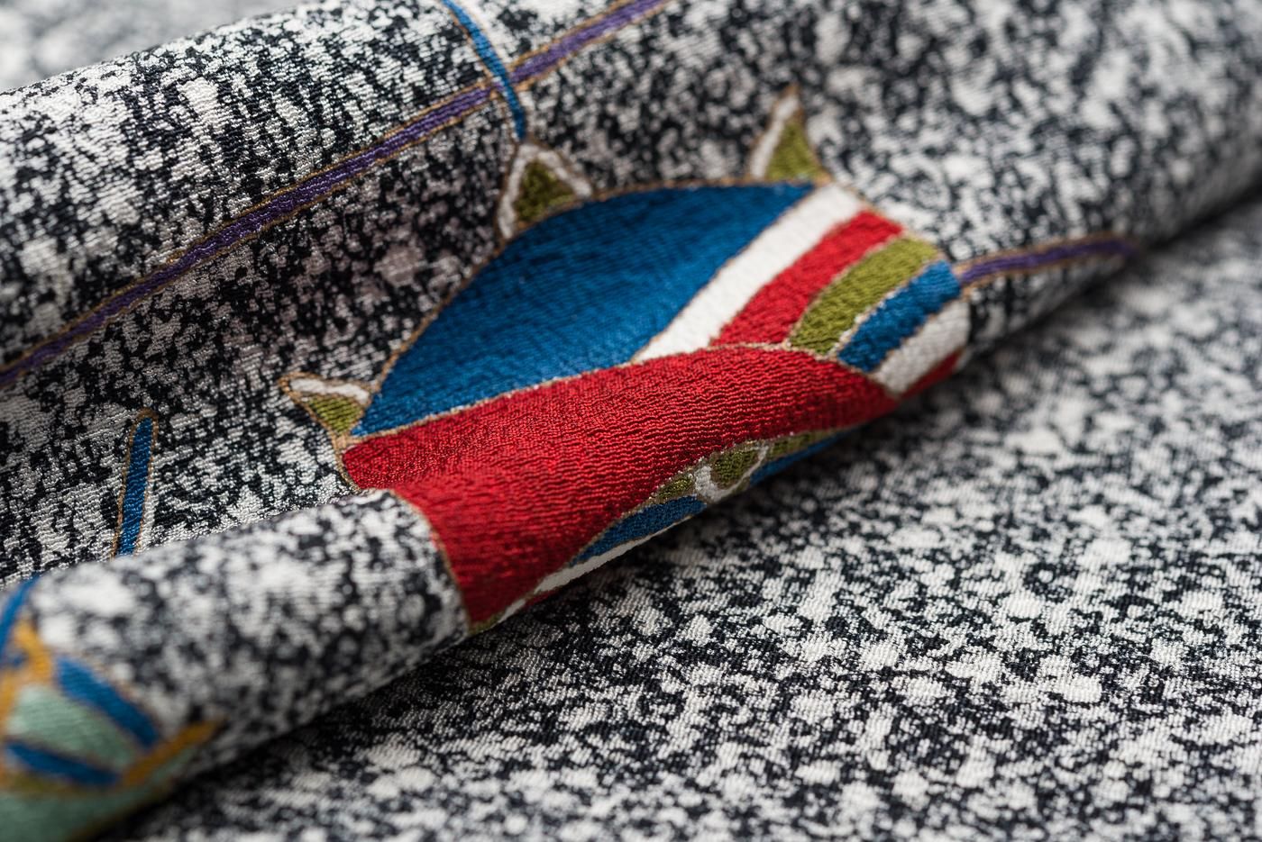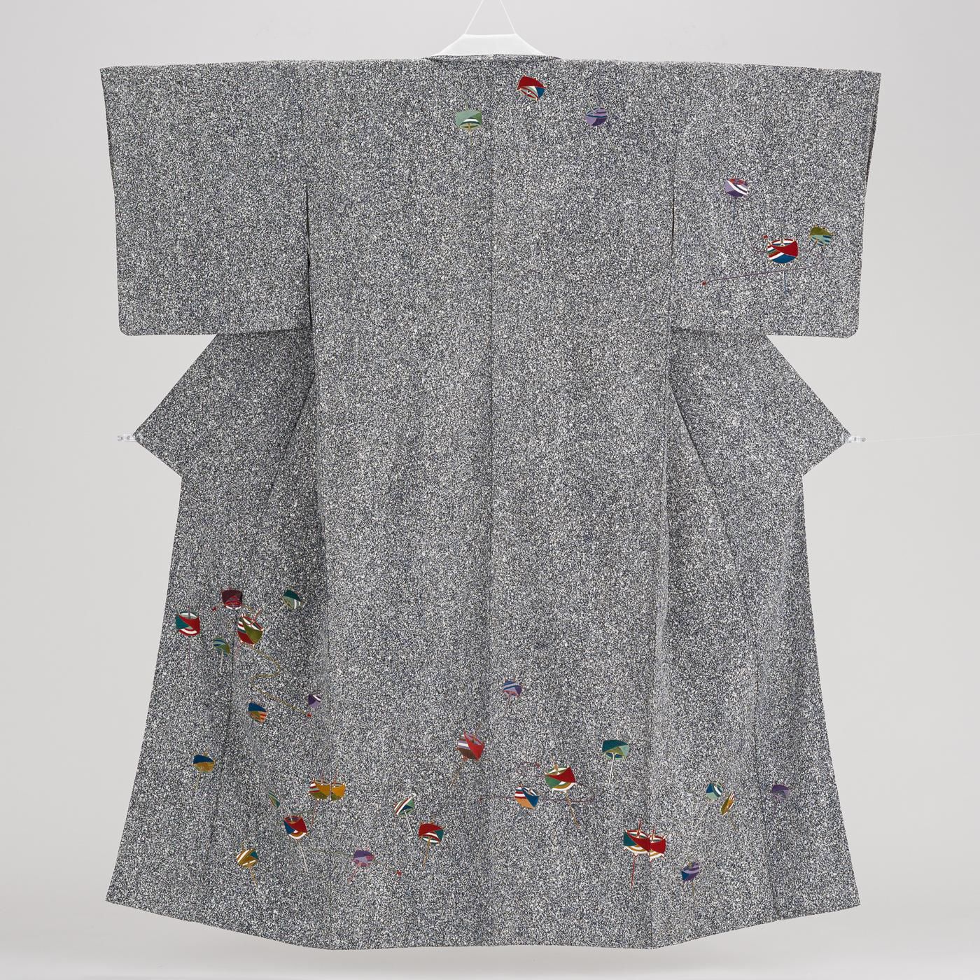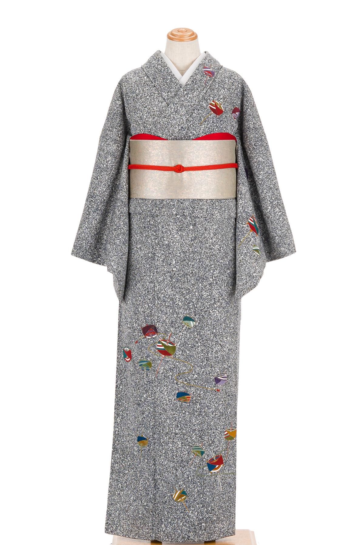モノトーンカラーの叩き染めに糸巻きの柄を添えた付下げ訪問着です。