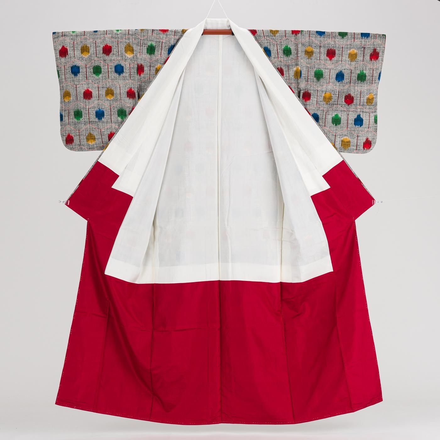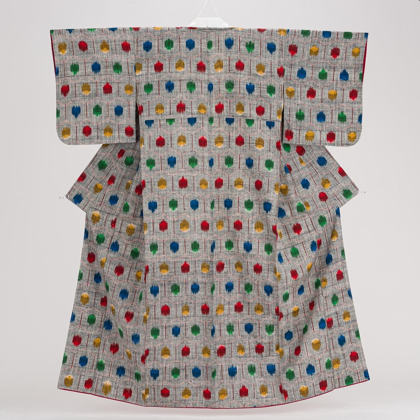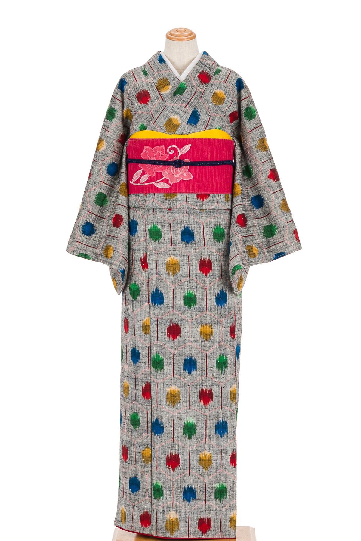 亀甲にカラフルな水玉模様を閉じ込めた紬の着物です。