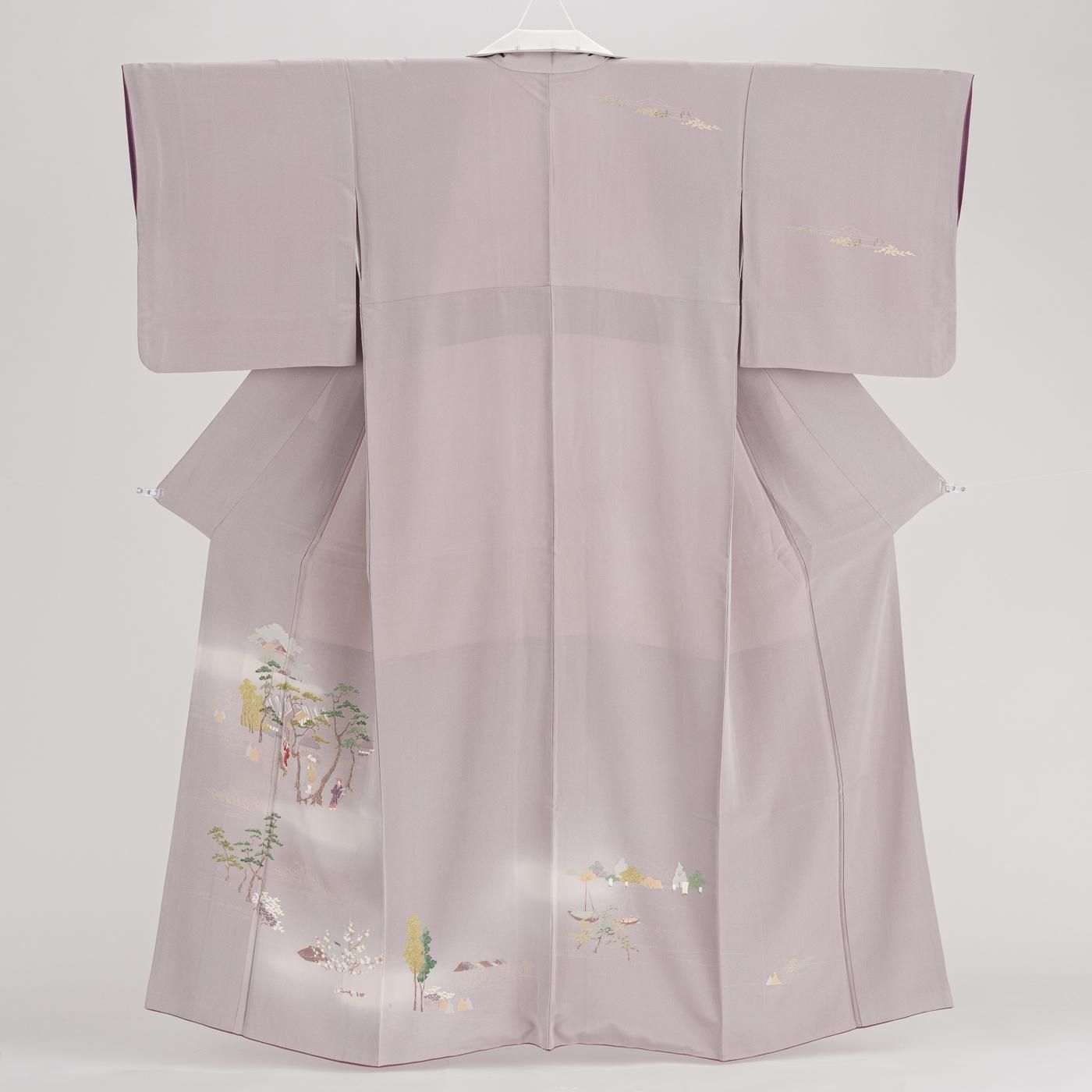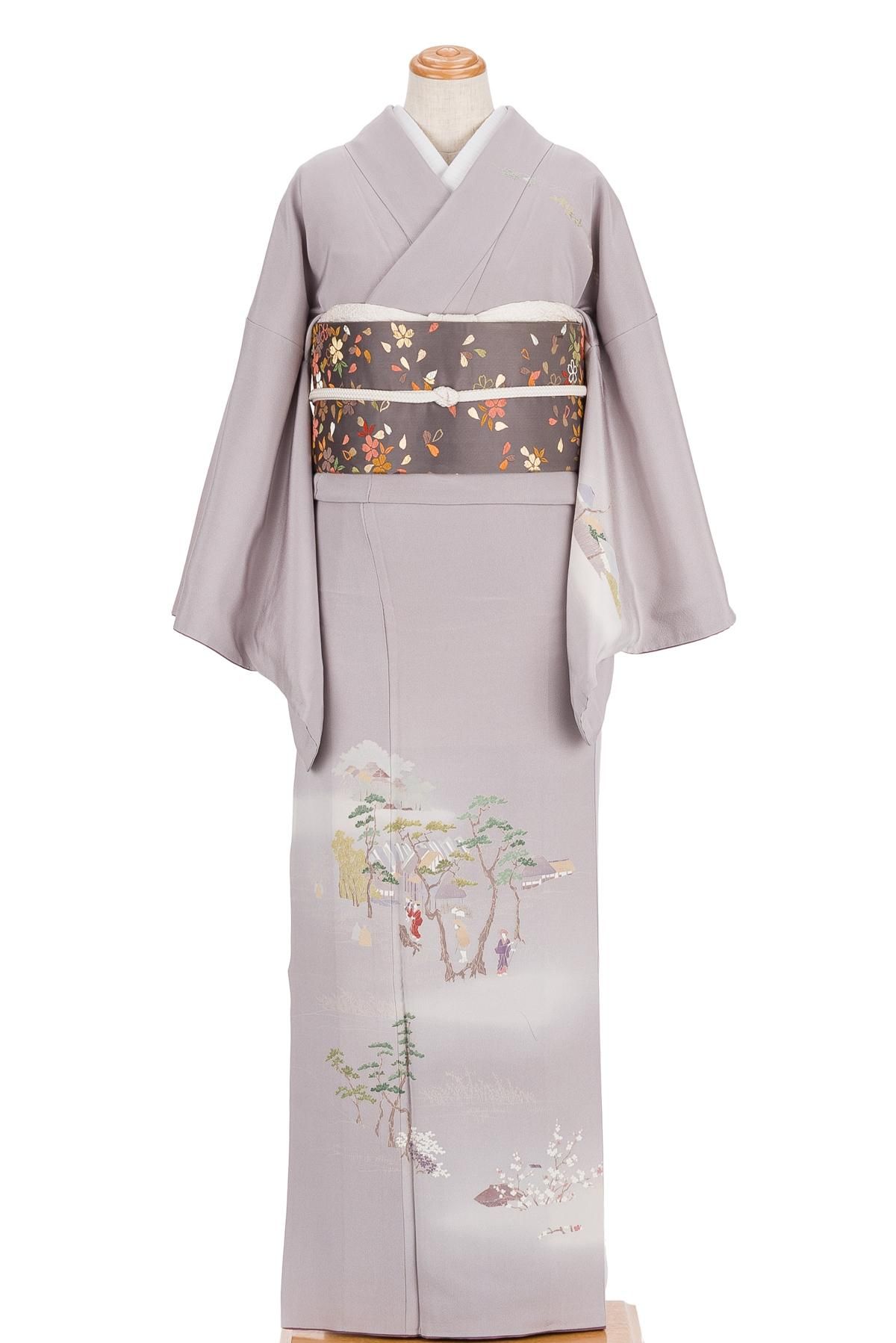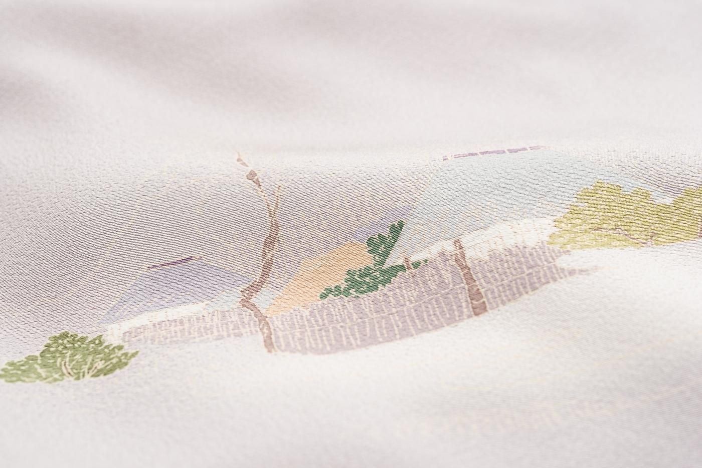 淡い藤鼠色の地に町屋風景を描いた手描き友禅の訪問着です。