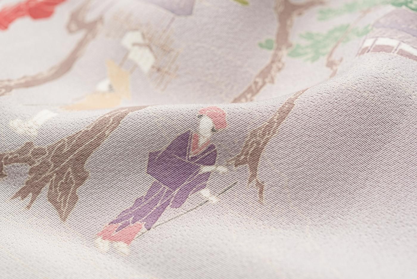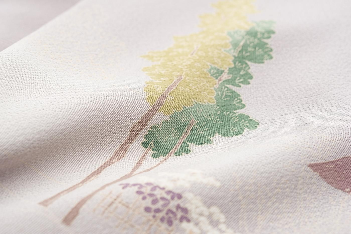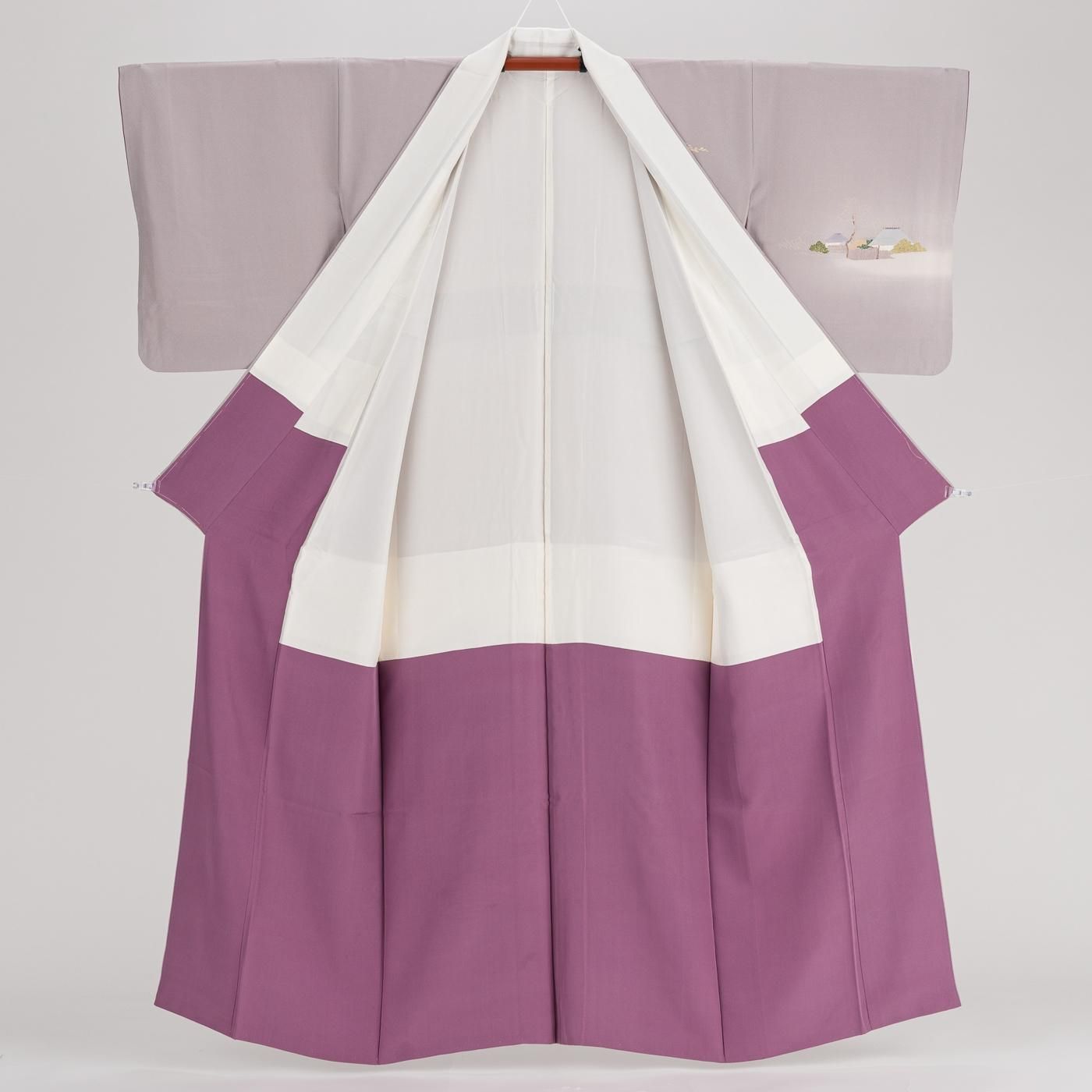 淡い藤鼠色の地に町屋風景を描いた手描き友禅の訪問着です。