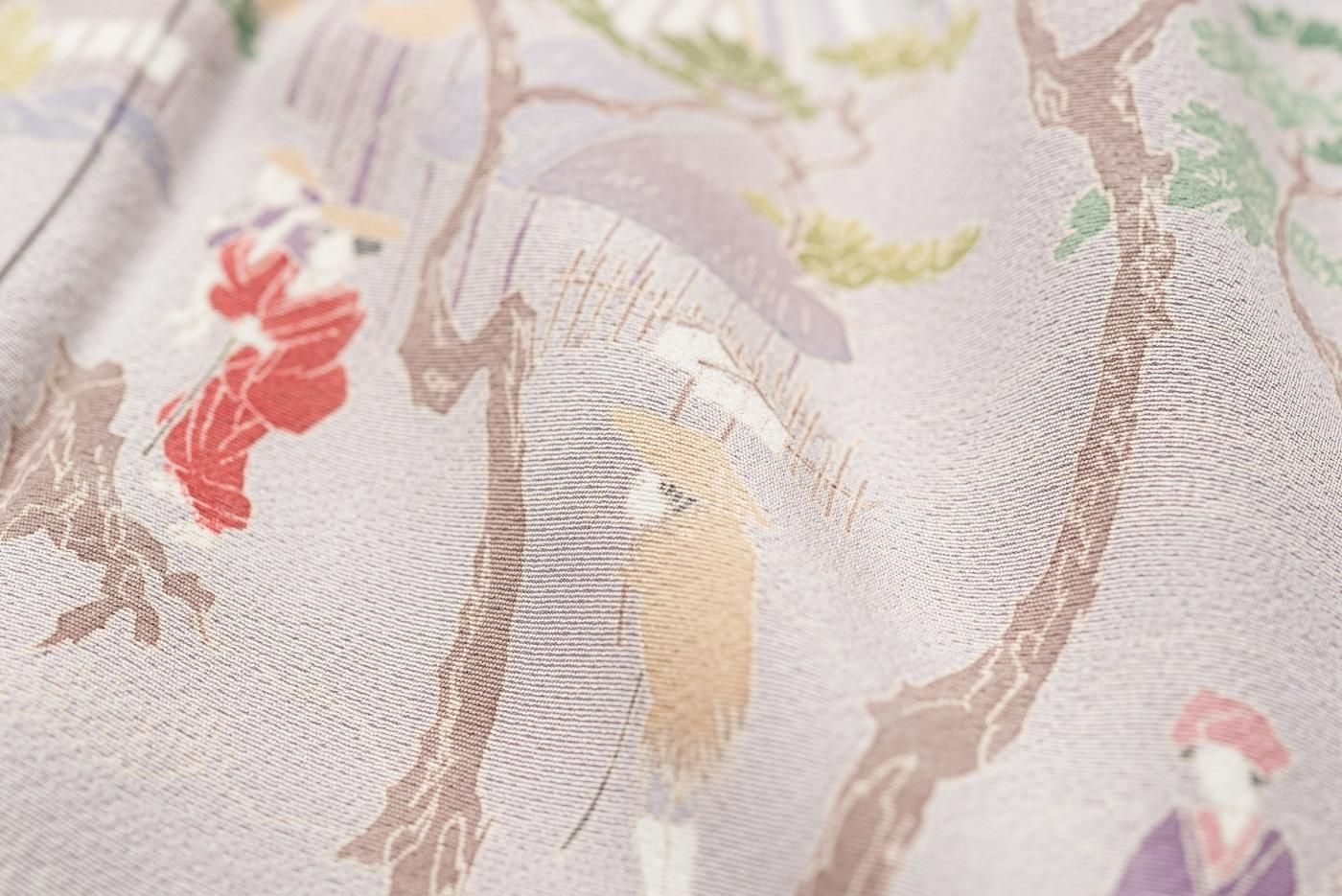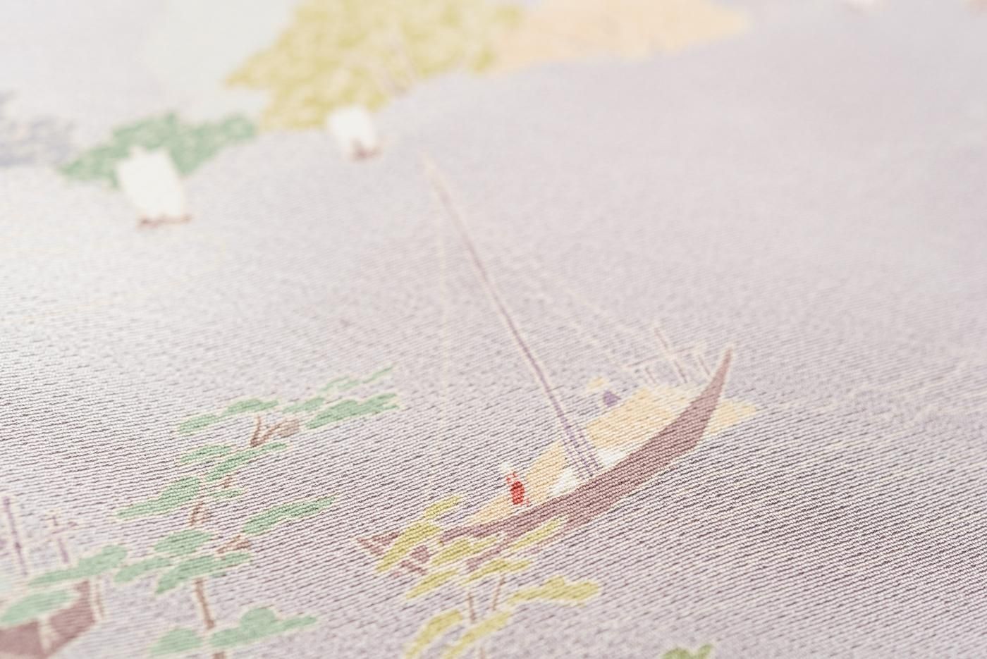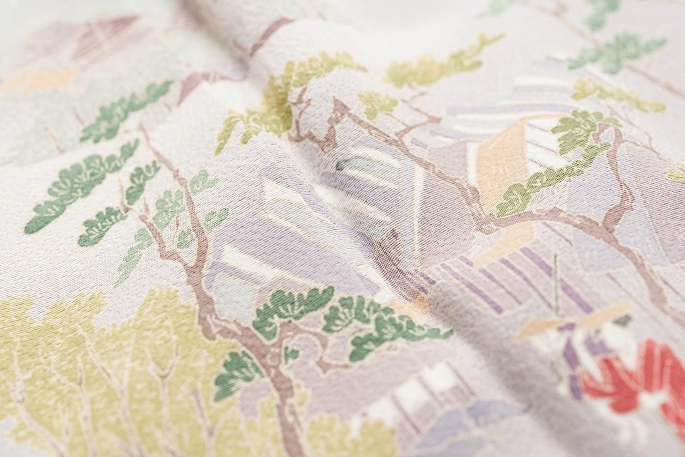 町屋や松の木の傍を歩く人々や荷を積んだ船などが細かく描かれた美しい着物です。