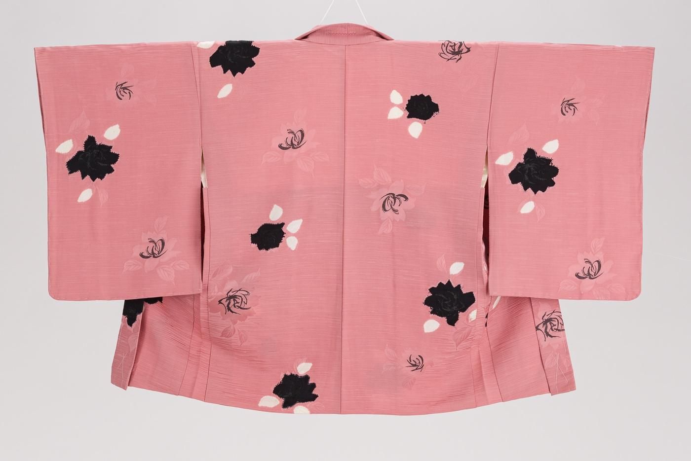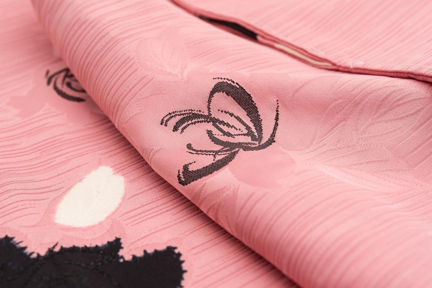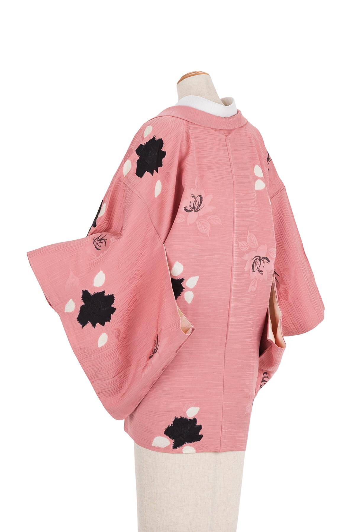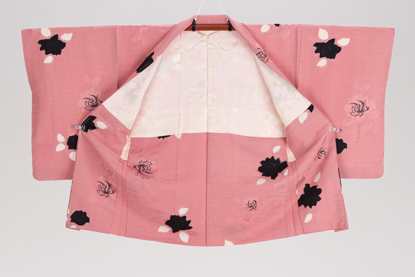 ピンク色の地に薔薇の花を織り出したセミアンティークの羽織です。