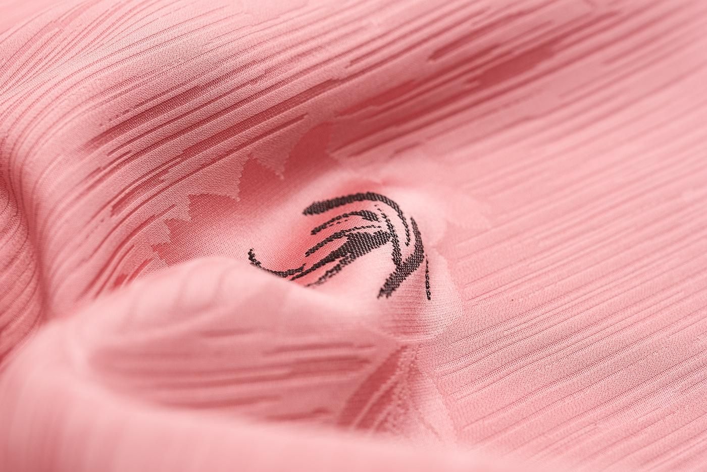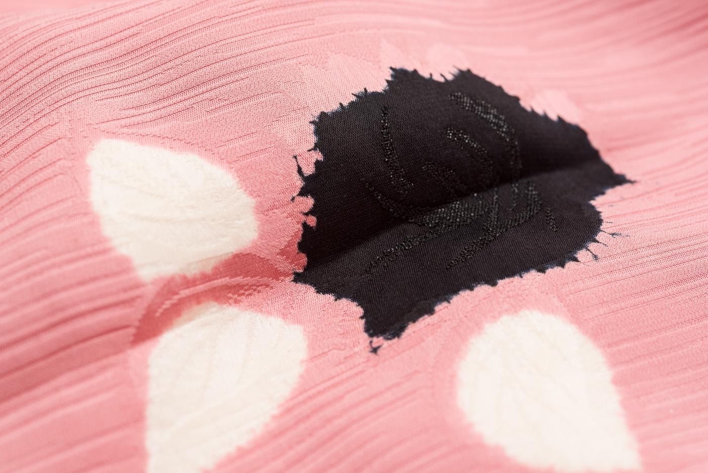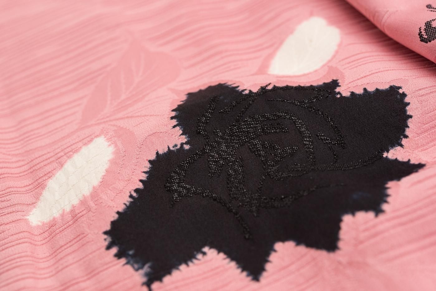 織りの上から絞りで黒く花を染めた凝ったデザインになっています。