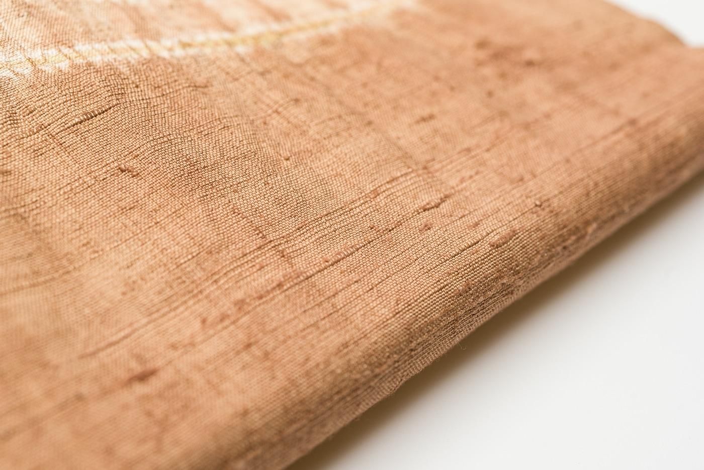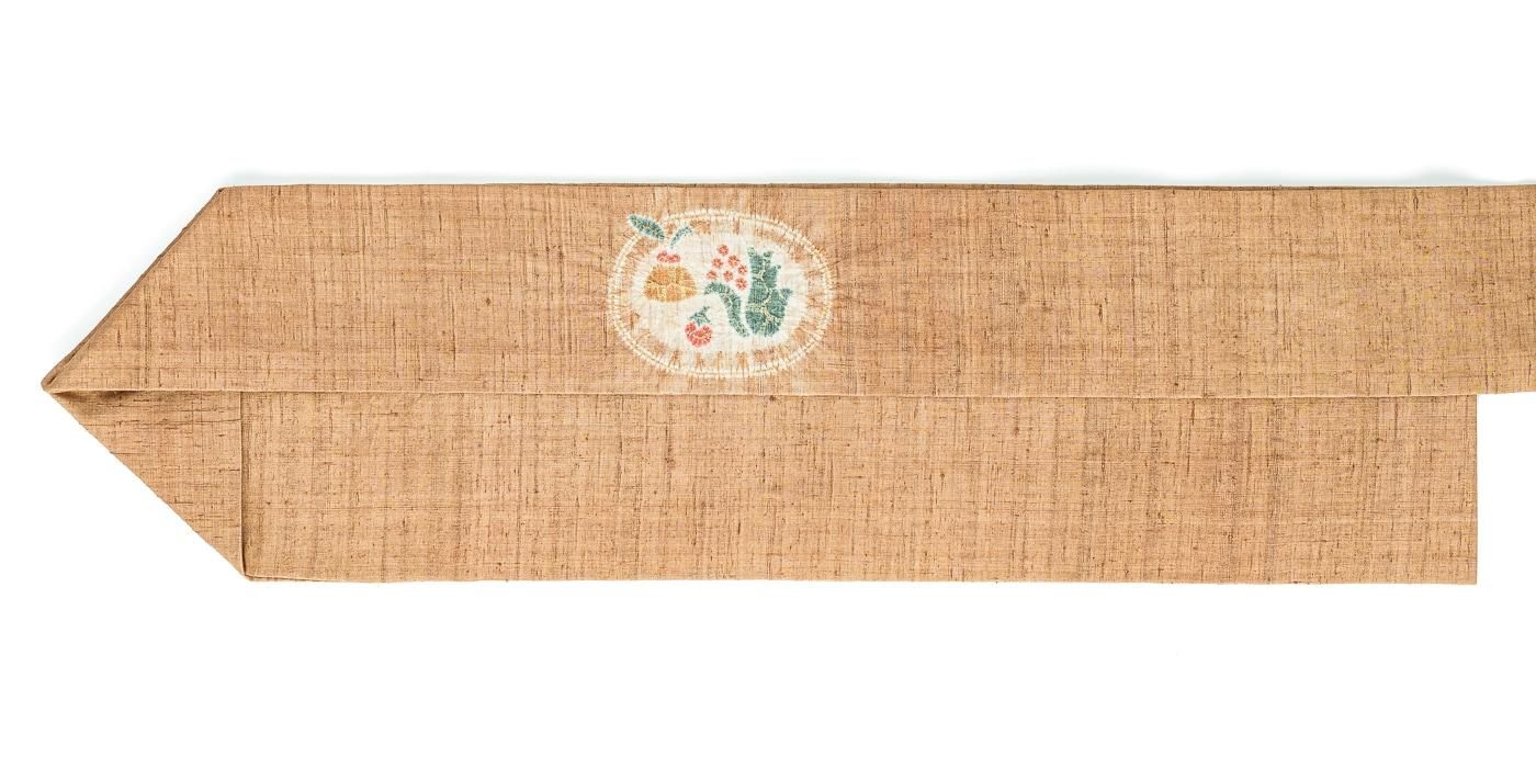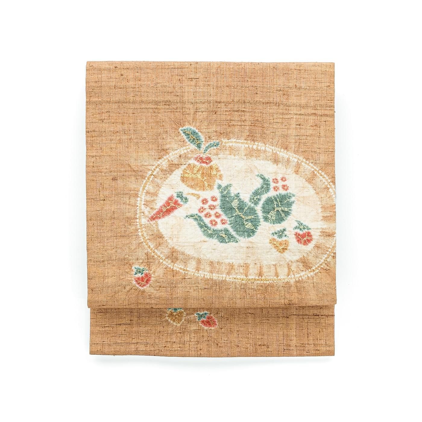 ざっくりと織られた紬地に野菜の柄を絞り染めした九寸名古屋帯です。