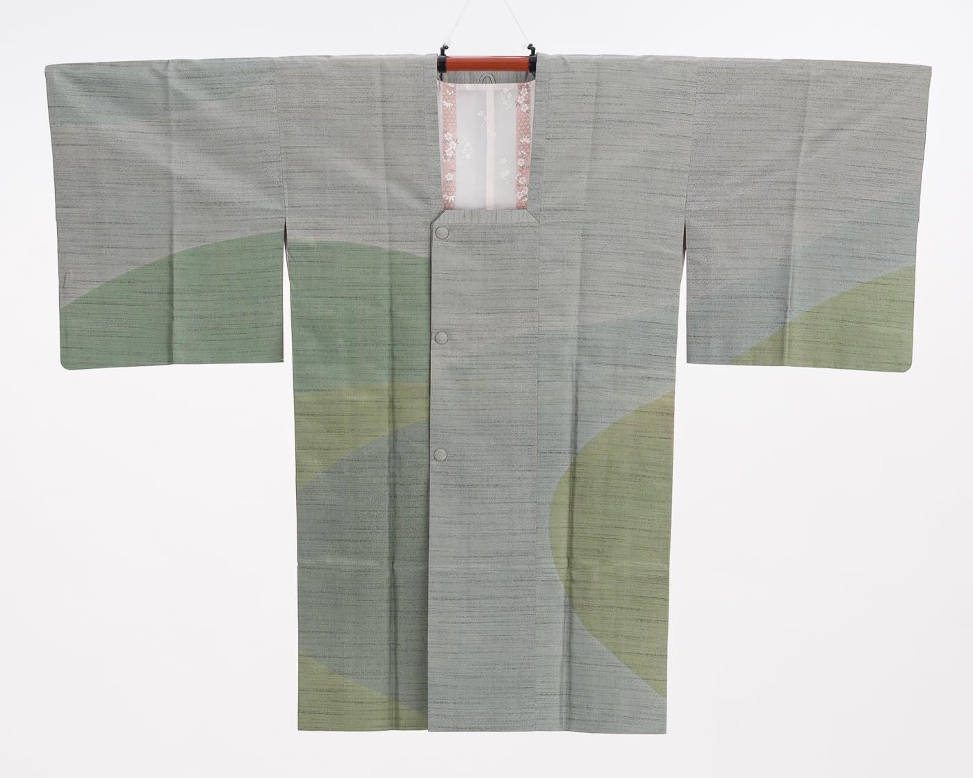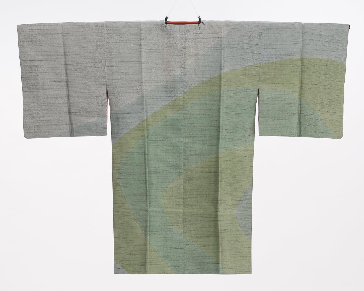 緑を基調にゆったりとした円のようなラインを染めた道行コートです。