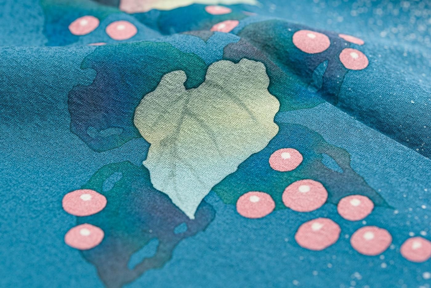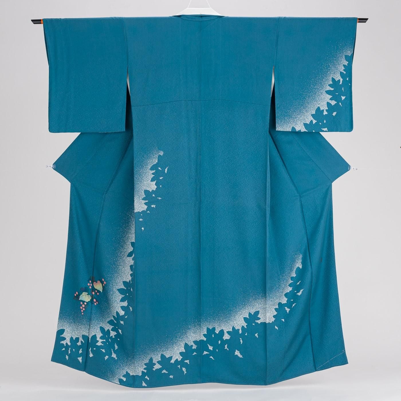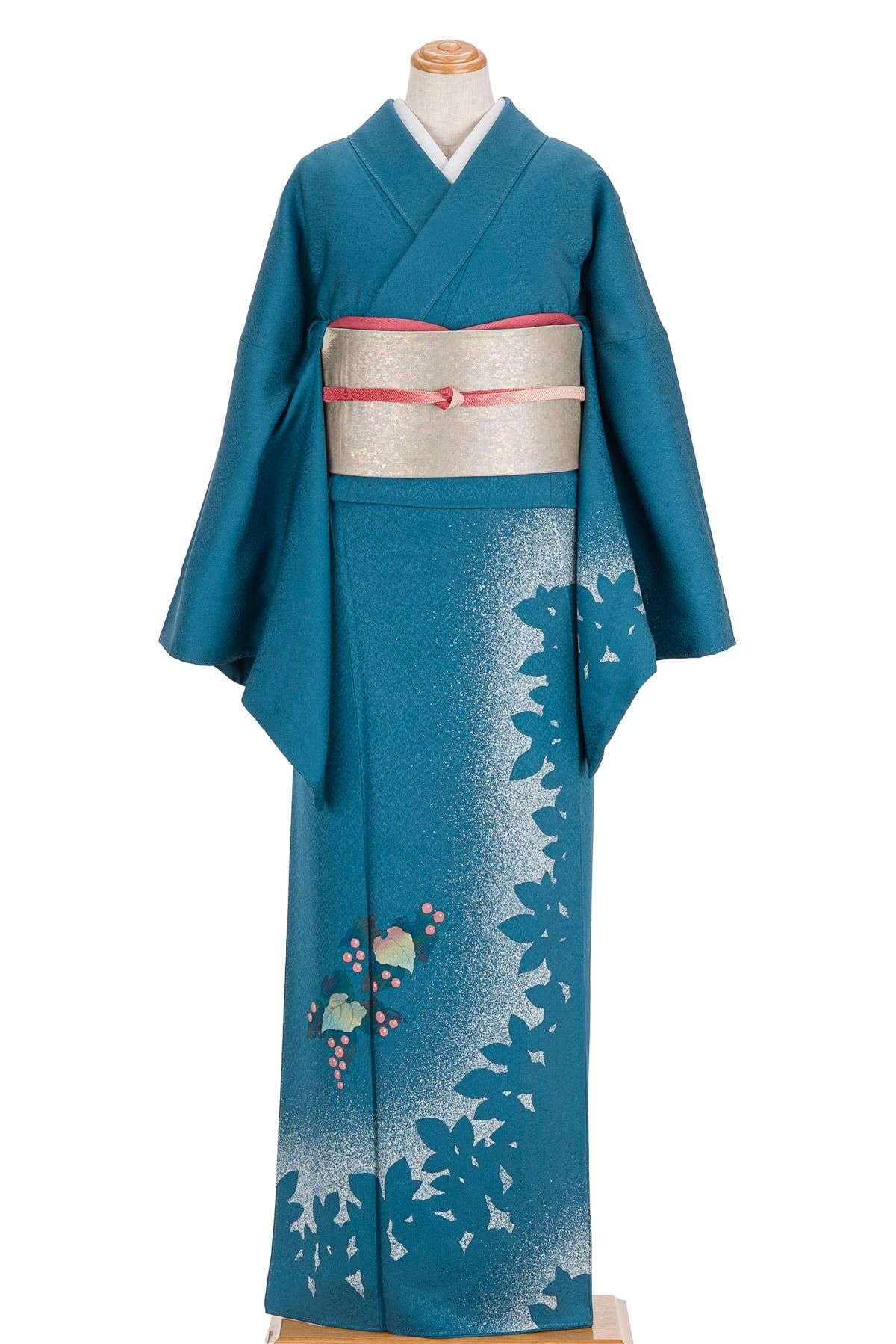 鮮やかなピーコックブルーの地に葉のシルエットとピンク色の実を描いた付下げです。